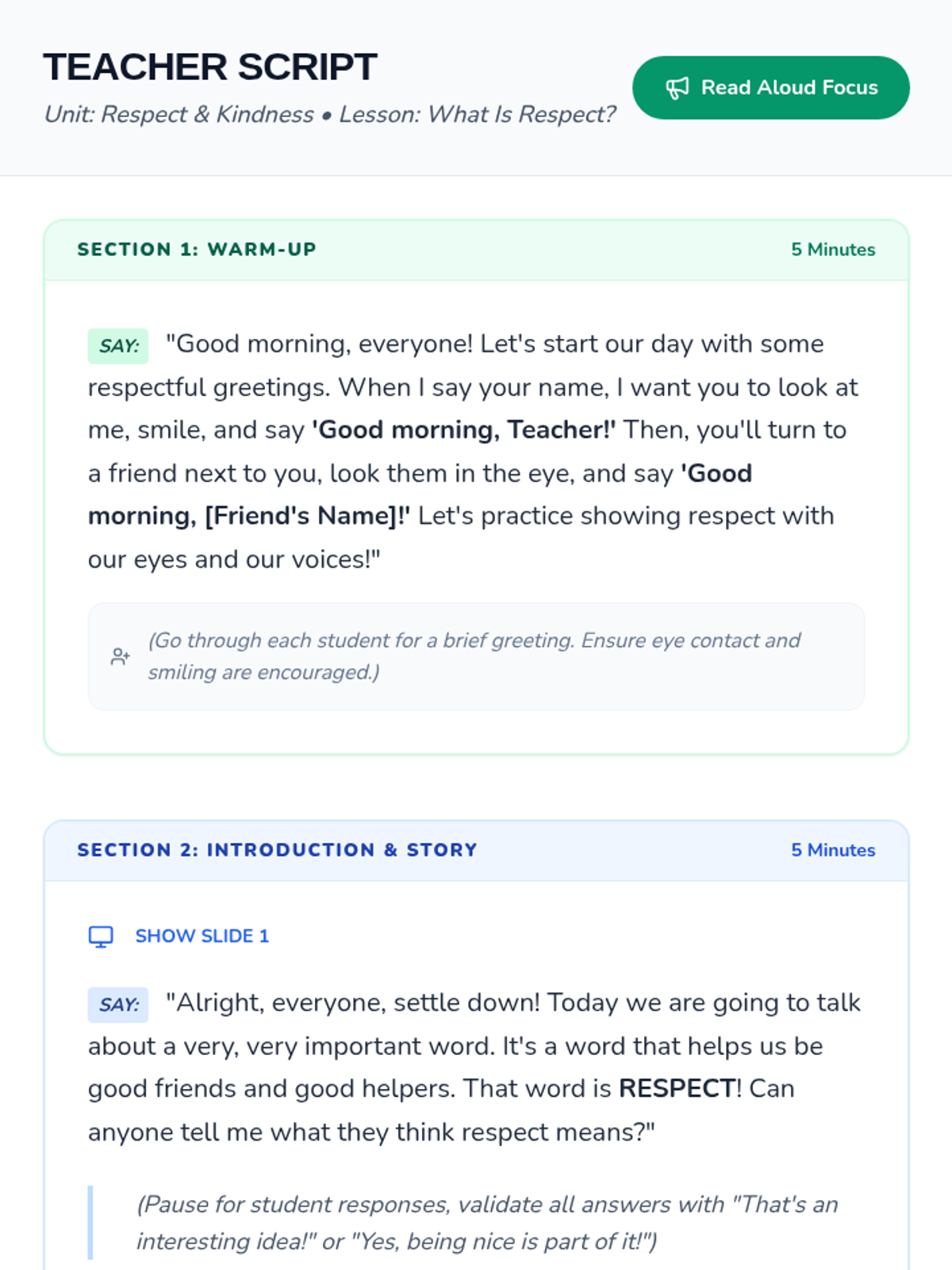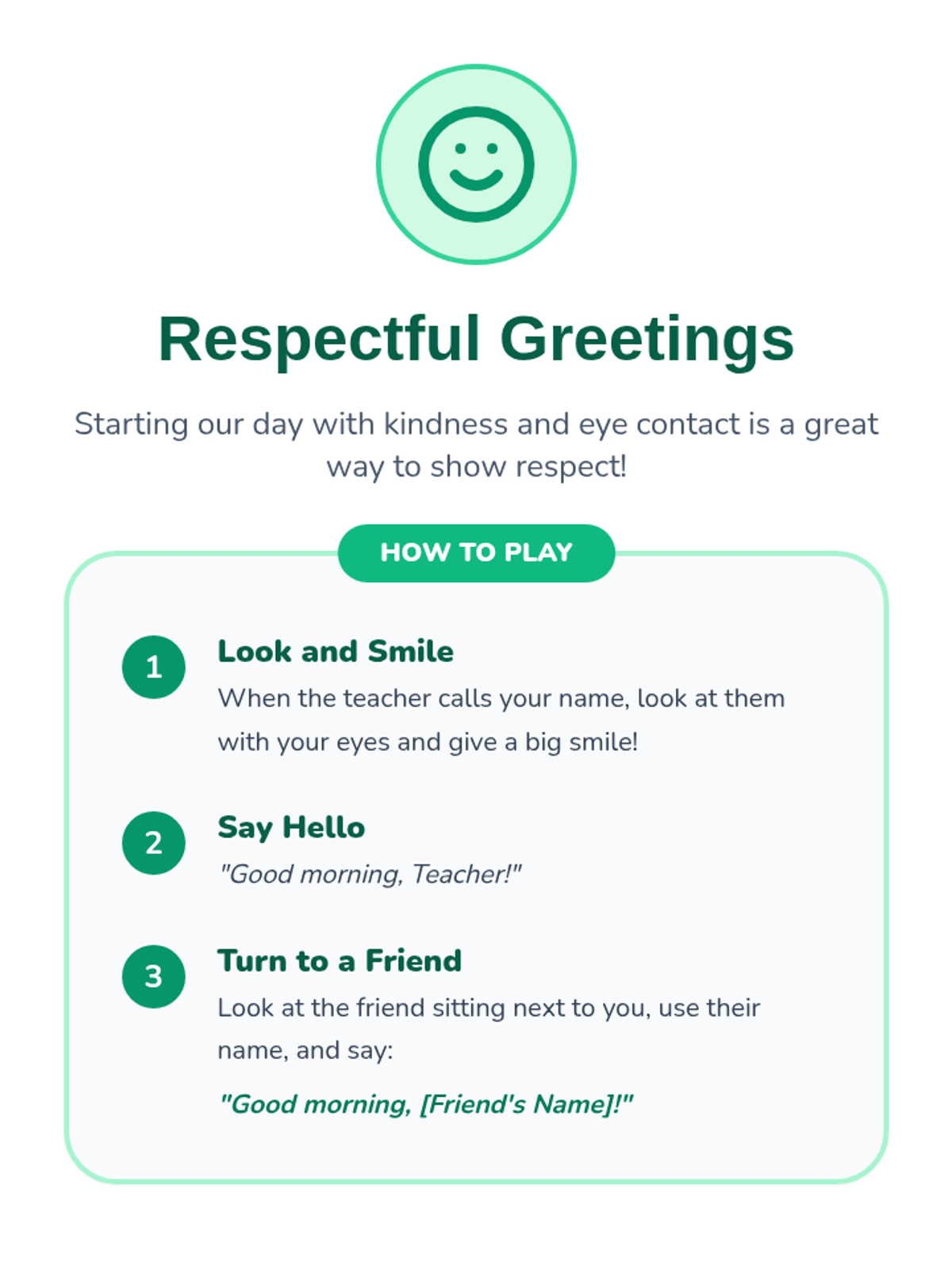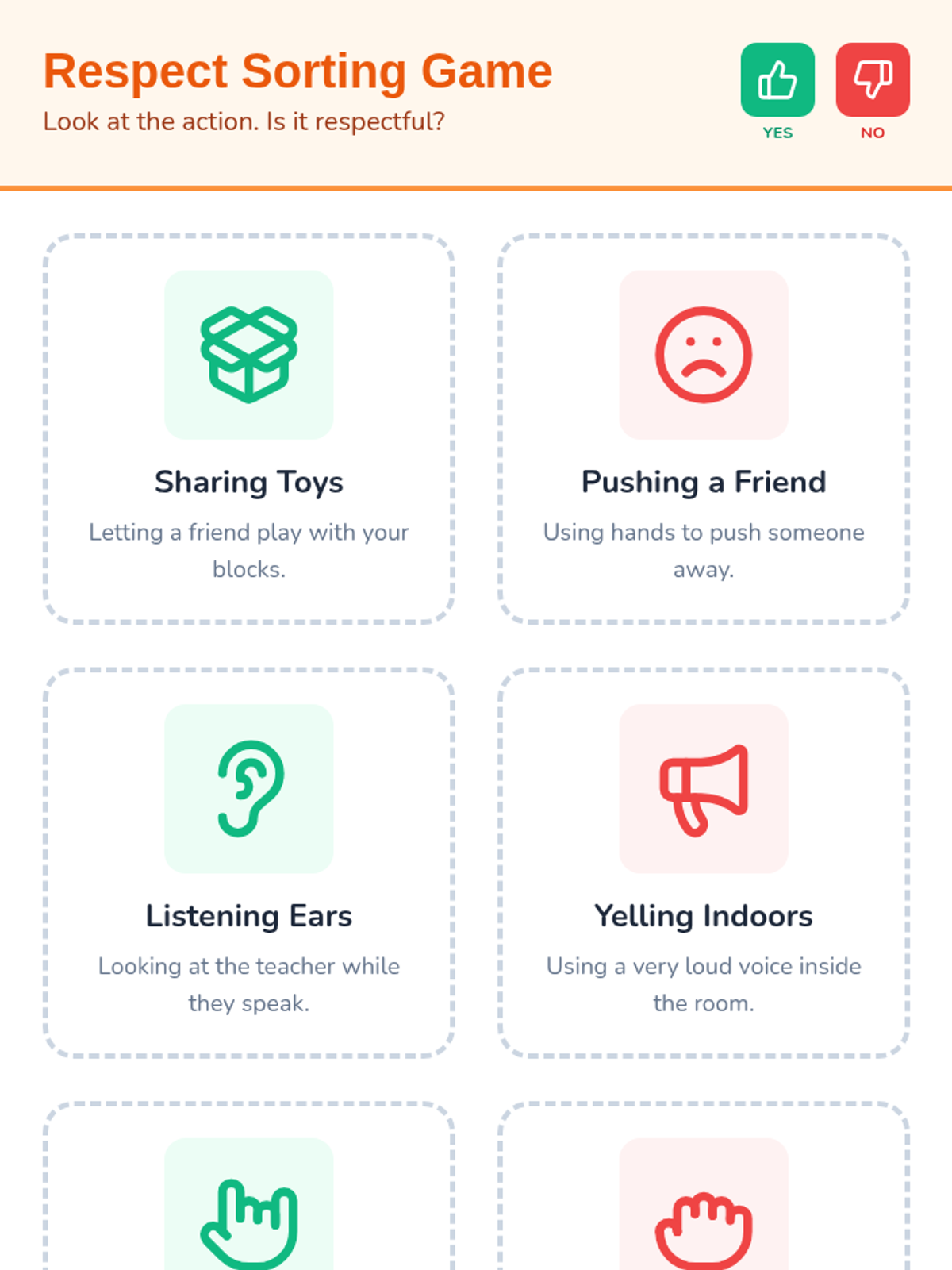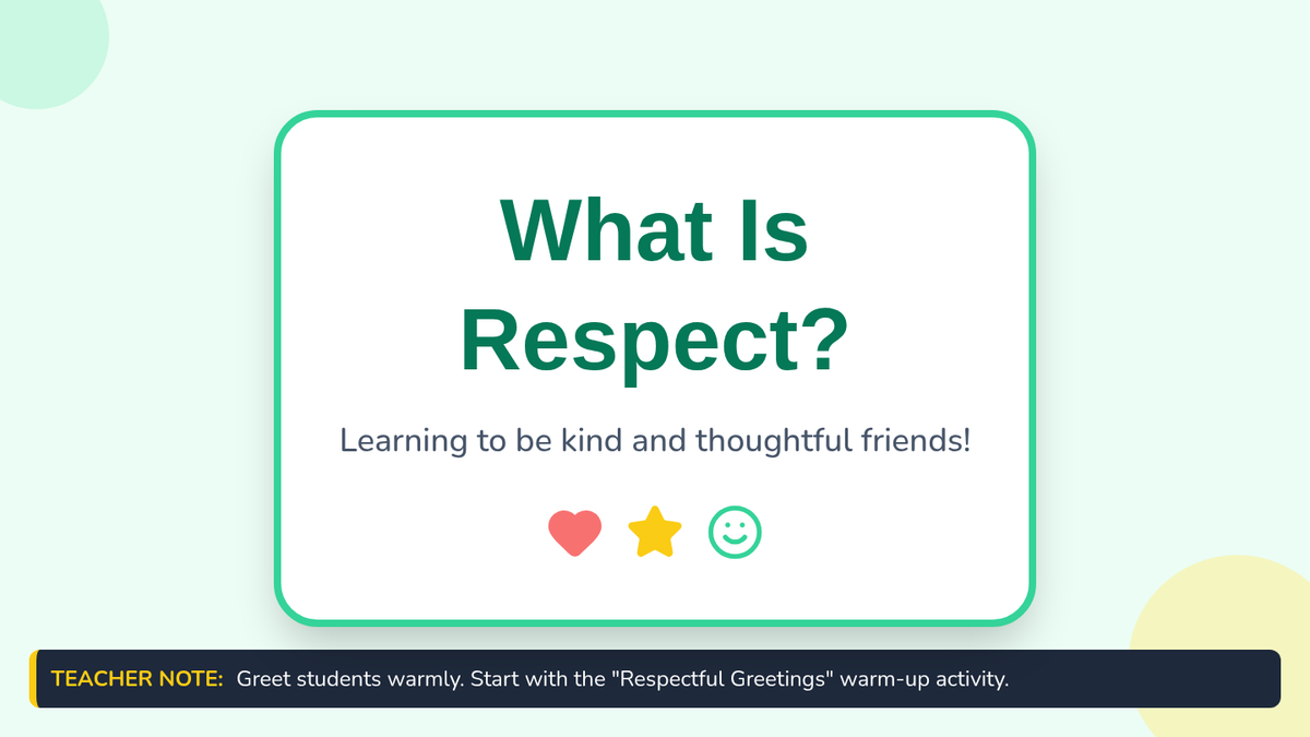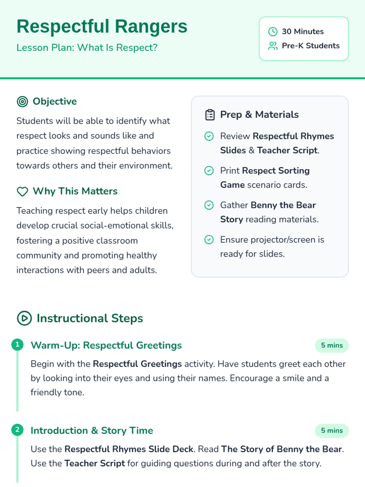 A 30-minute Pre-K lesson that introduces the concept of respect through storytelling, interactive discussion, and a hands-on sorting game. Students learn to identify and practice respectful behaviors in their daily classroom environment.