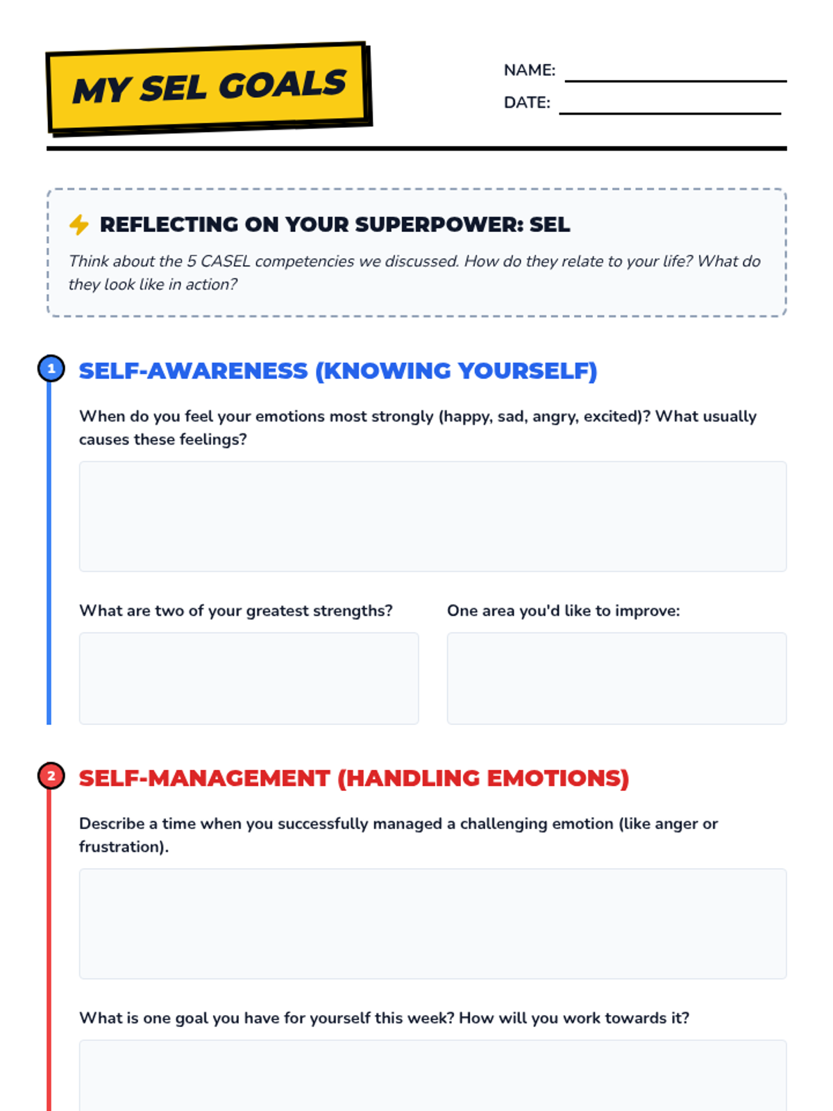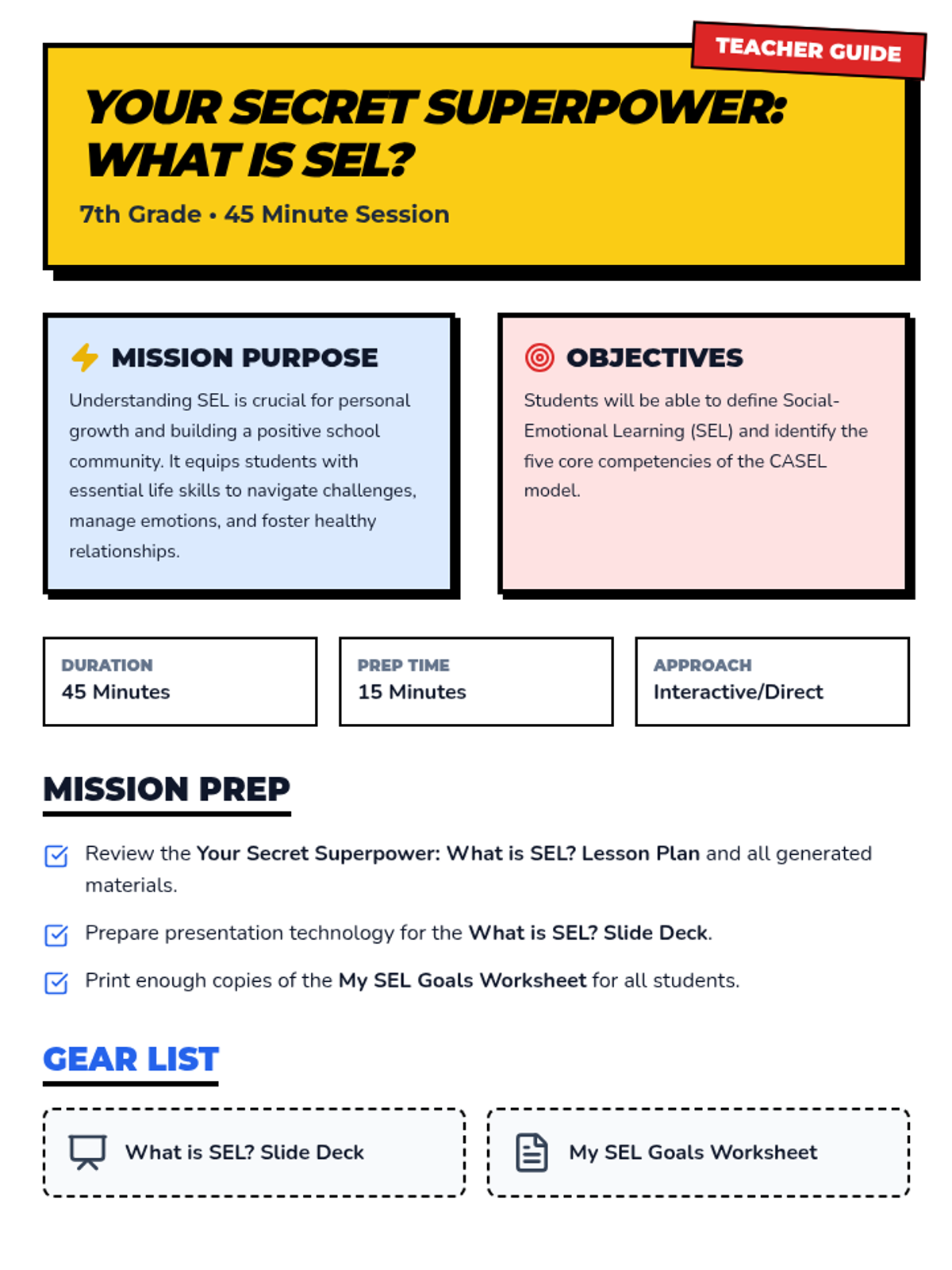 This lesson introduces 7th-grade students to Social-Emotional Learning (SEL) and the five core CASEL competencies using a superhero theme. Students explore self-awareness, self-management, social awareness, relationship skills, and responsible decision-making to unlock their personal potential.