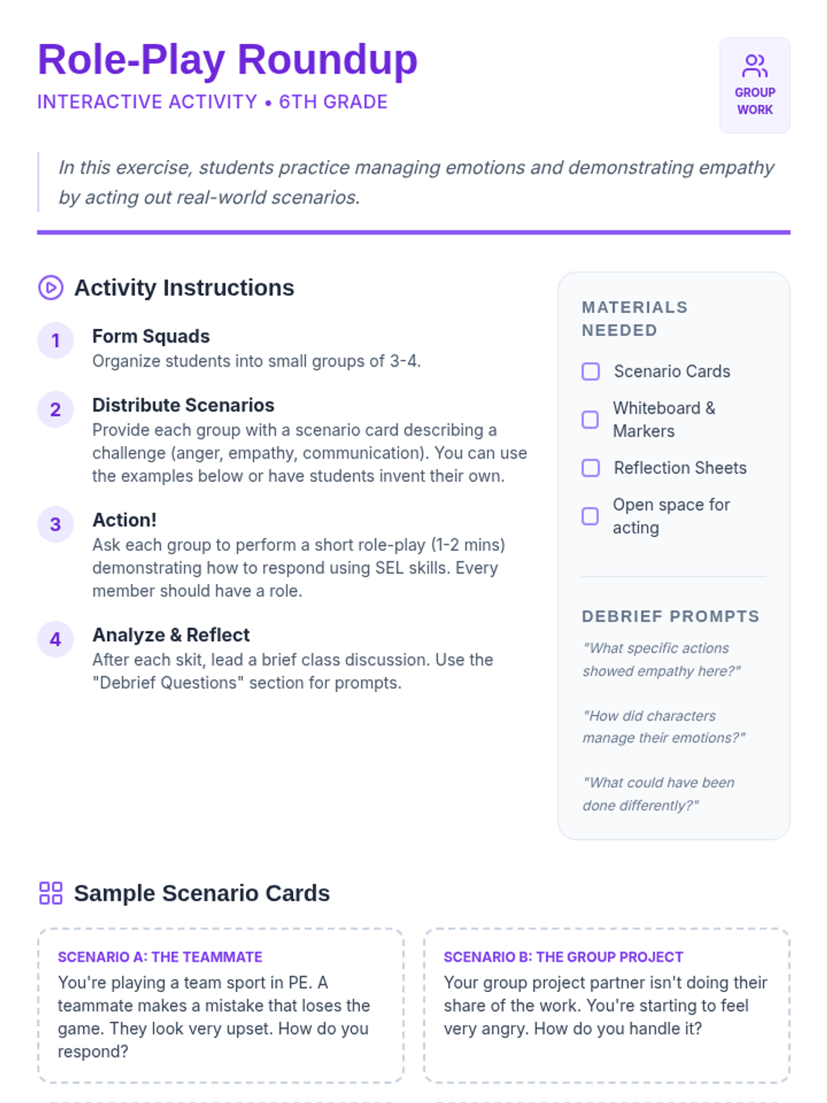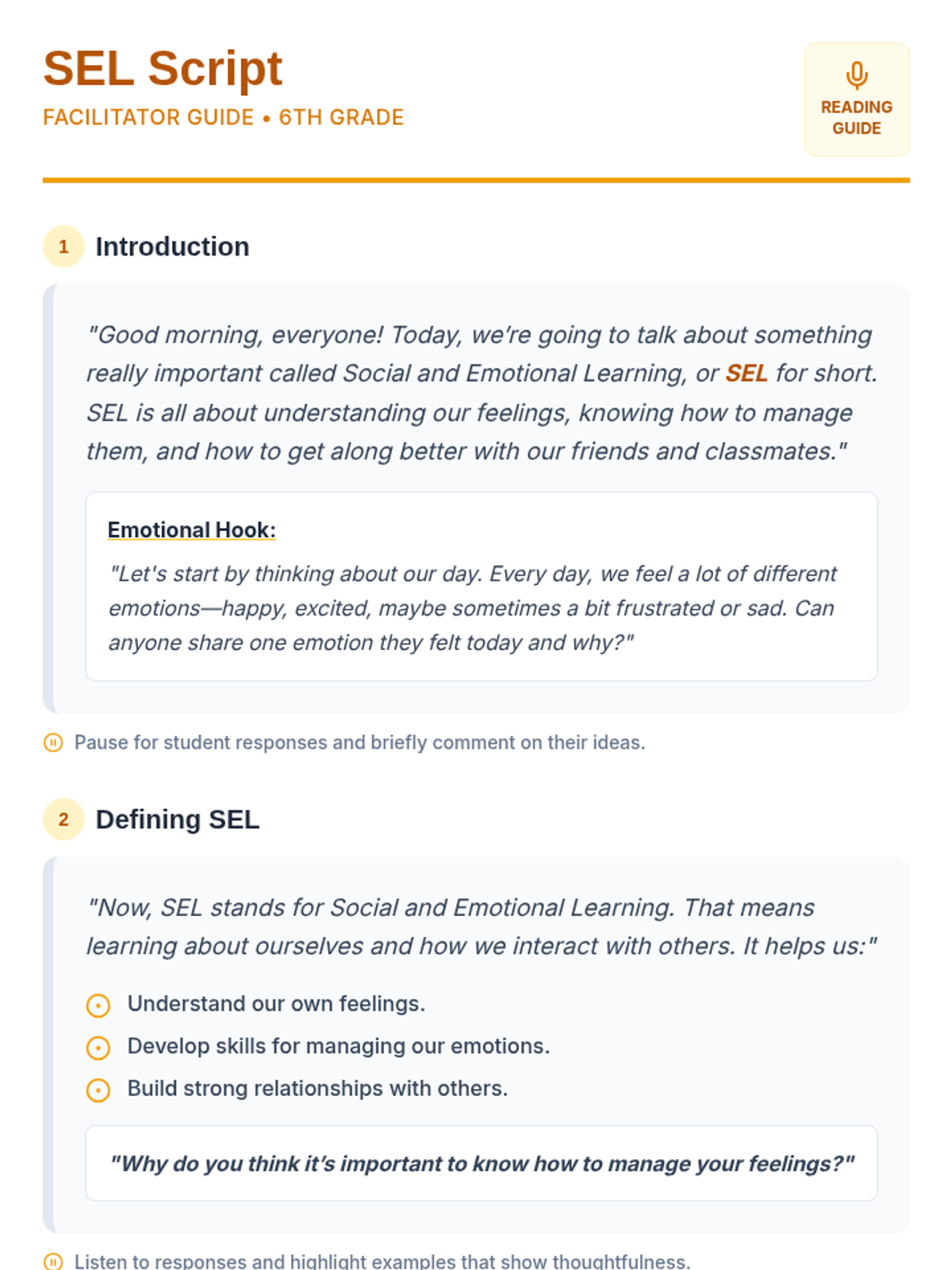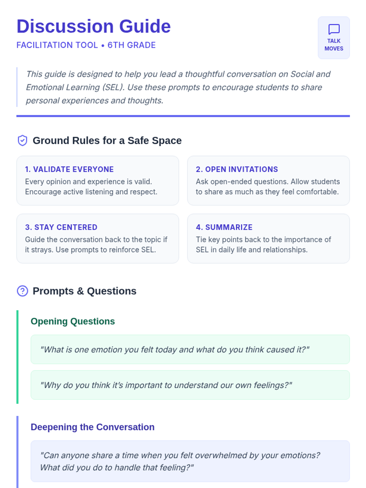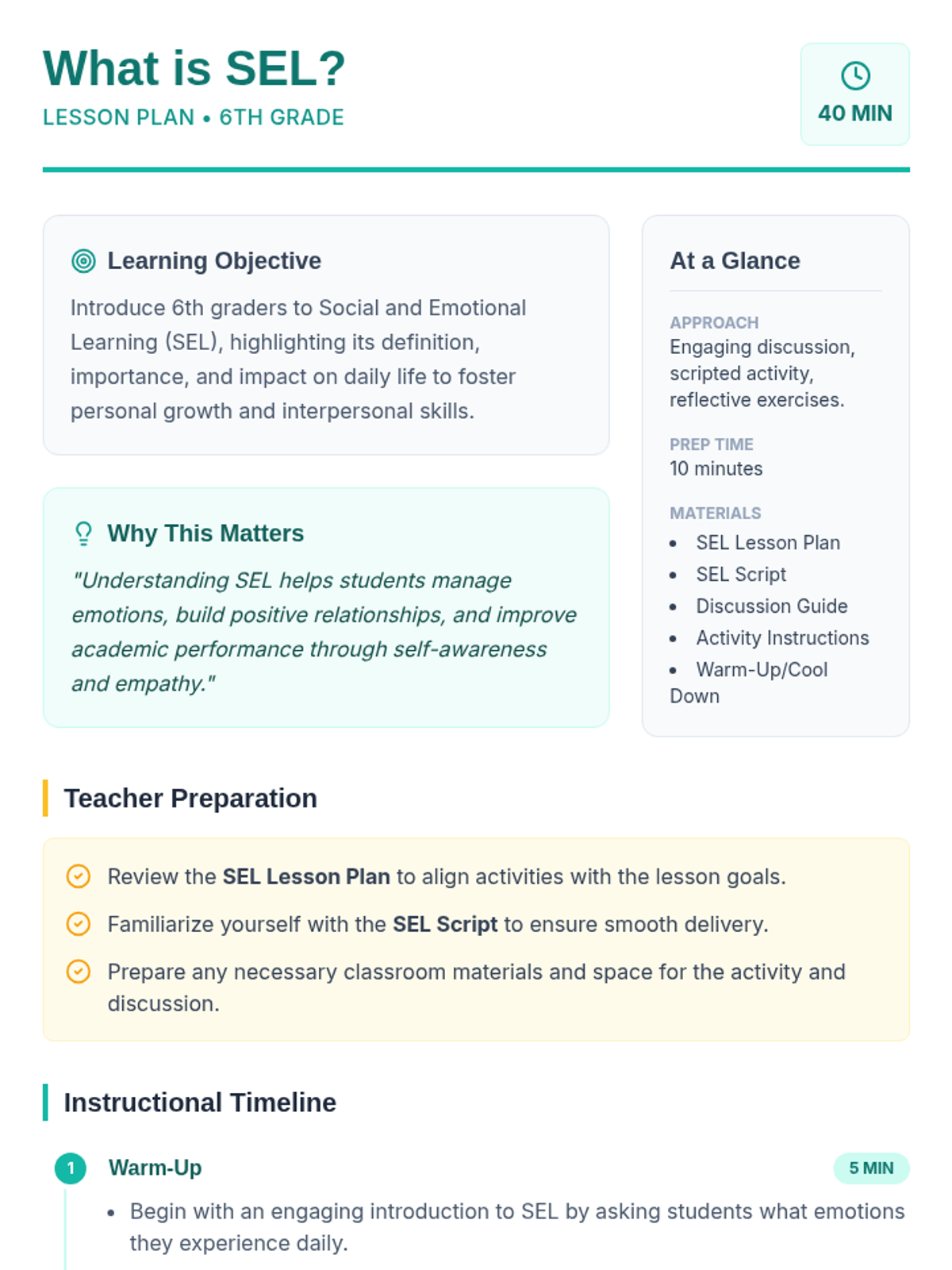 This lesson introduces 6th-grade students to Social and Emotional Learning (SEL), exploring its importance and impact on their daily lives. Through engaging activities and discussions, students will gain a foundational understanding of SEL, which is crucial for their personal growth and interpersonal skills.