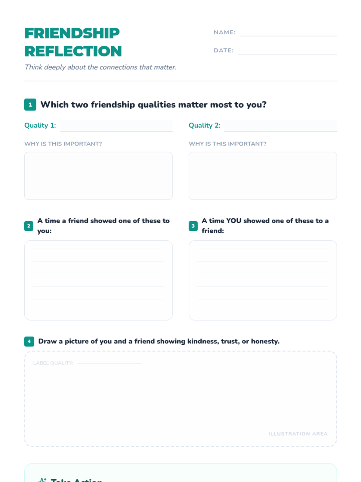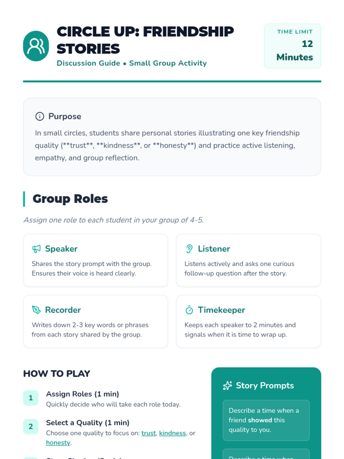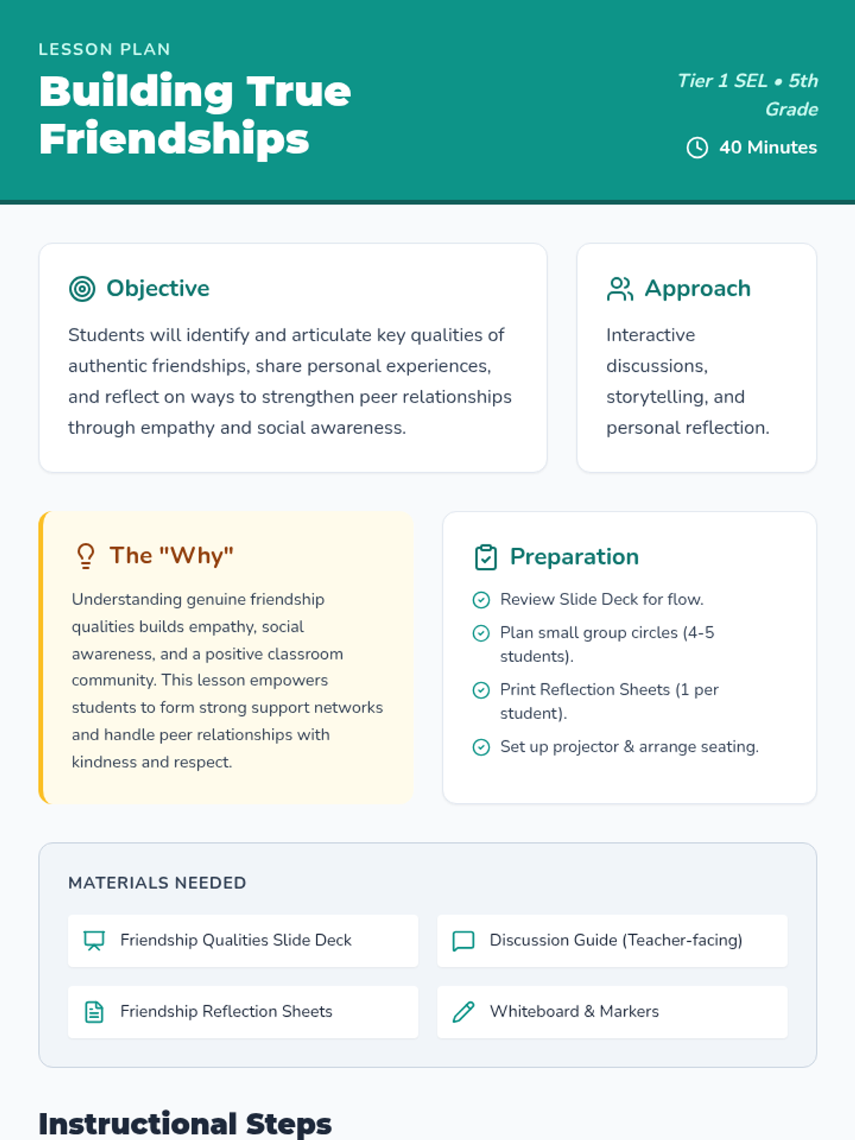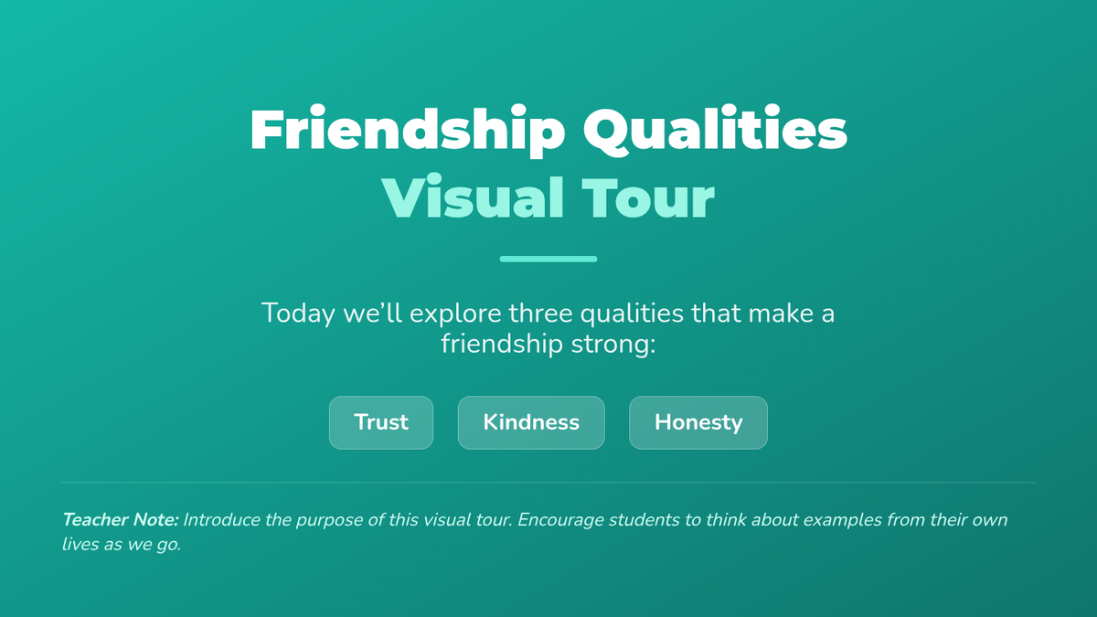 A 40-minute Tier 1 SEL lesson for 5th grade students focused on identifying authentic friendship qualities through visual exploration, small-group storytelling, and individual reflection. Students learn to build empathy and social awareness to strengthen peer relationships.