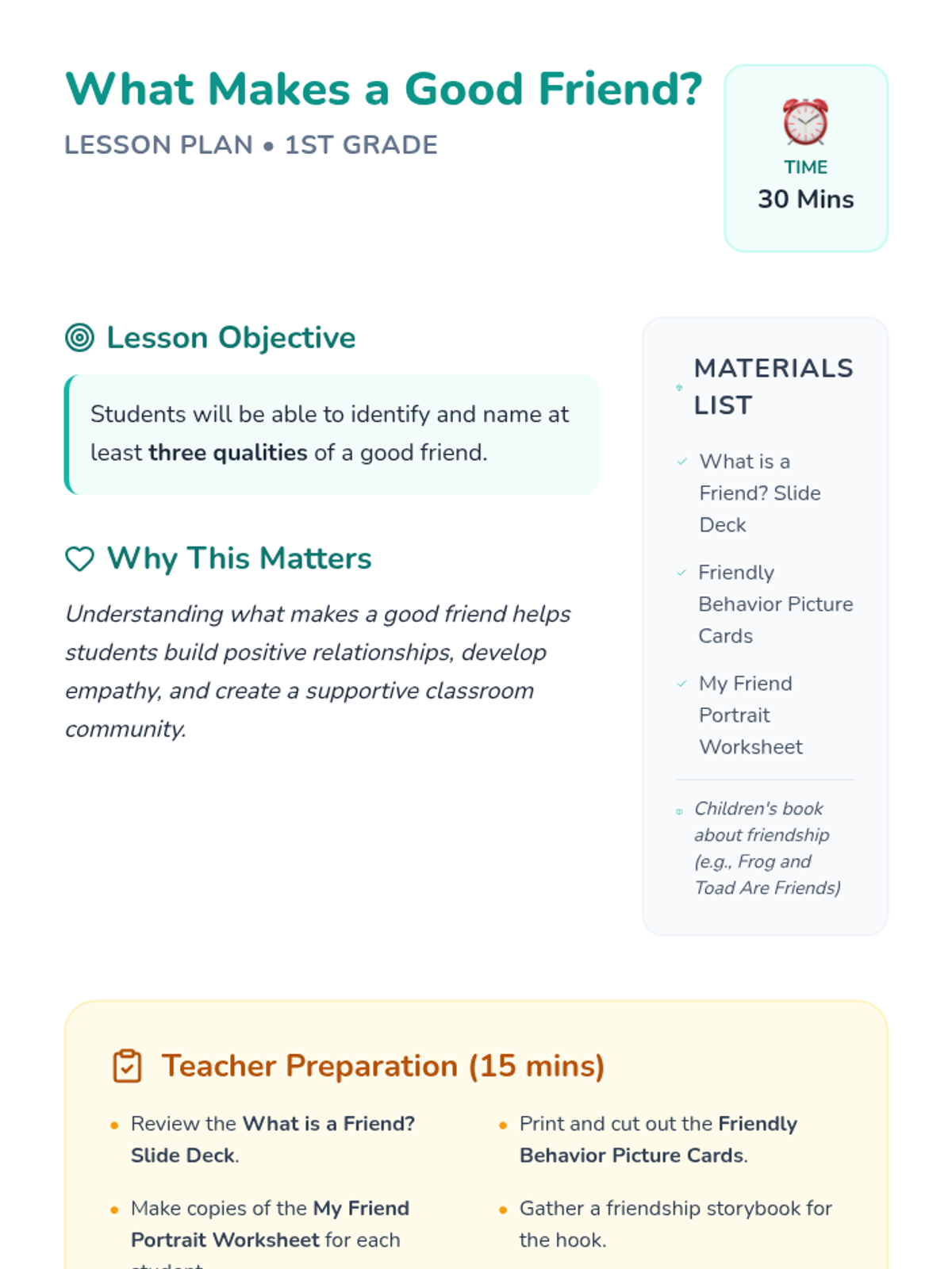 This interactive lesson for 1st-grade students explores the essential qualities of a good friend through storytelling, brainstorming, and creative activities. Students will identify 'friendship ingredients' like kindness, sharing, and helping to build a supportive classroom community.