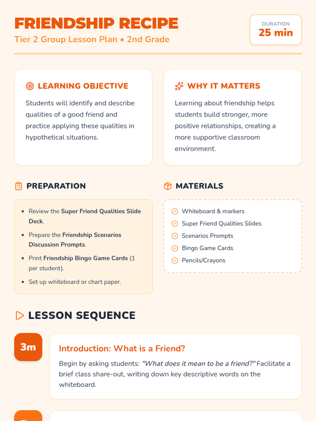 A 25-minute Tier 2 group lesson for 2nd graders focusing on identifying and practicing the qualities of a 'Super Friend' through interactive discussion and games.