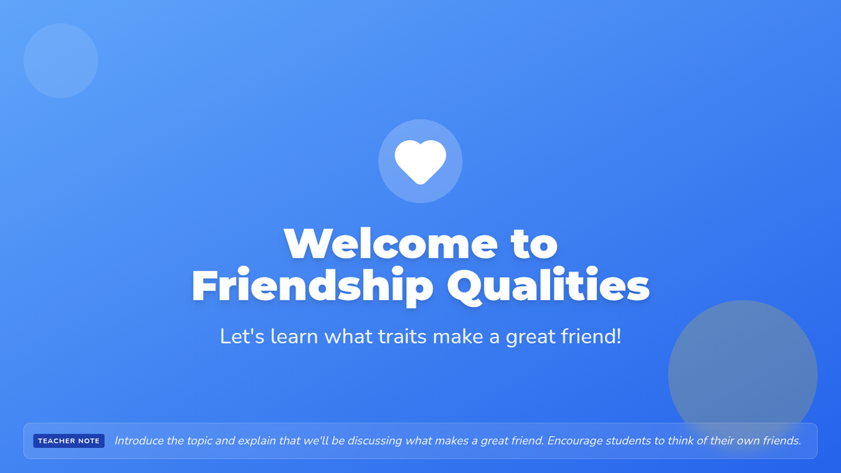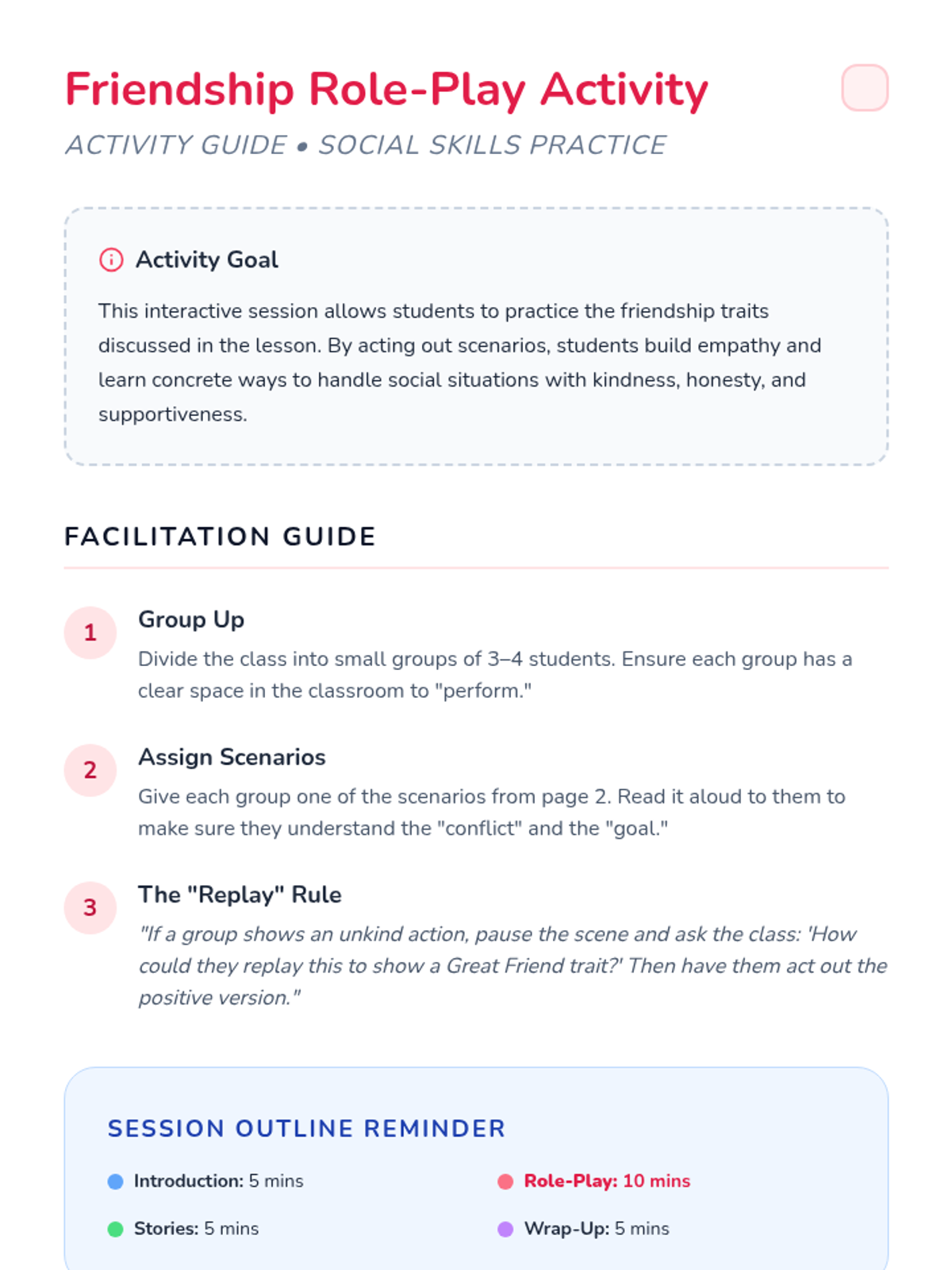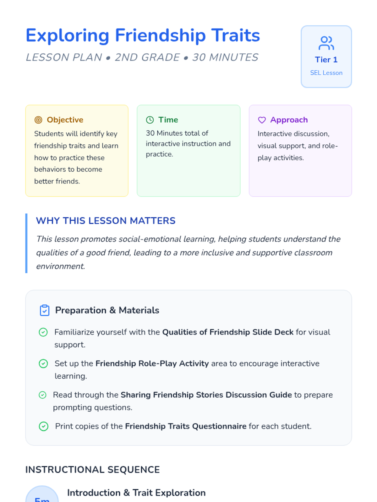 This Tier 1 social-emotional learning lesson for 2nd grade explores the essential qualities of a good friend, such as kindness, honesty, and empathy, through interactive discussion and role-play.