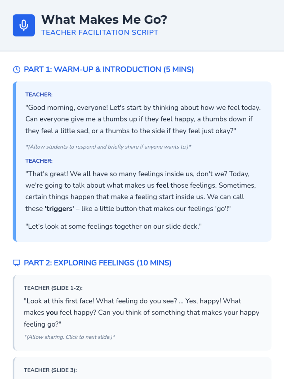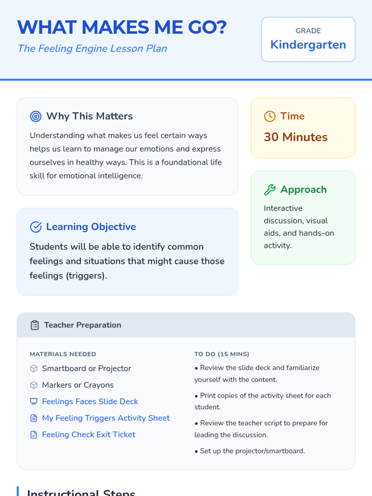 A Kindergarten lesson introducing the concept of emotional triggers, helping students identify common feelings and the situations that spark them.