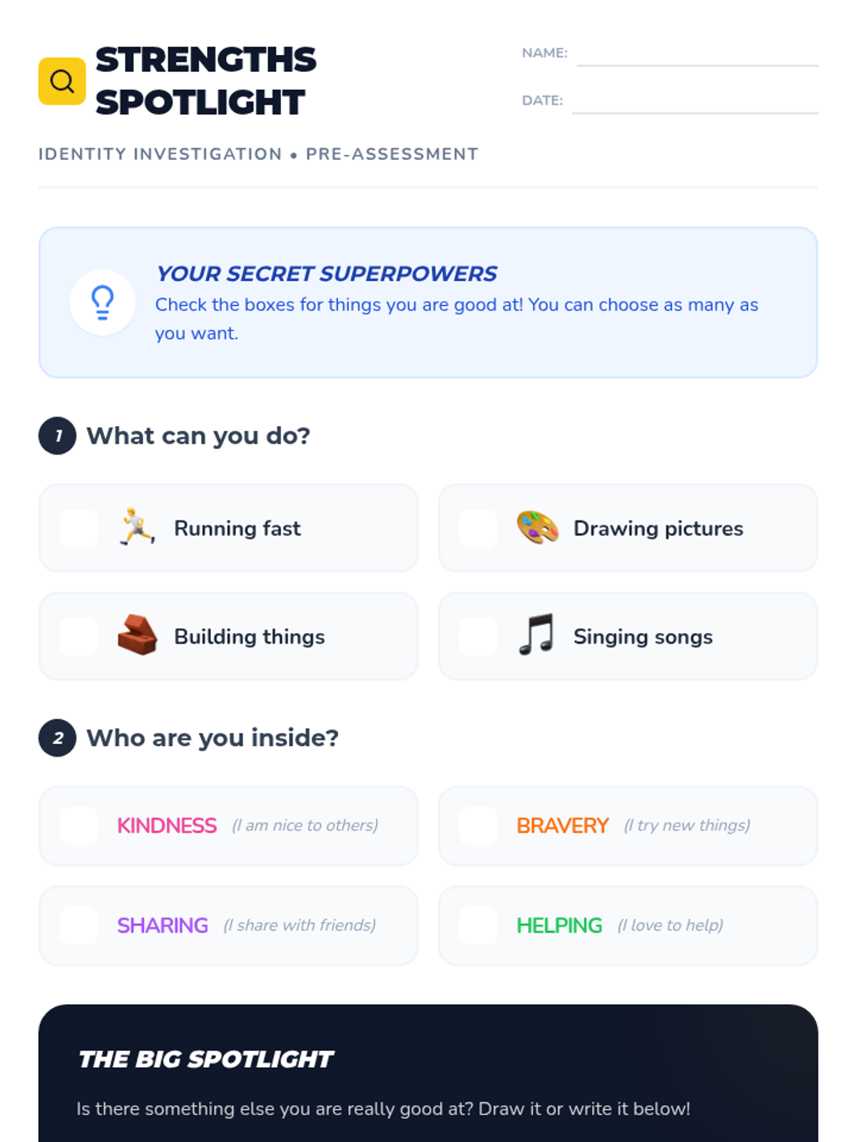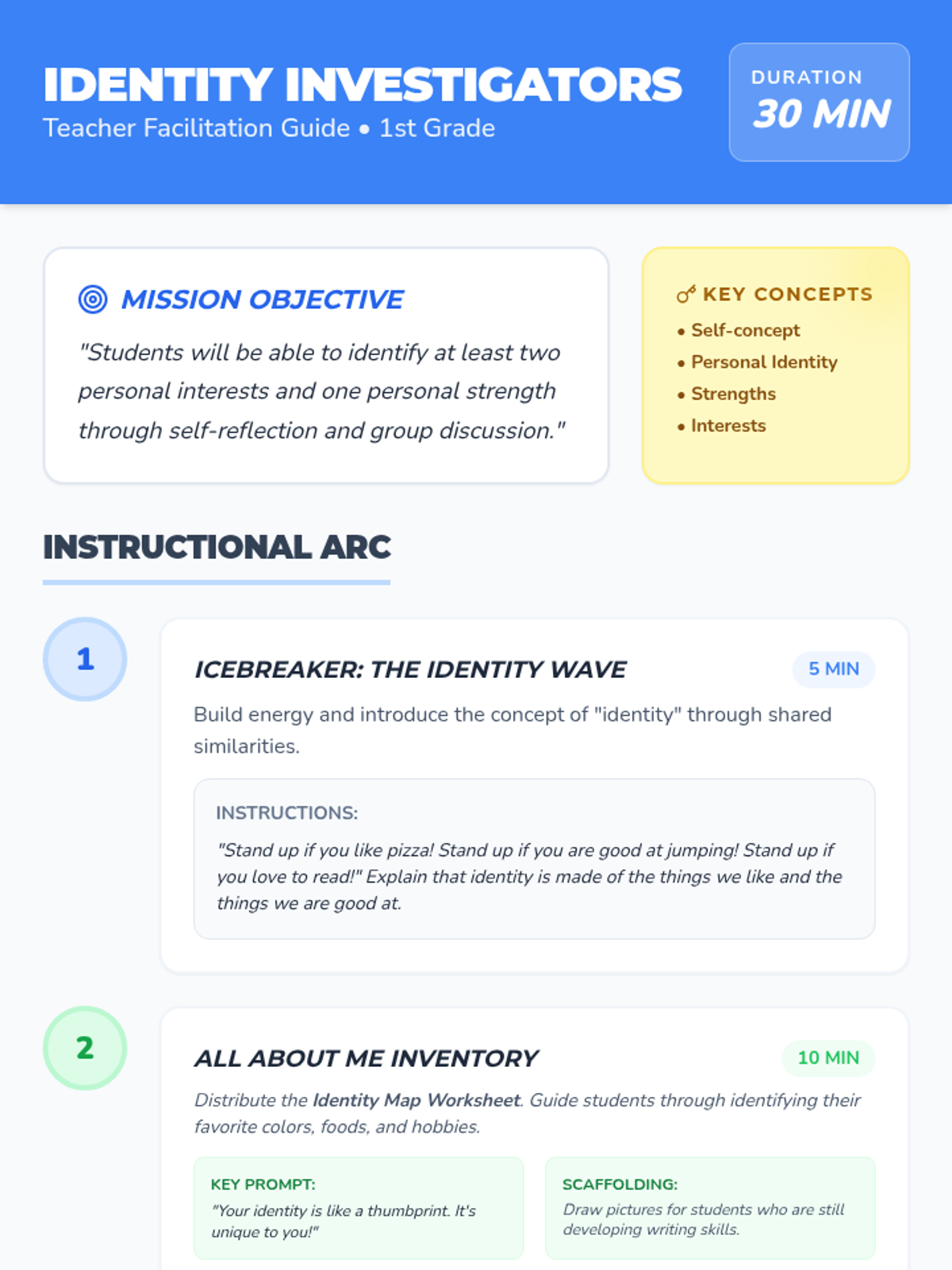 A 1st-grade lesson where students explore their personal identity by identifying their unique interests and strengths through interactive sharing and a self-reflective inventory.