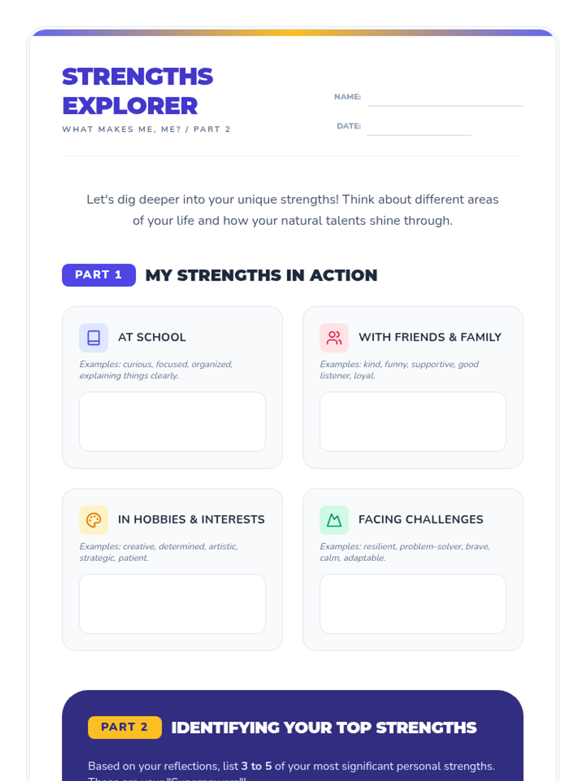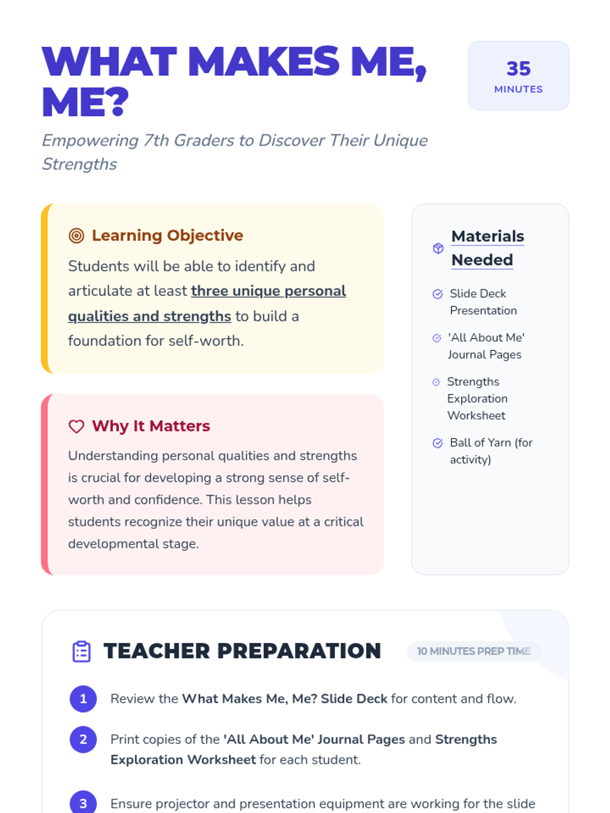 A 35-minute lesson for 7th-graders to identify personal qualities and strengths, fostering self-worth and self-awareness. Students engage in a collaborative 'Uniqueness Web' and individual reflection.
