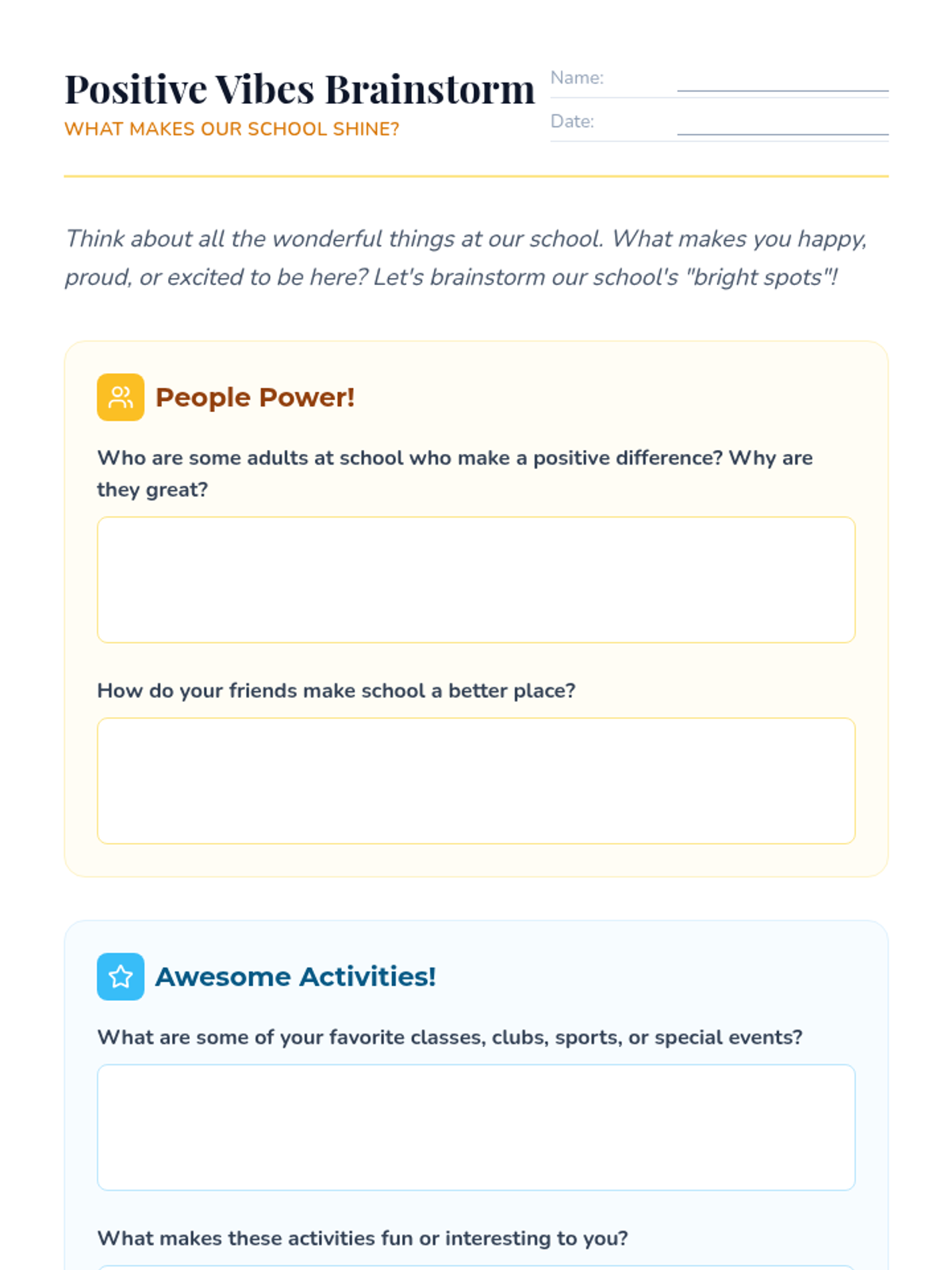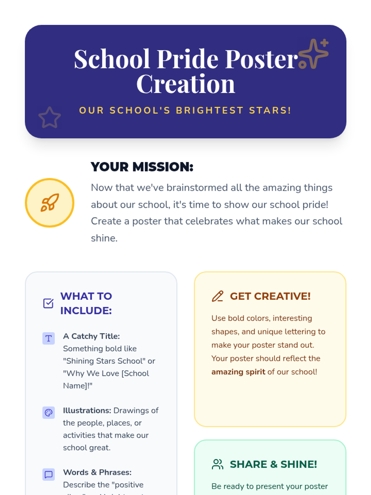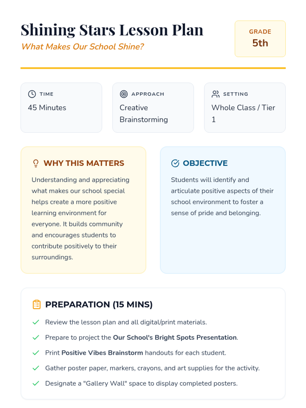 A 45-minute 5th-grade lesson focused on identifying and celebrating the positive aspects of the school climate to foster pride and belonging. Students engage in brainstorming and creative poster-making to highlight their school's unique 'bright spots.'