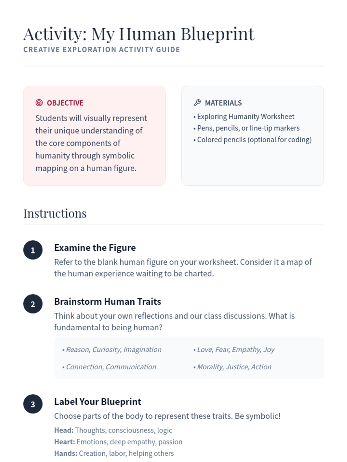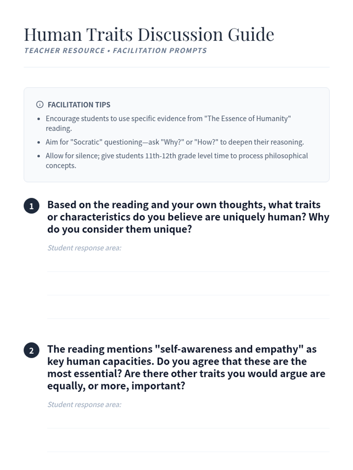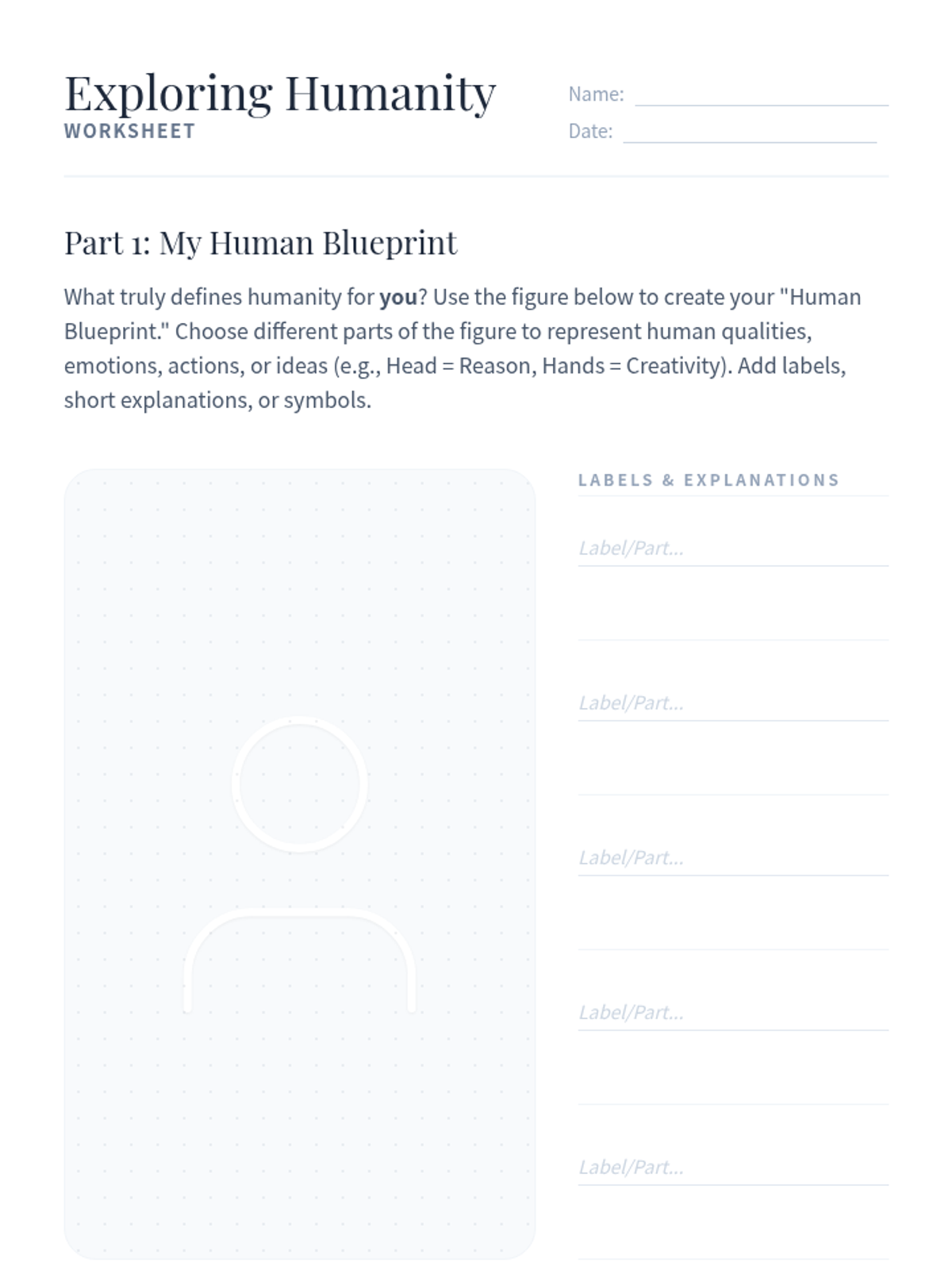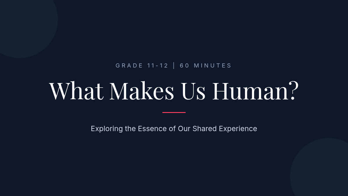 This lesson explores the multifaceted concept of humanity, delving into unique characteristics that define us through philosophical readings, creative activities, and critical discussion. Designed for 11th-12th grade students, this 60-minute session fosters deep reflection, empathy, and a nuanced understanding of the human condition.