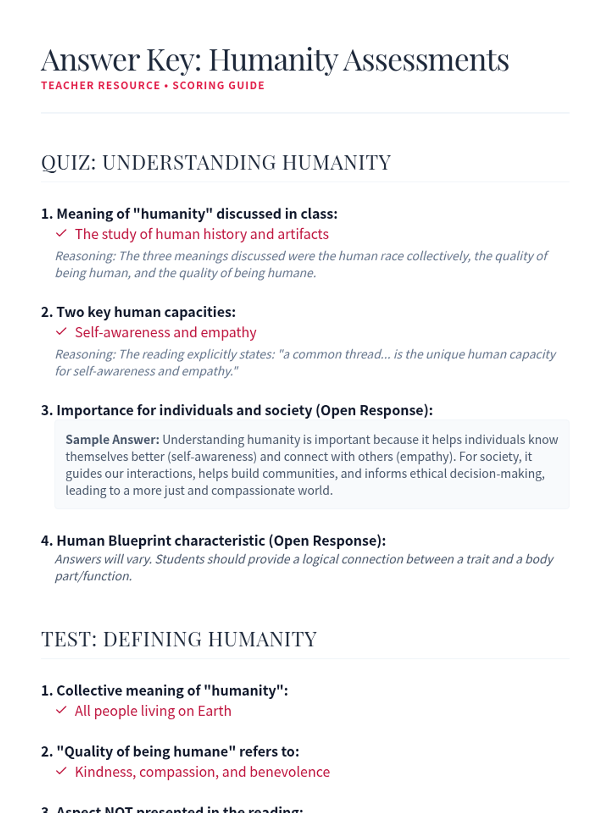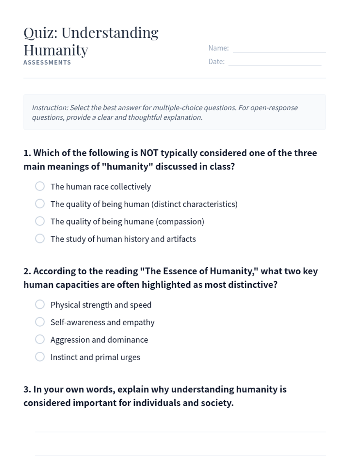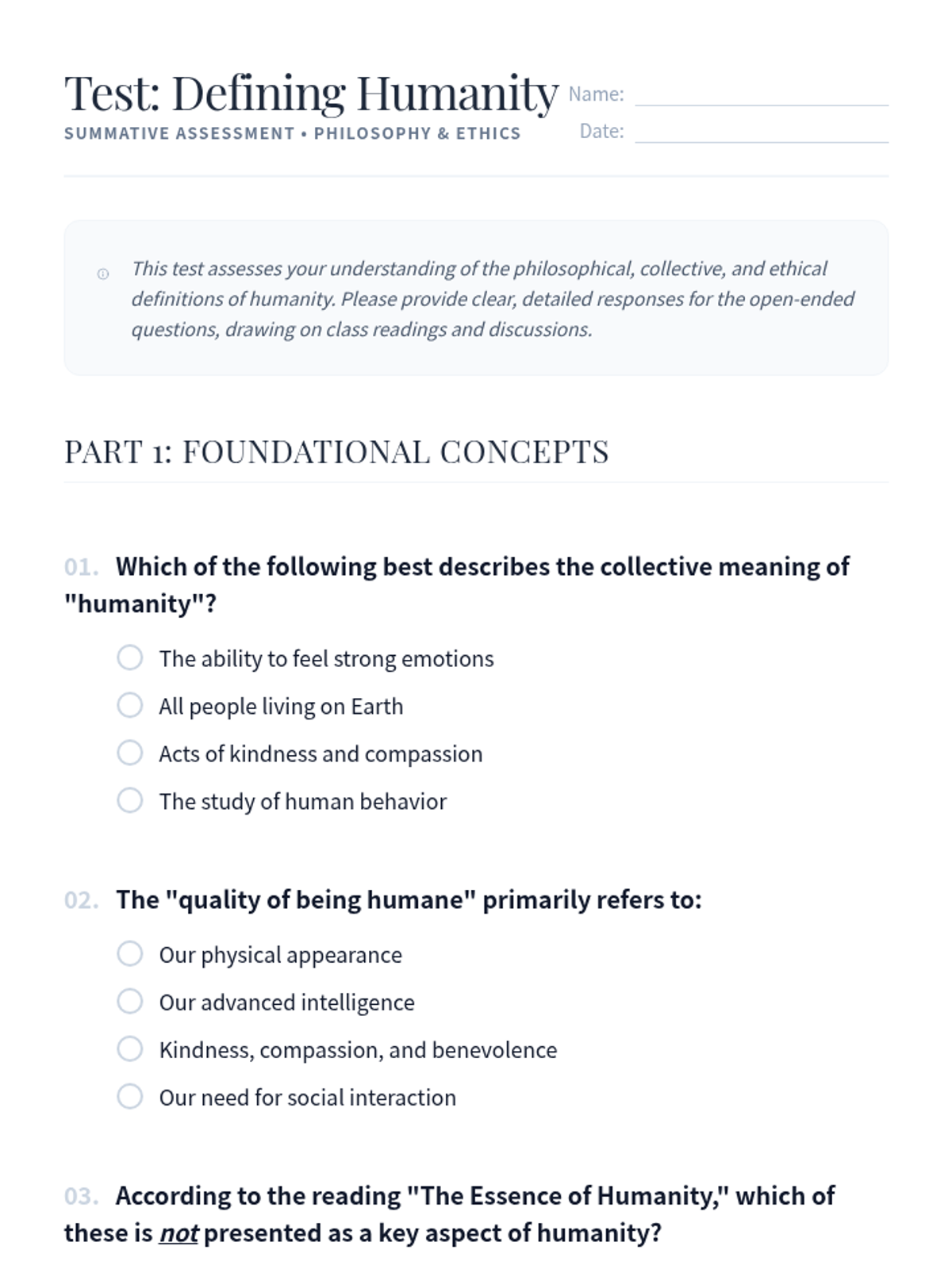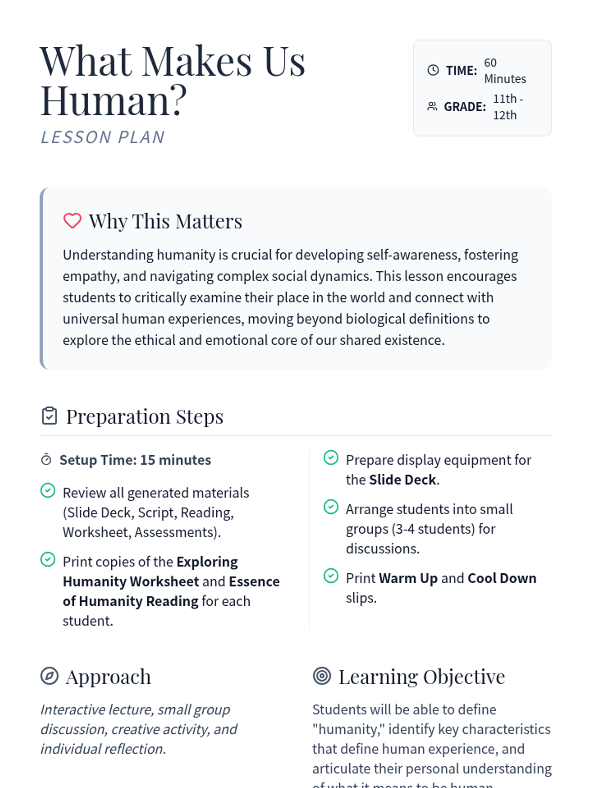 This lesson explores the multifaceted concept of humanity, delving into unique characteristics that define us through philosophical readings, creative activities, and critical discussion. Designed for 11th-12th grade students, this 60-minute session fosters deep reflection, empathy, and a nuanced understanding of the human condition.
