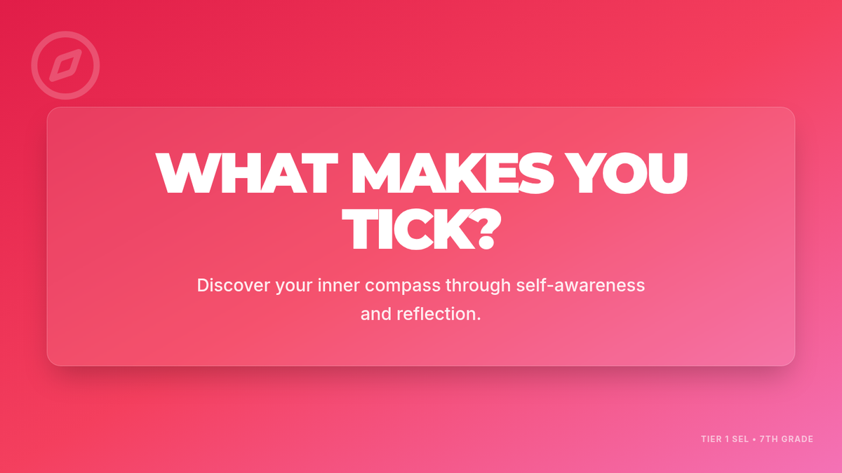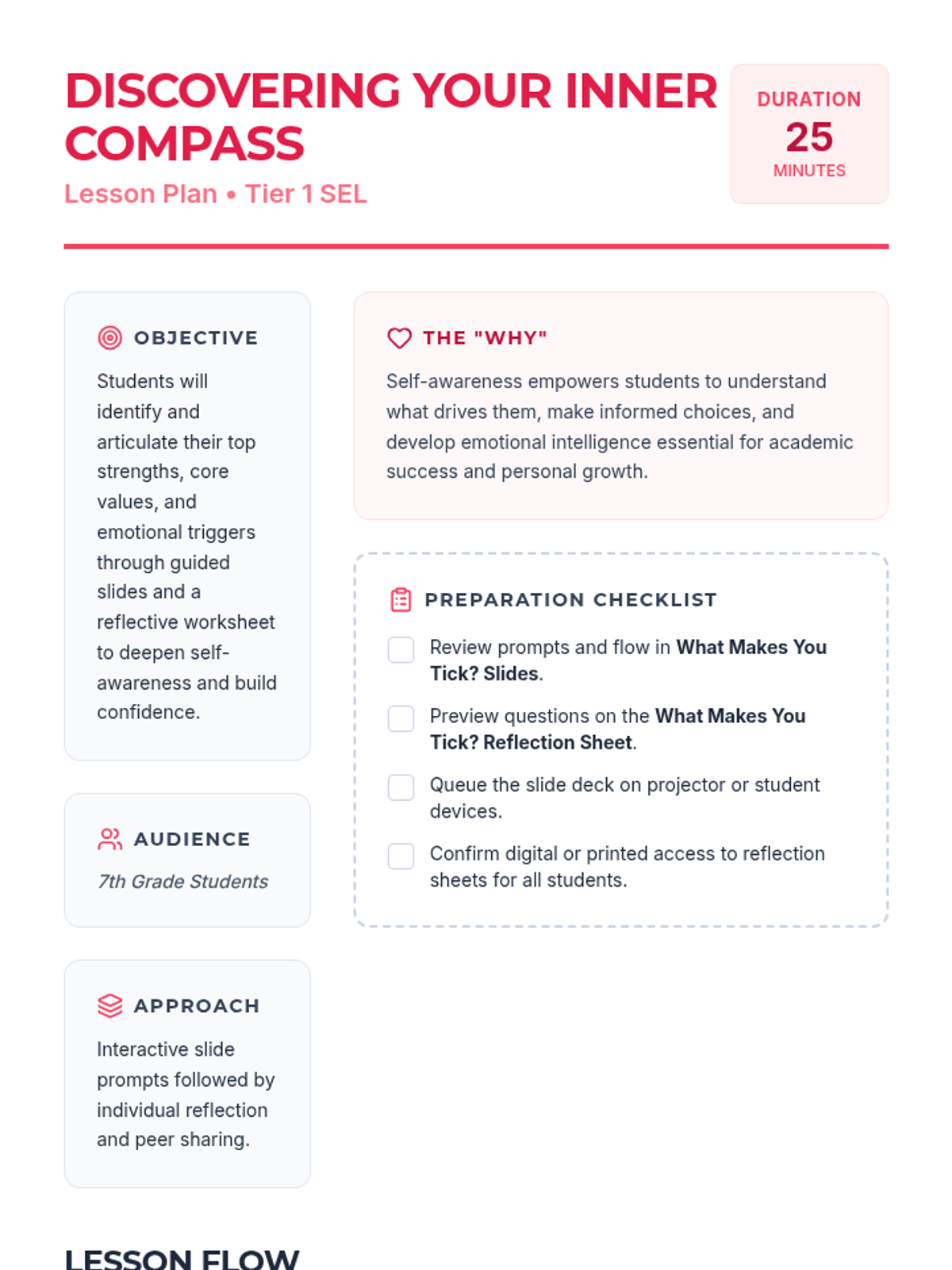 A 25-minute Tier 1 SEL lesson for 7th graders focused on developing self-awareness by identifying personal strengths, core values, and emotional triggers.