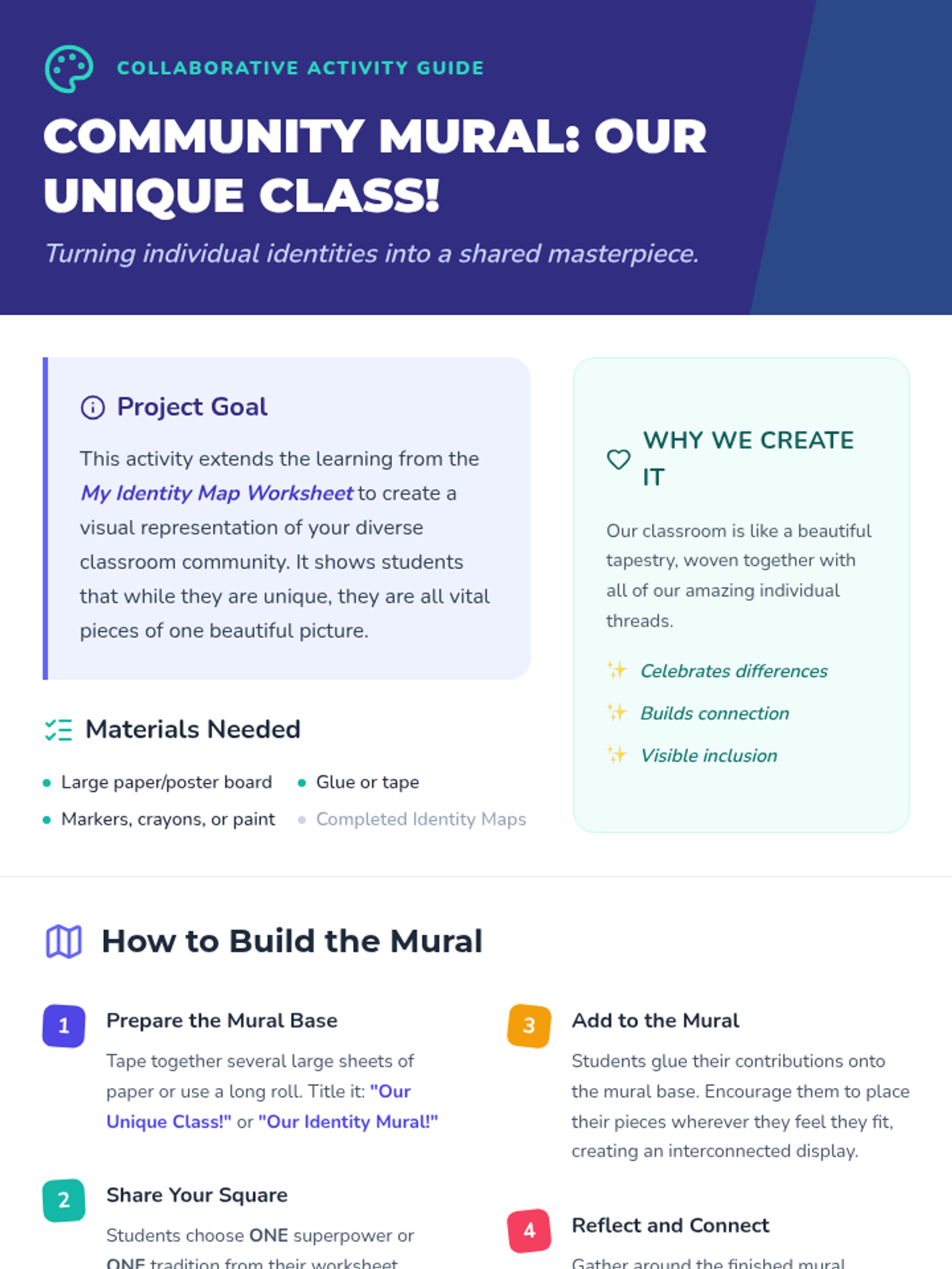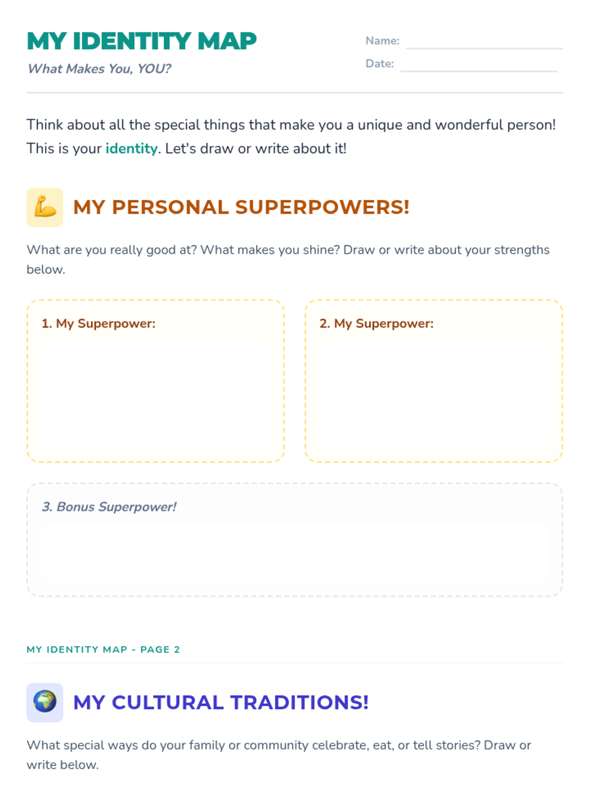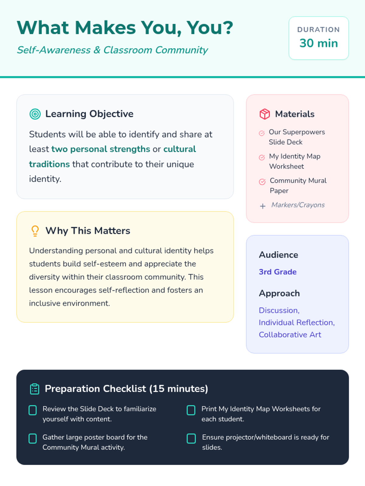 A 30-minute lesson for 3rd Grade students to explore their unique identities by identifying personal strengths and cultural traditions, fostering self-awareness and classroom community.