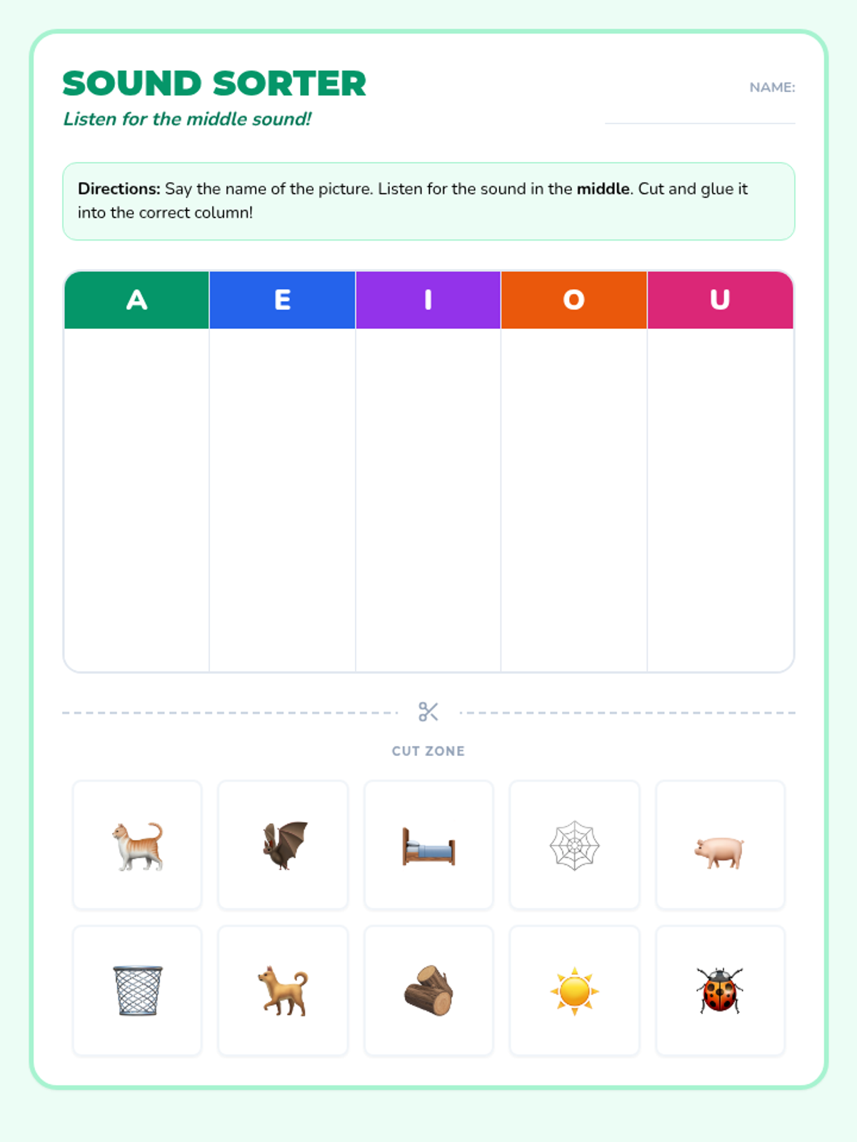 A collection of organized, visually-supported phonics labels designed for classroom organization and student reference. These labels cover core literacy concepts from short vowels to diphthongs.