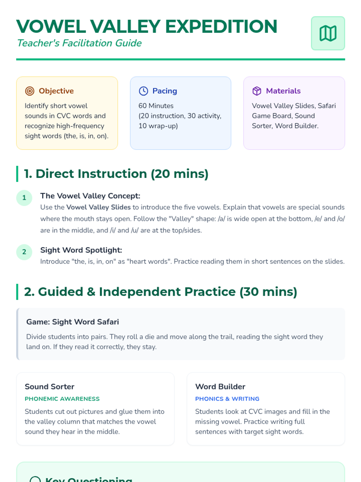 A foundational phonics lesson focusing on short vowel sounds (a, e, i, o, u) and high-frequency sight words using an adventure-themed "Vowel Valley" concept.