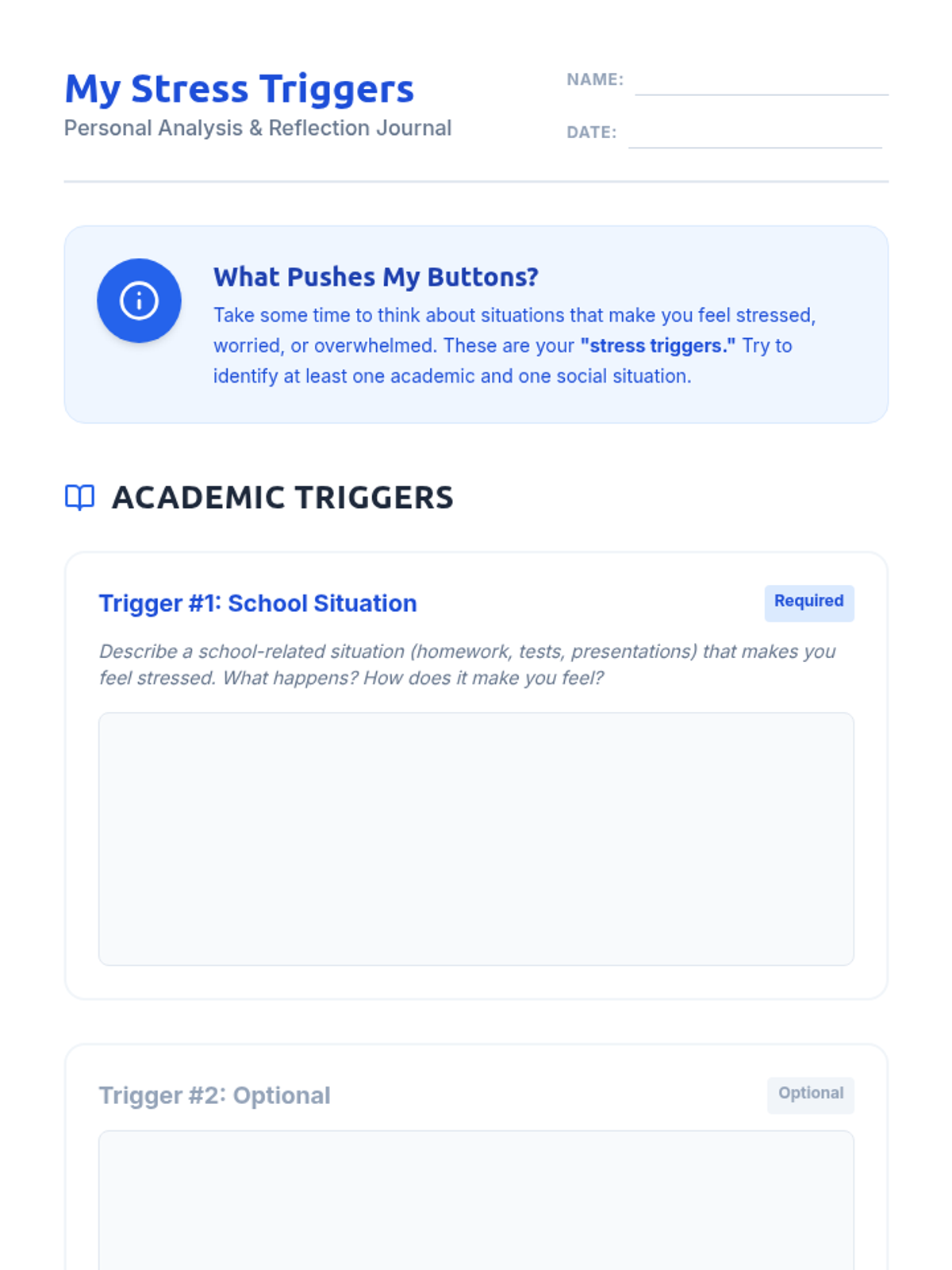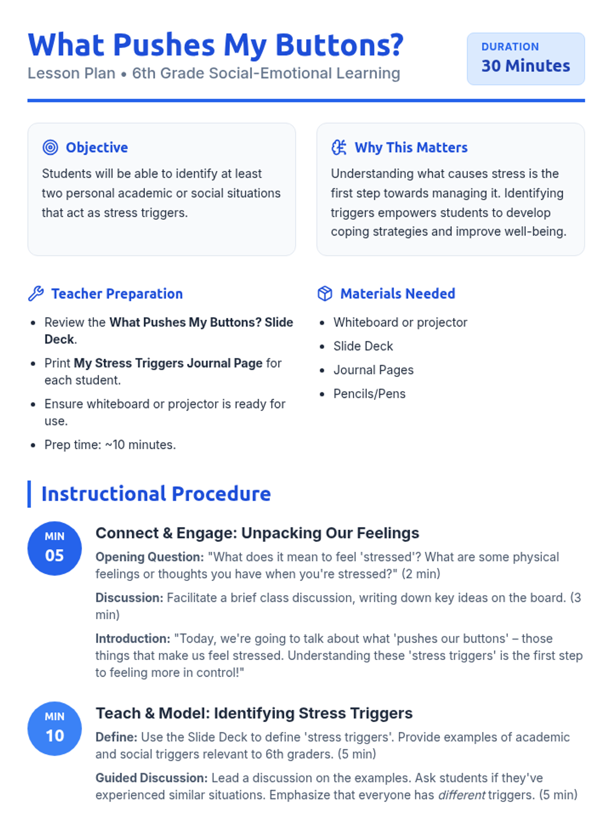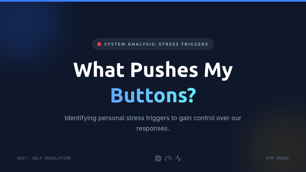 A 30-minute 6th Grade lesson that helps students identify their personal academic and social stress triggers as the first step toward effective self-regulation.