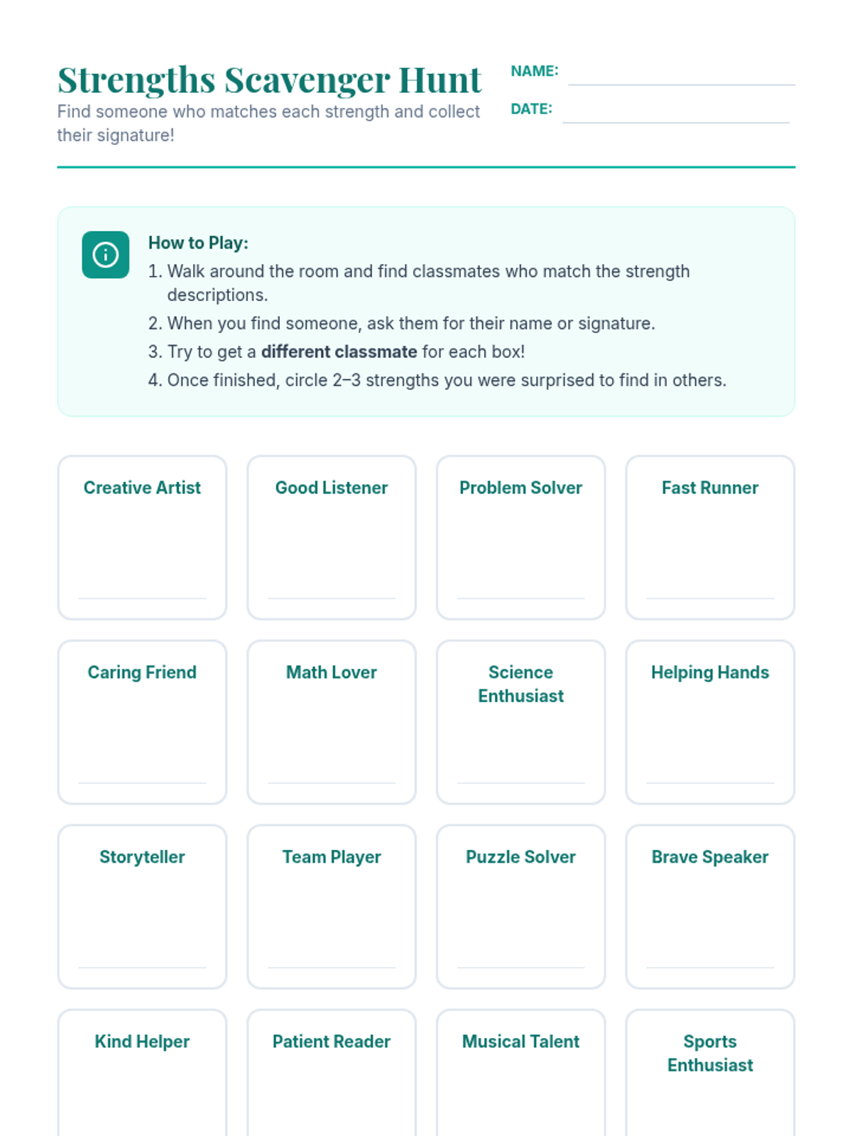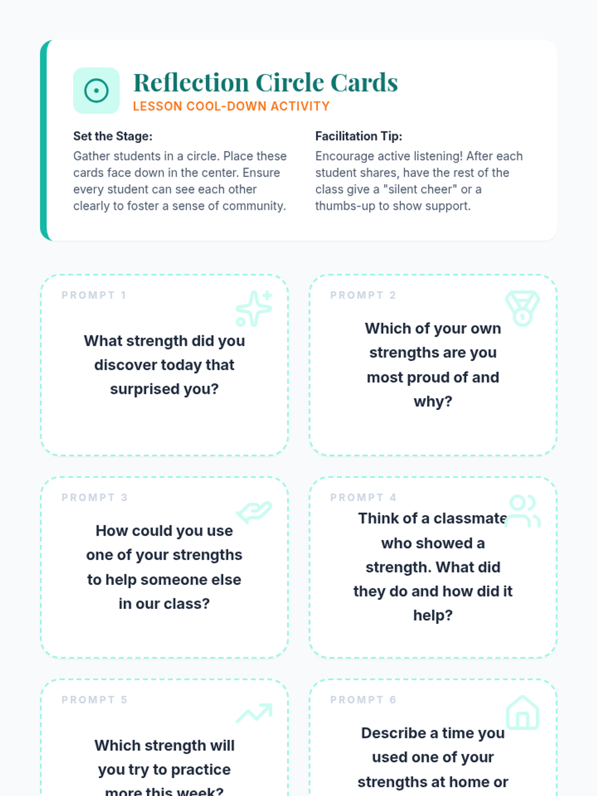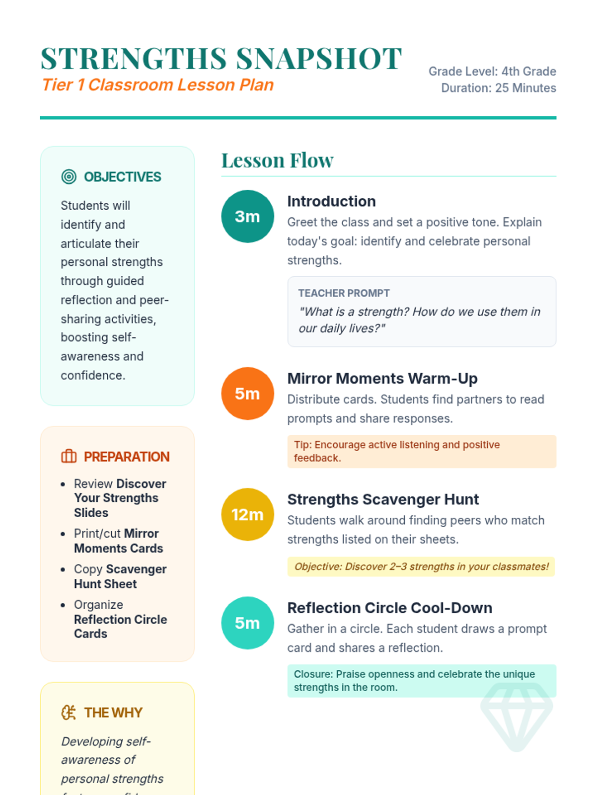 A 25-minute Tier 1 SEL lesson for 4th graders to identify and celebrate personal strengths through interactive reflection and peer sharing.