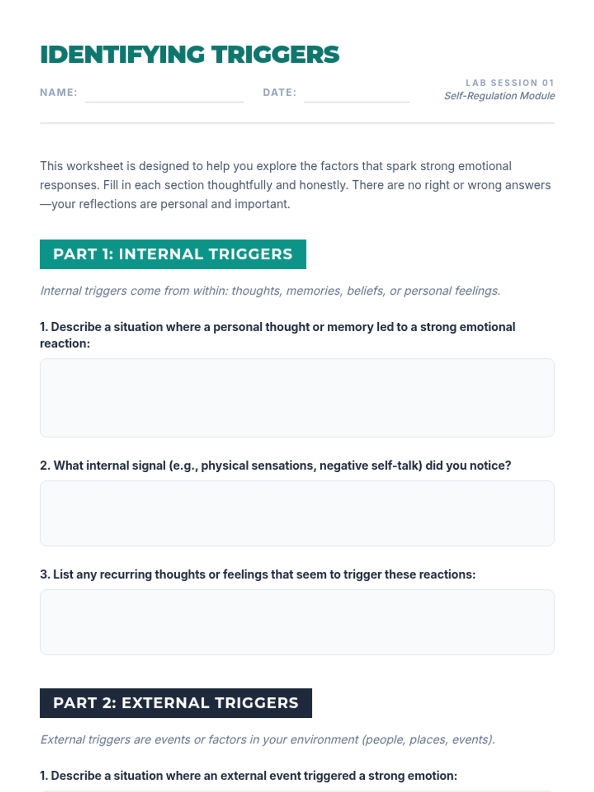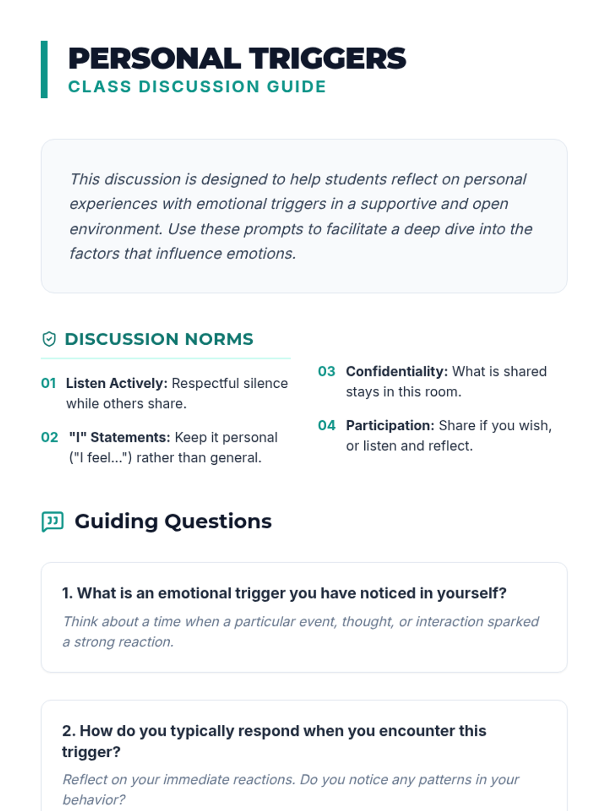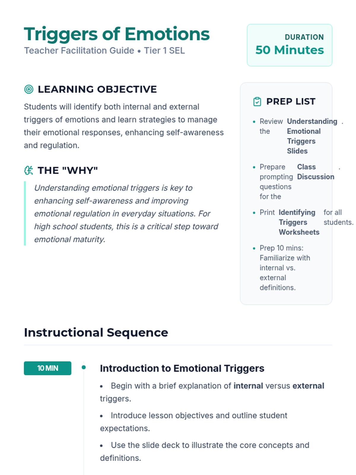 A 50-minute Tier 1 lesson for 11th-grade students focused on identifying internal and external emotional triggers and developing management strategies.