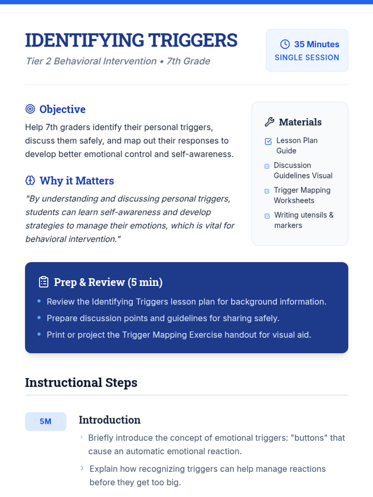 A 35-minute Tier 2 behavioral intervention lesson for 7th graders focused on identifying personal triggers and developing proactive coping strategies. Students will explore their emotional responses through safe discussion and visual mapping.