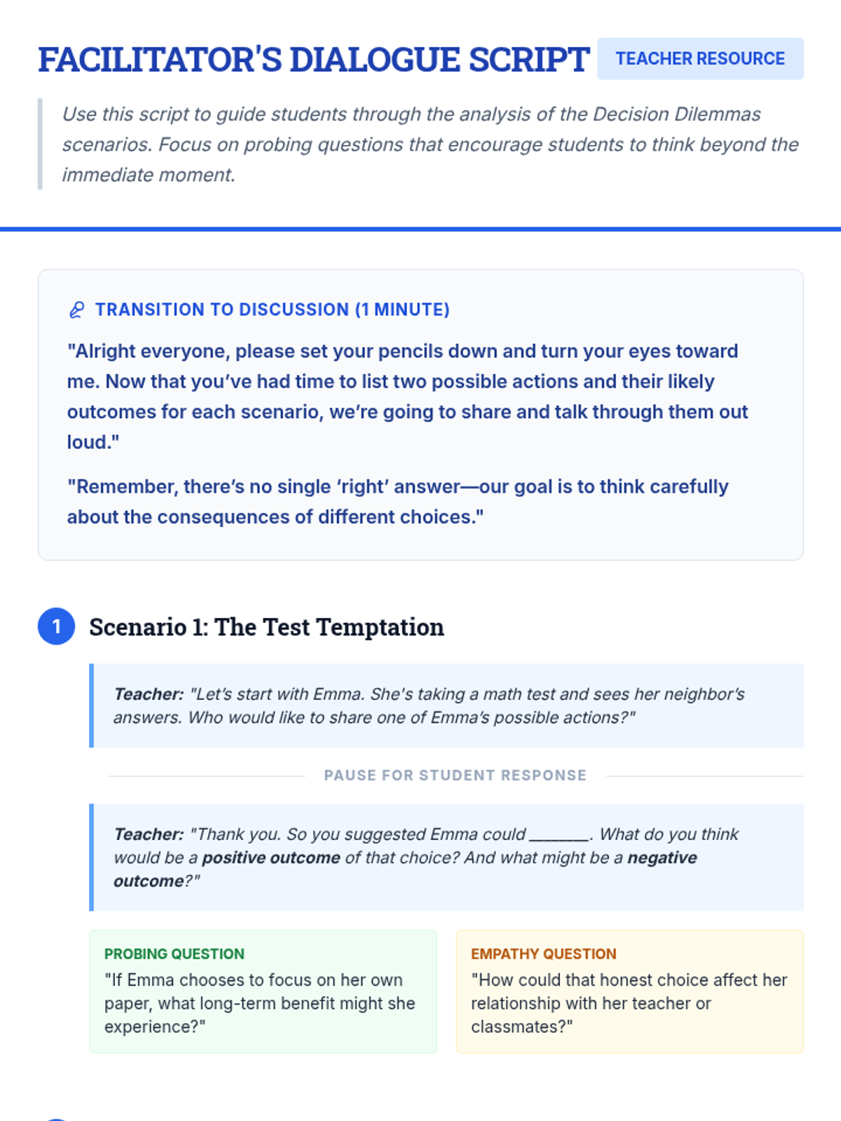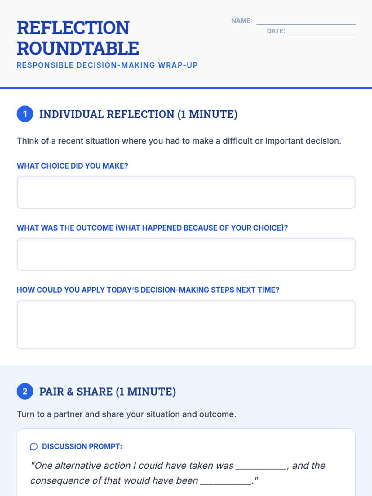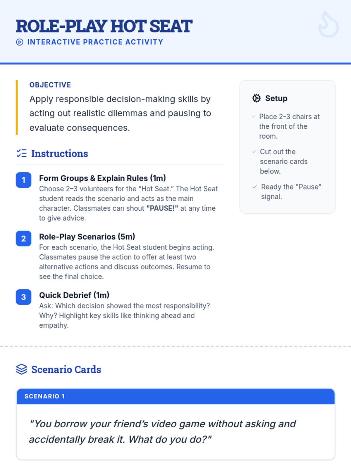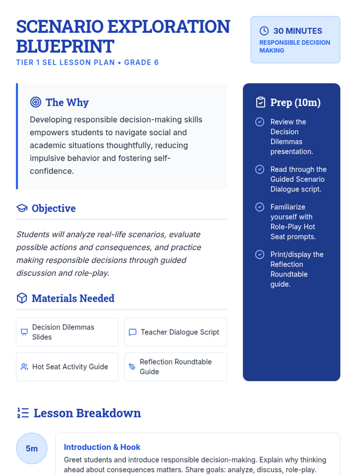 A 30-minute Tier 1 SEL lesson for 6th graders focused on responsible decision-making through scenario analysis, evaluation of consequences, and role-play.