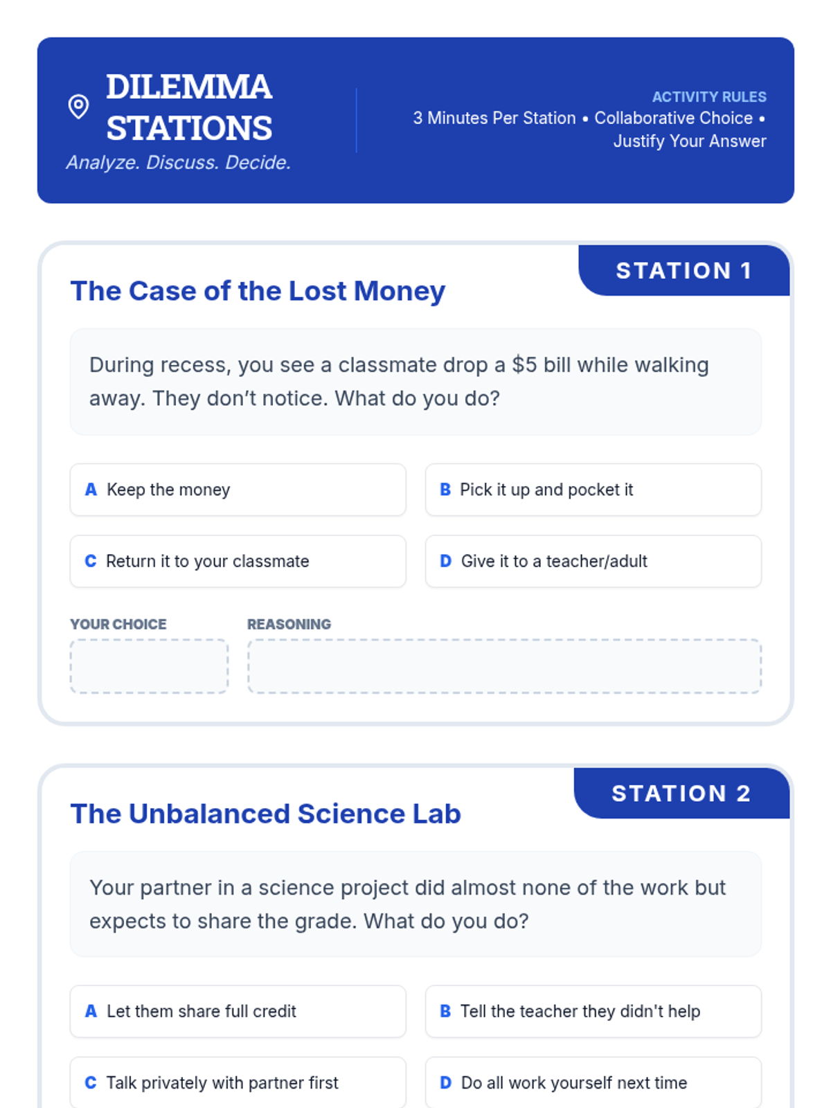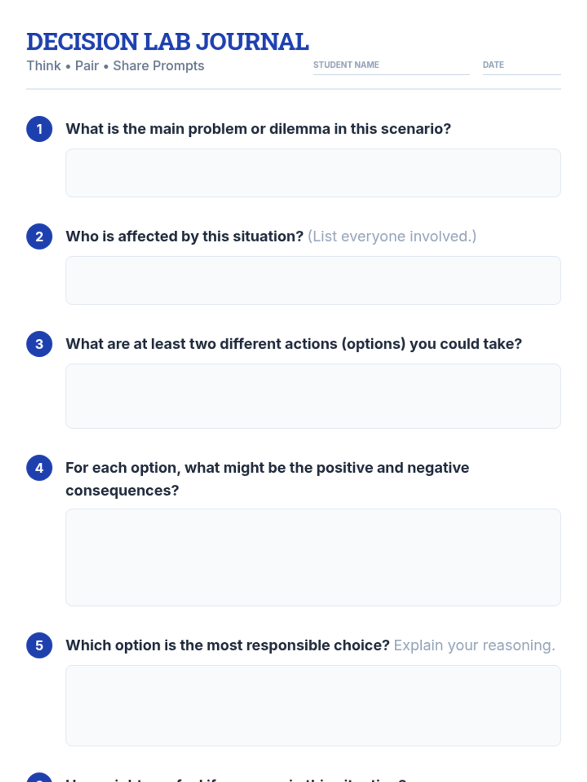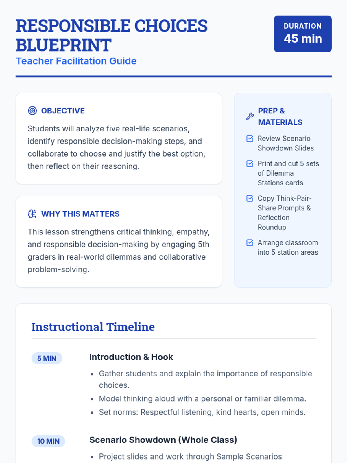 A scenario-based lesson for 5th graders to practice responsible decision-making through collaborative problem-solving and reflection.