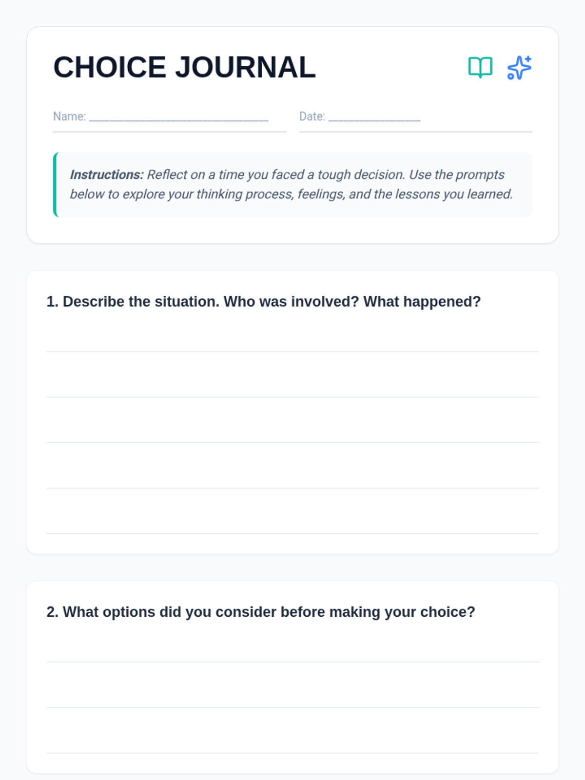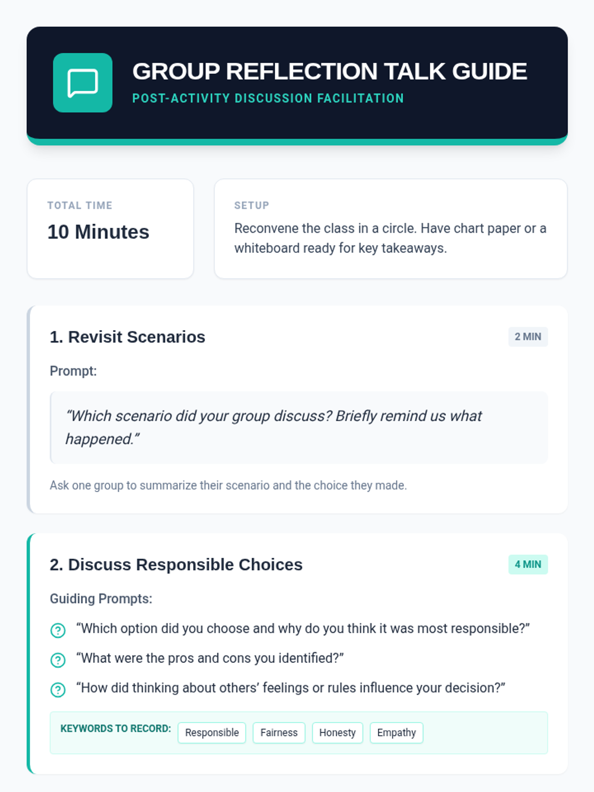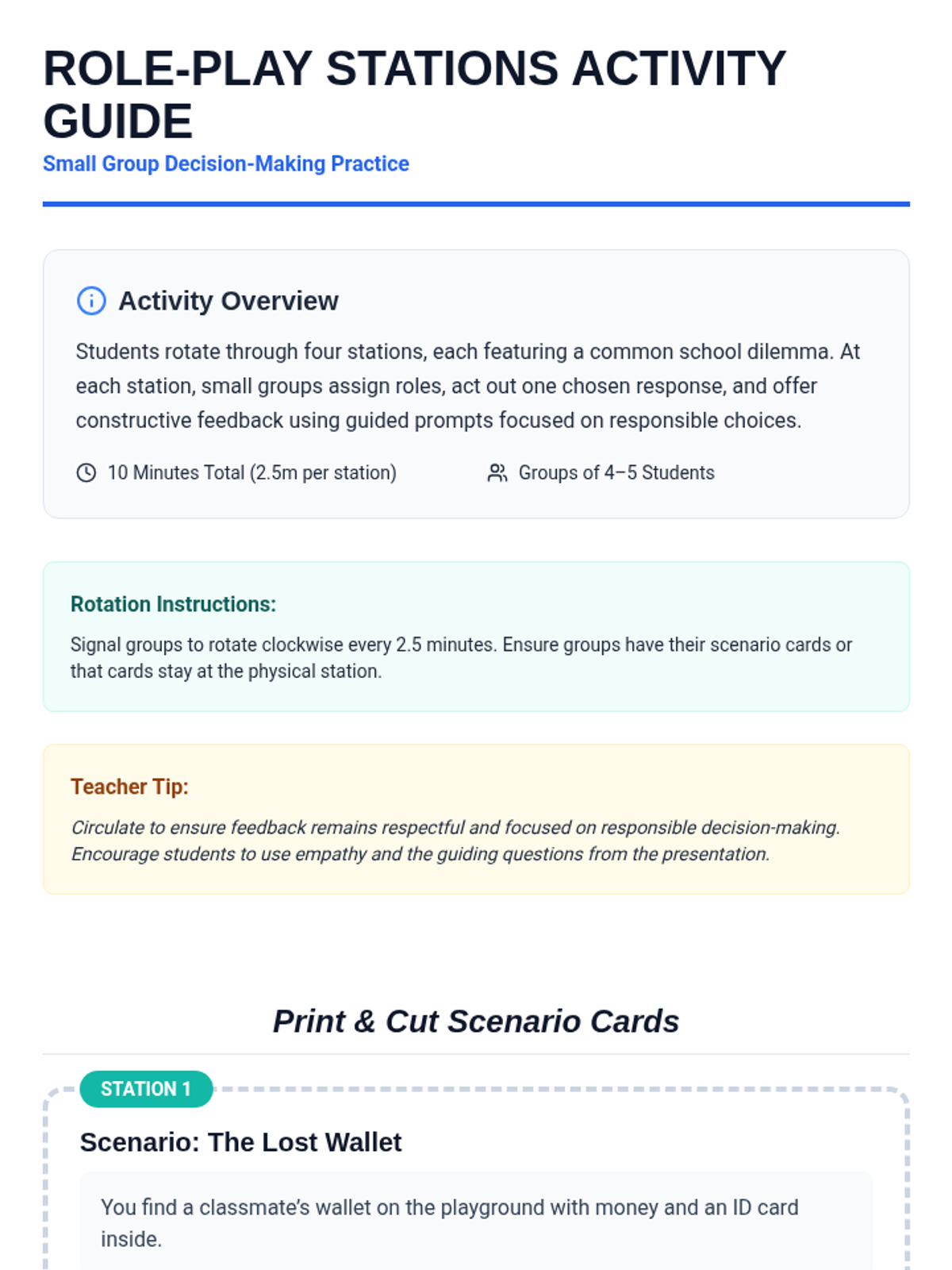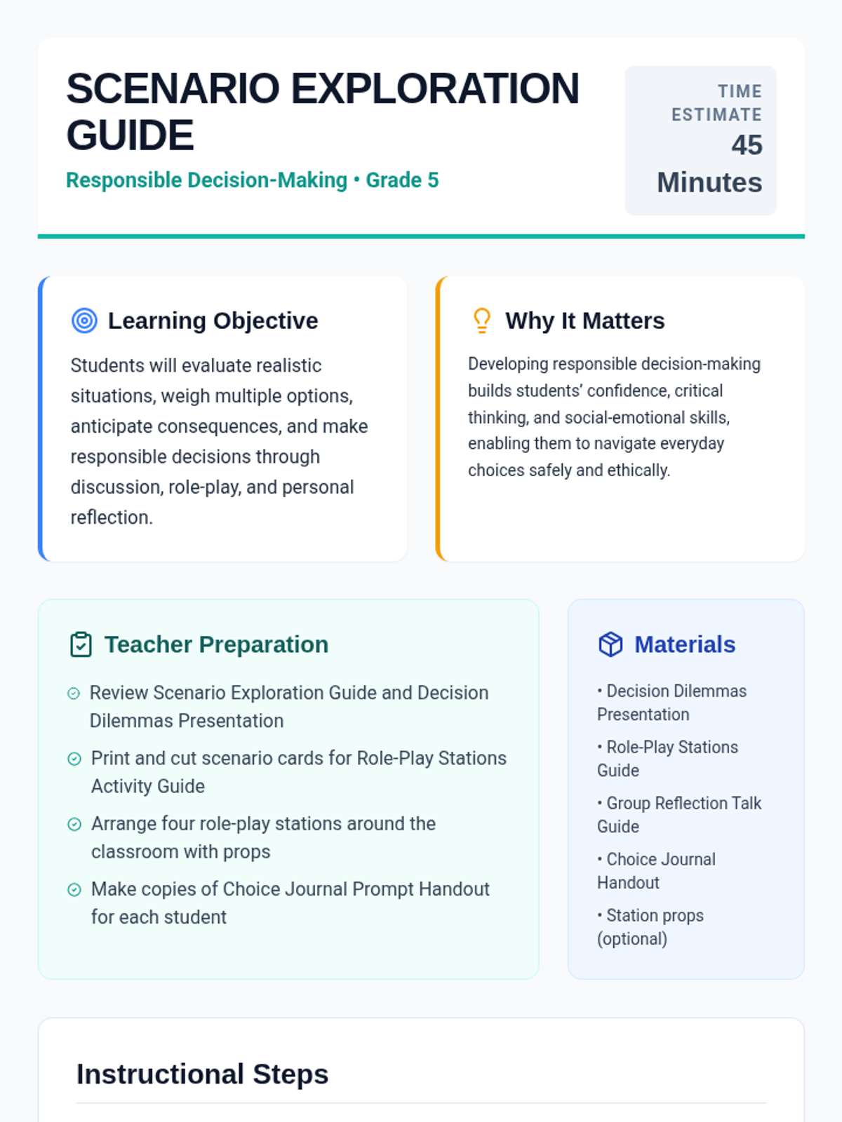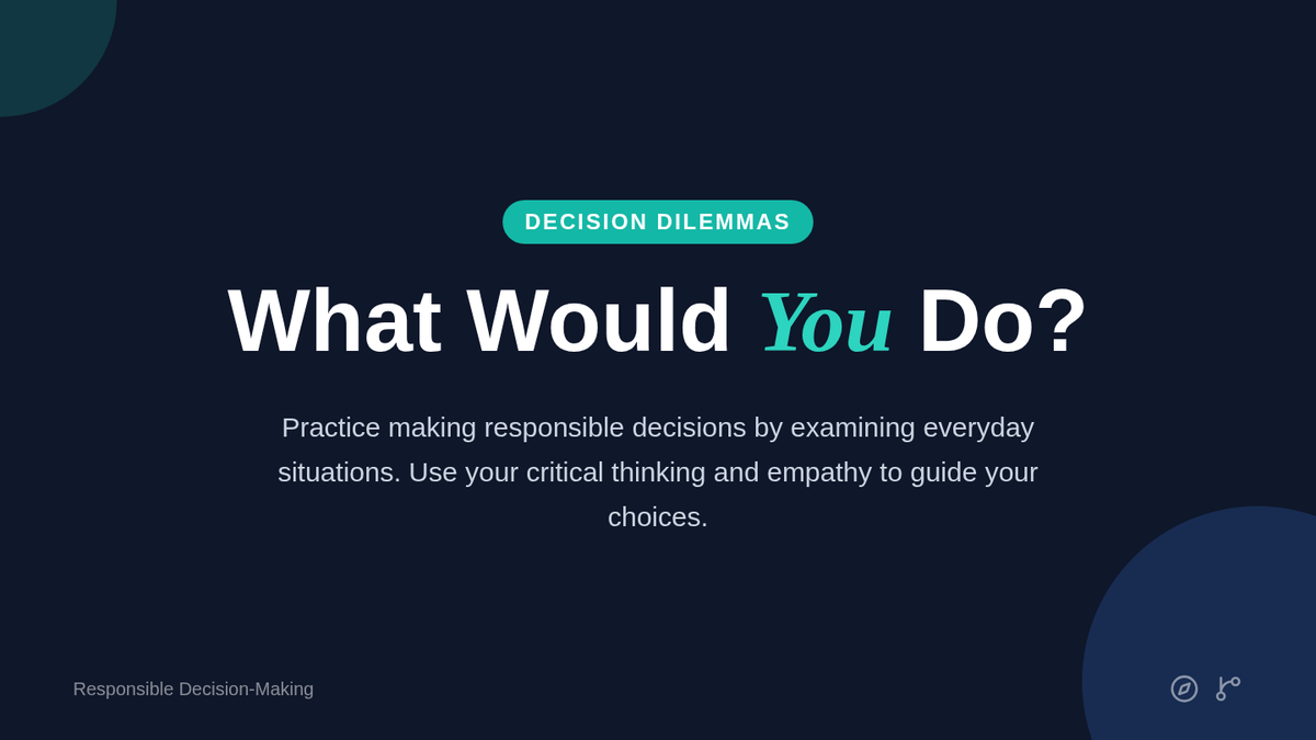 A 5th-grade social-emotional learning lesson focused on responsible decision-making. Students evaluate real-life scenarios, practice weighing consequences through role-play, and reflect on their personal decision-making processes.