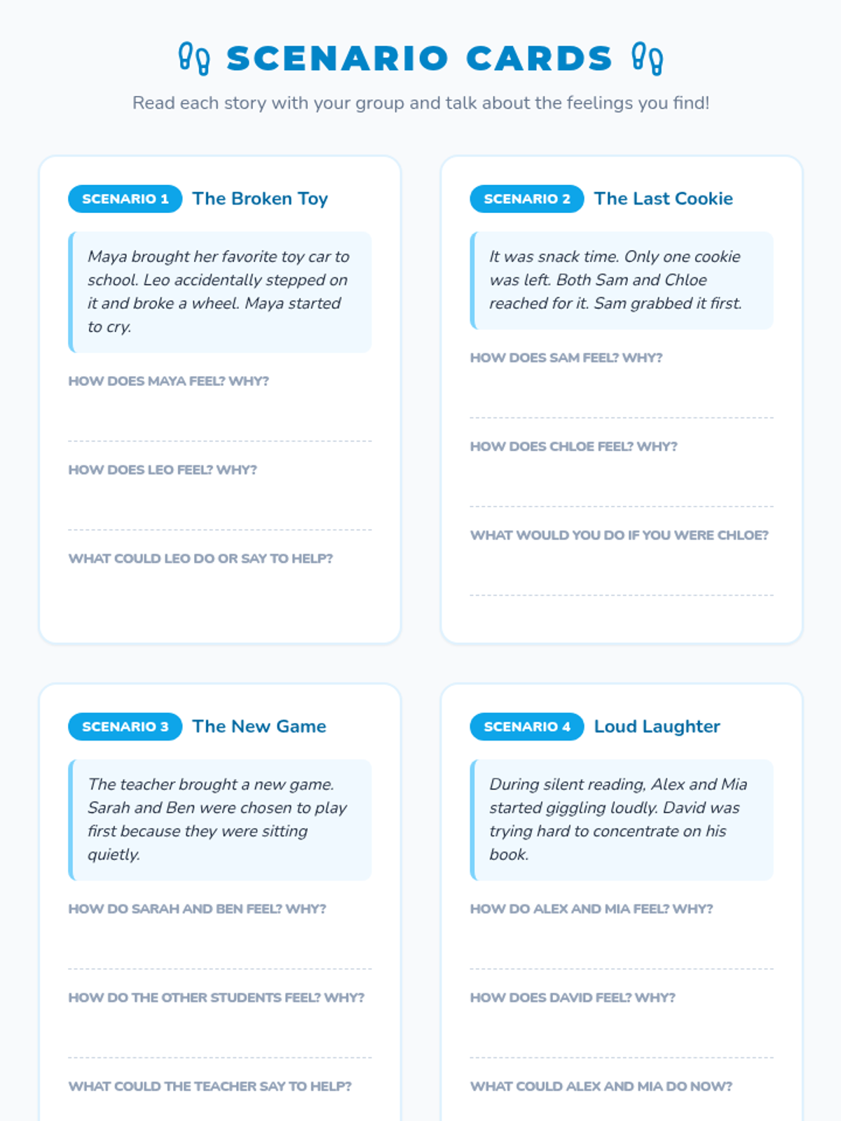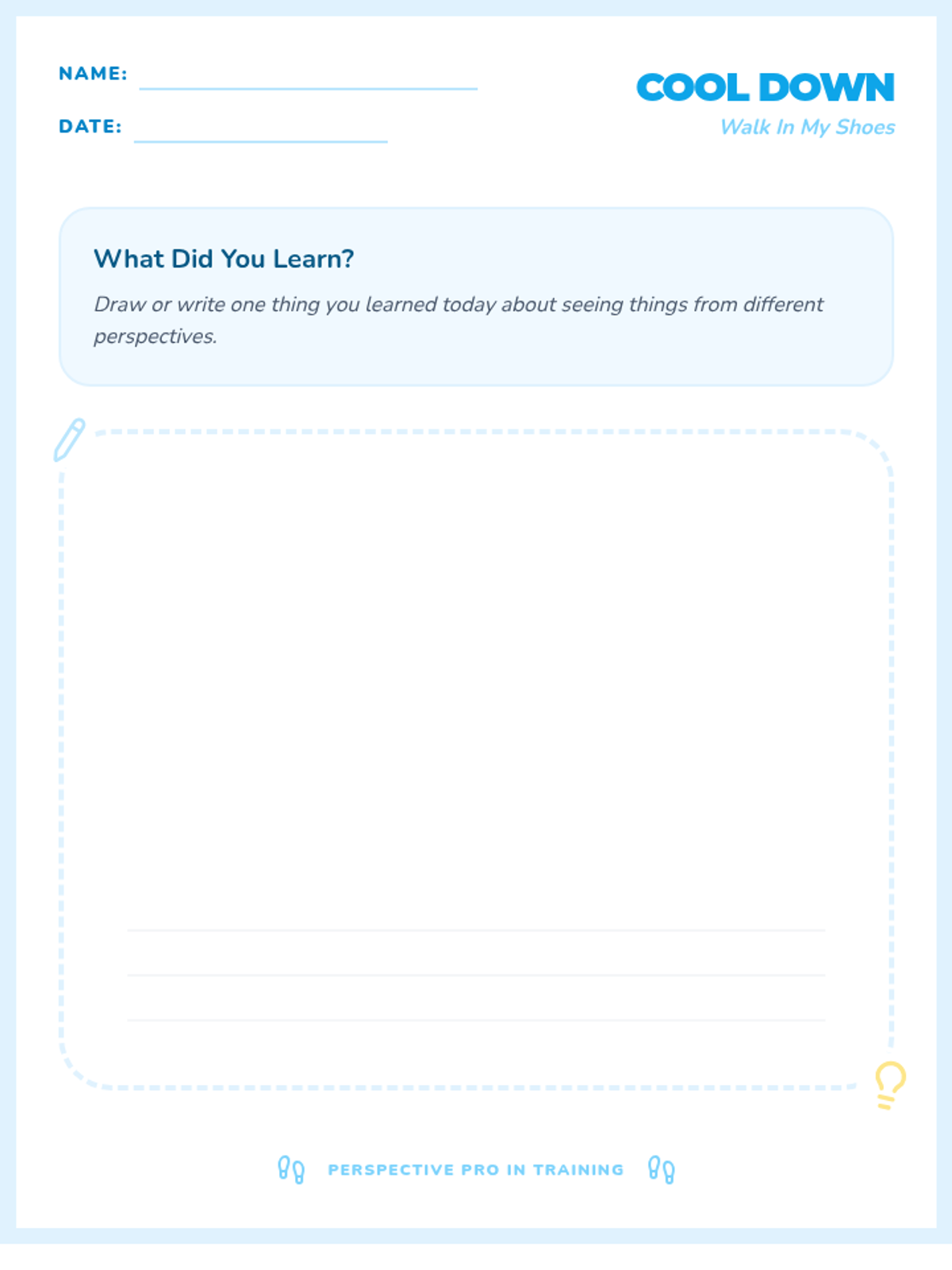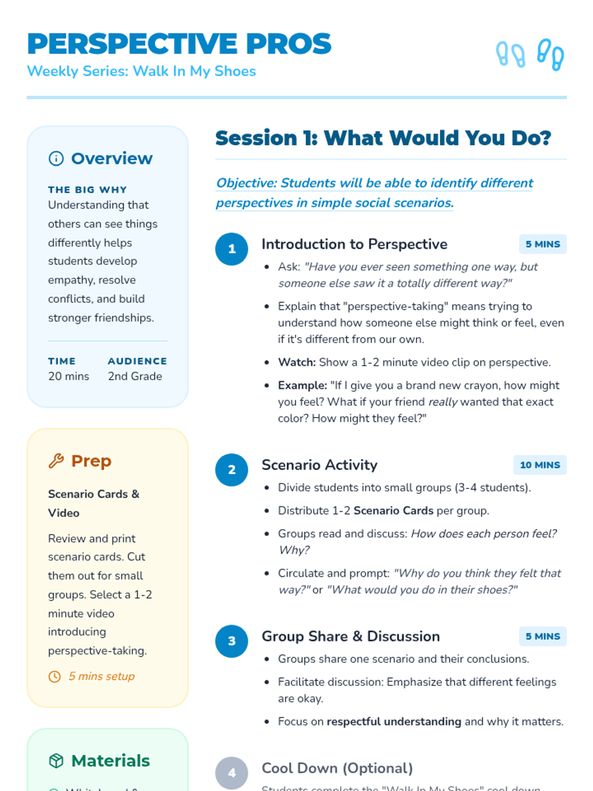 Students are introduced to the concept of perspective-taking, learning that different people can see the same situation in different ways through scenario analysis.