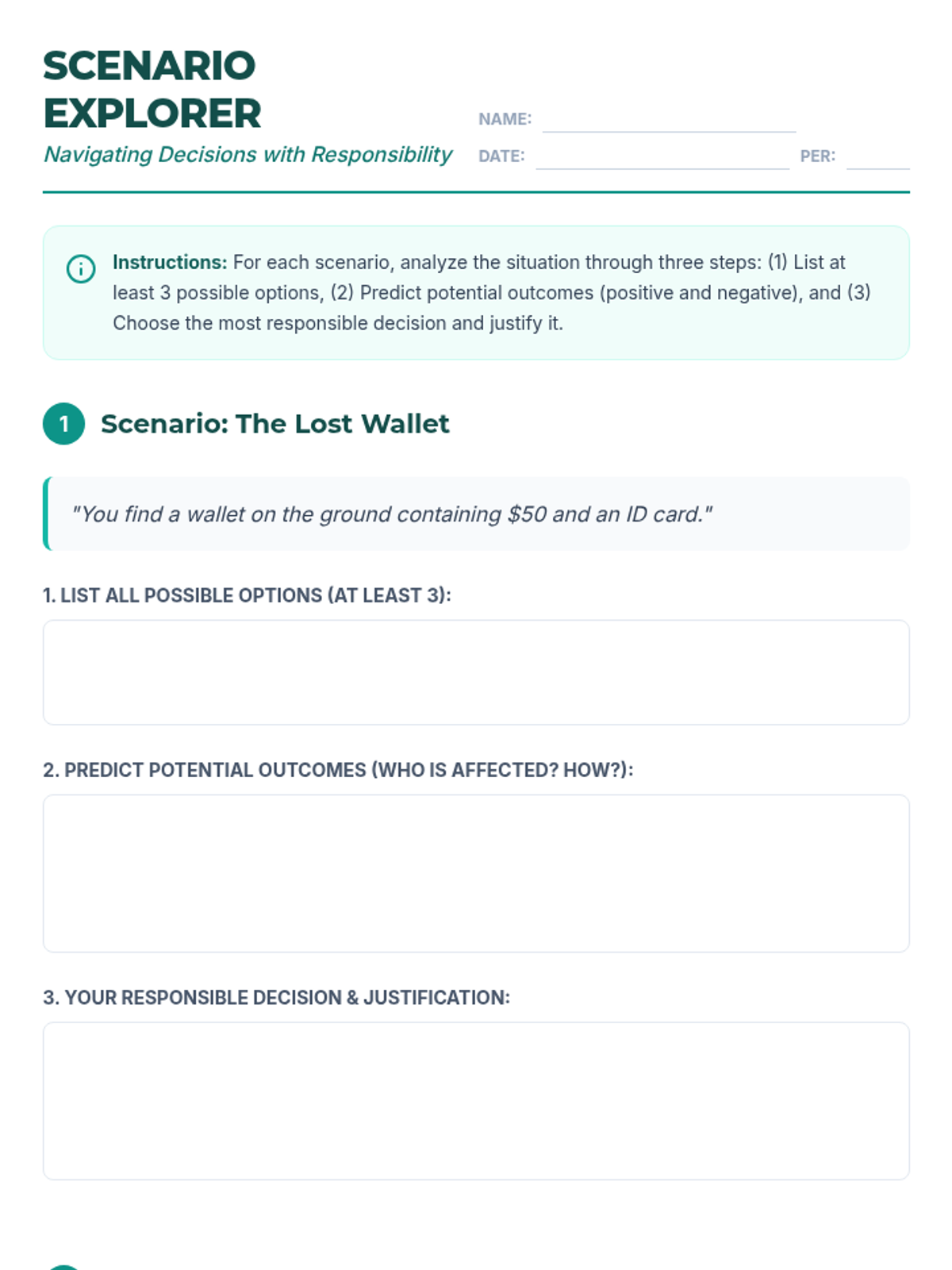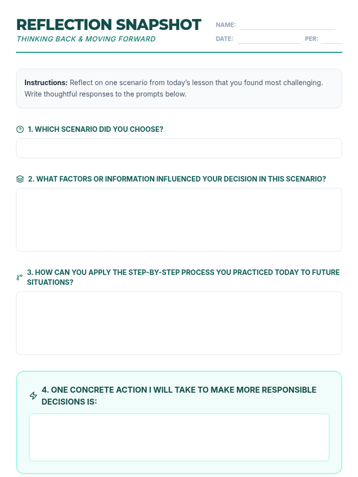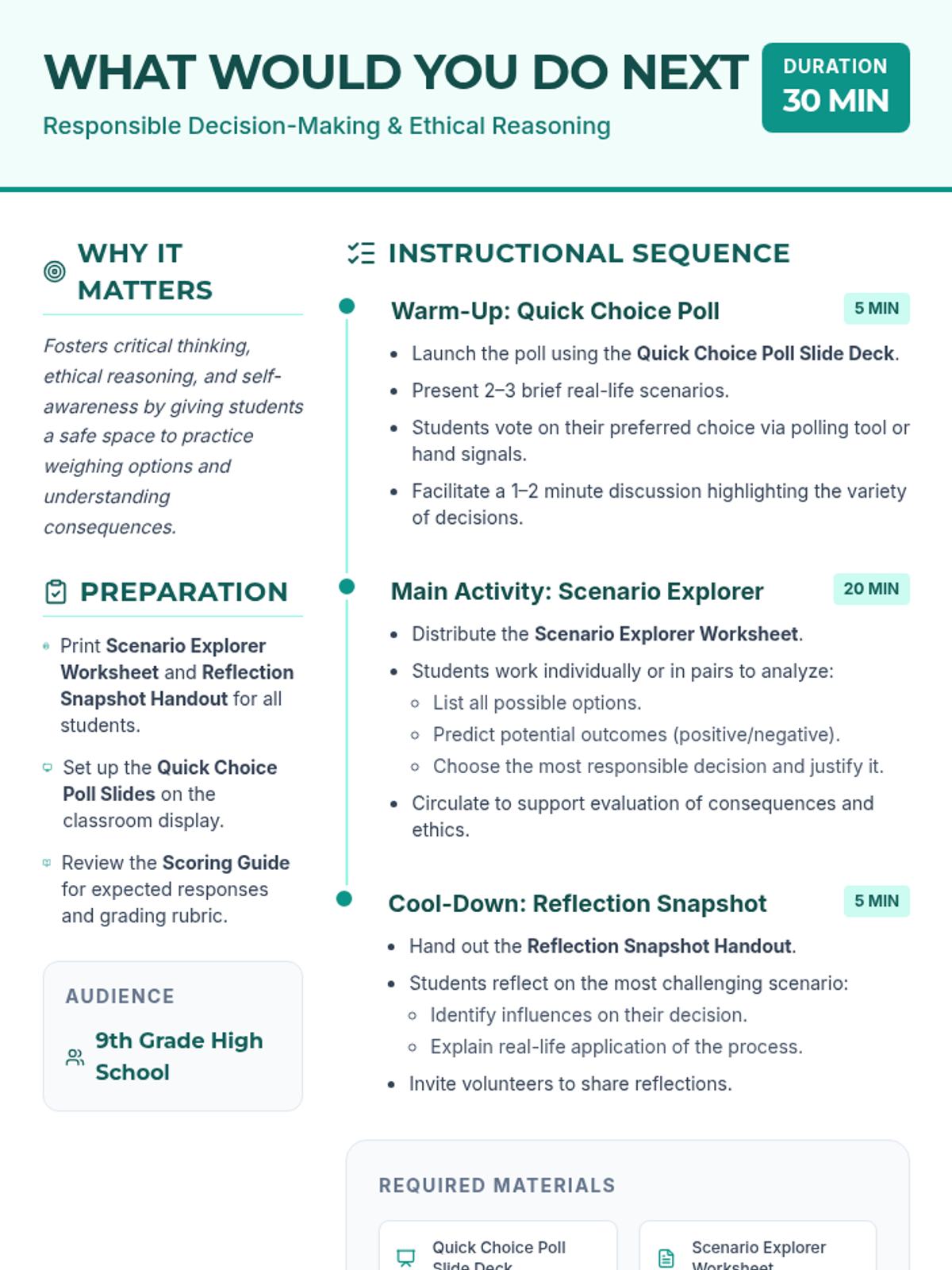 A 30-minute Tier 1 lesson for 9th graders focusing on responsible decision-making through real-life scenarios. Students practice weighing options, predicting outcomes, and justifying their choices to build critical thinking and empathy.