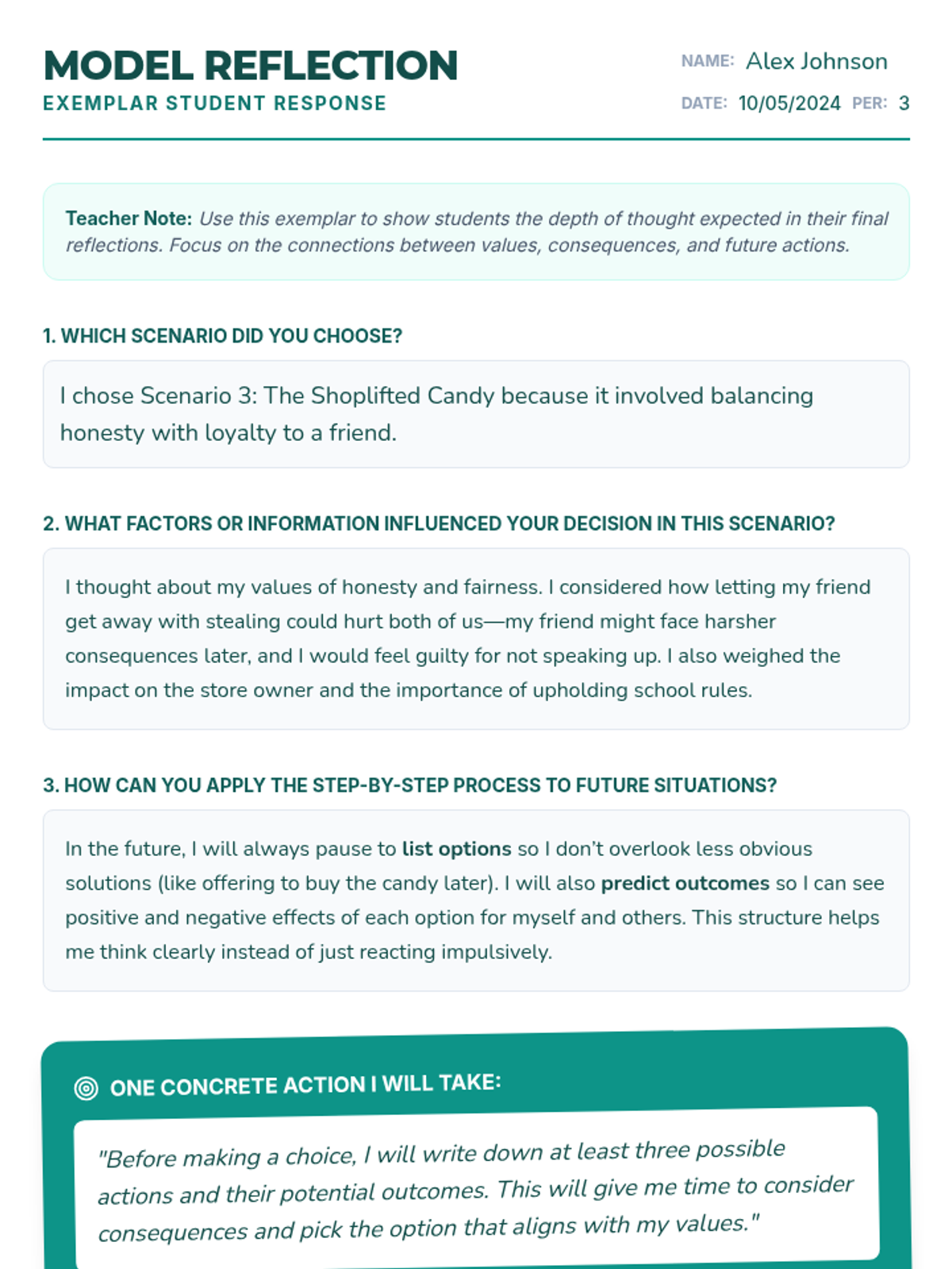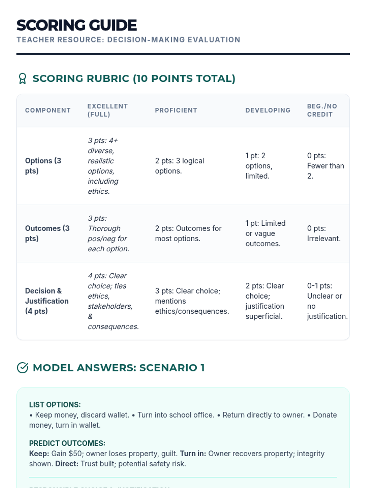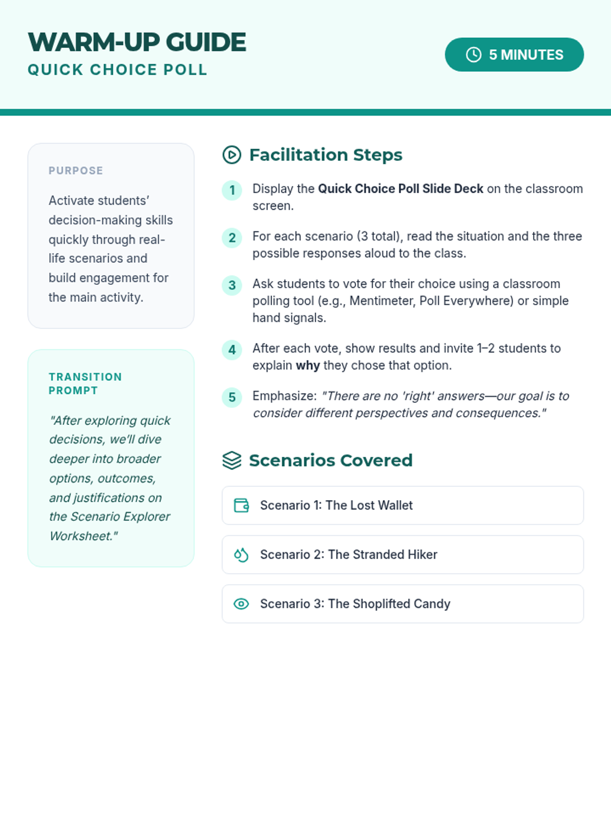 A 30-minute Tier 1 lesson for 9th graders focusing on responsible decision-making through real-life scenarios. Students practice weighing options, predicting outcomes, and justifying their choices to build critical thinking and empathy.