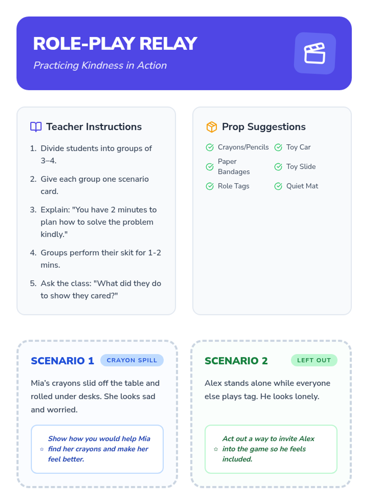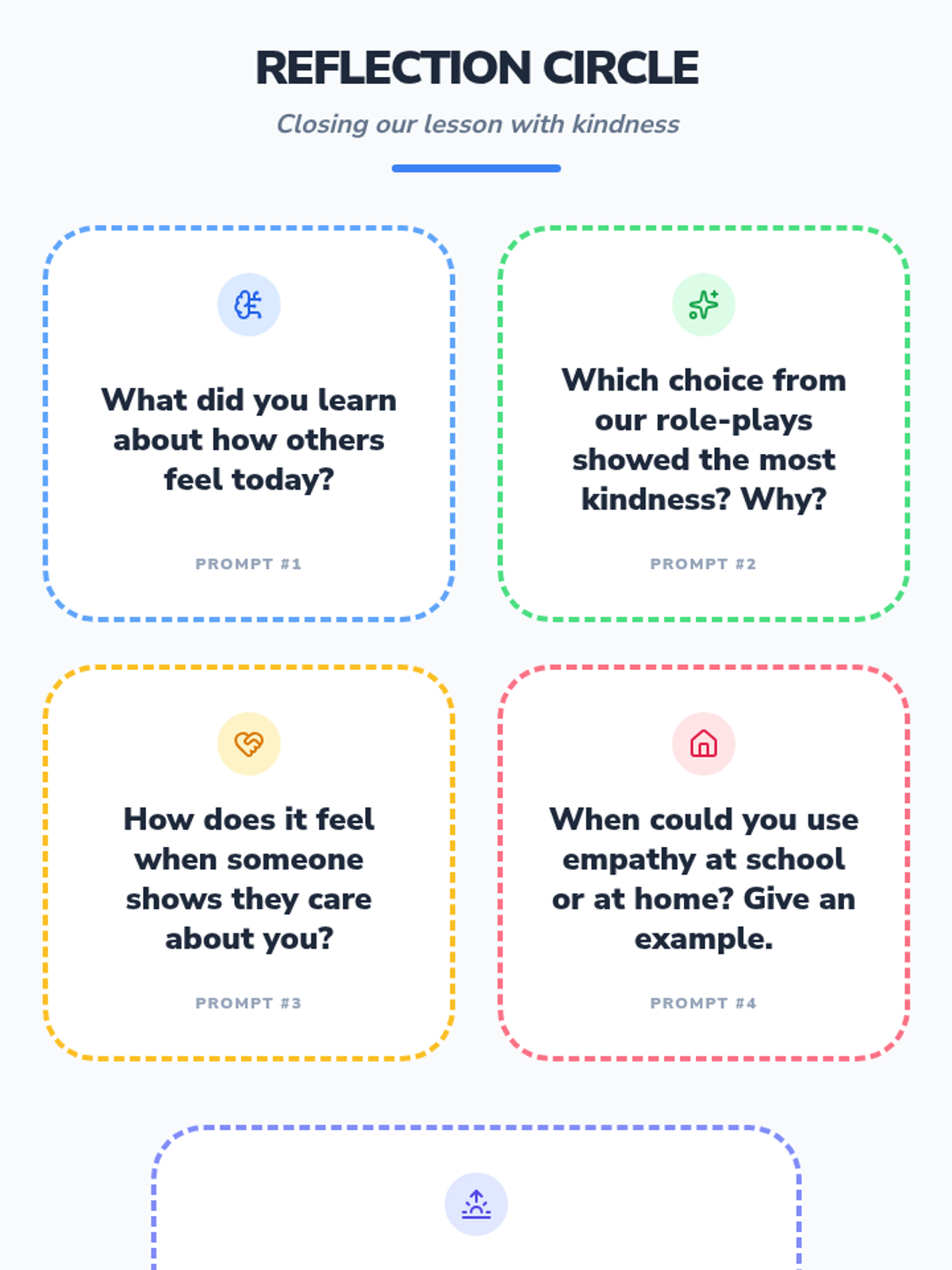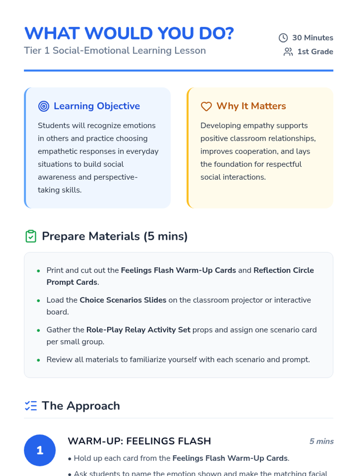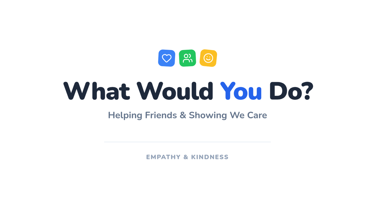 A 30-minute Tier 1 SEL lesson for 1st graders focused on empathy, perspective-taking, and responding to social situations with kindness. Students use flashcards, interactive slides, and role-play to practice identifying emotions and choosing helpful actions.
