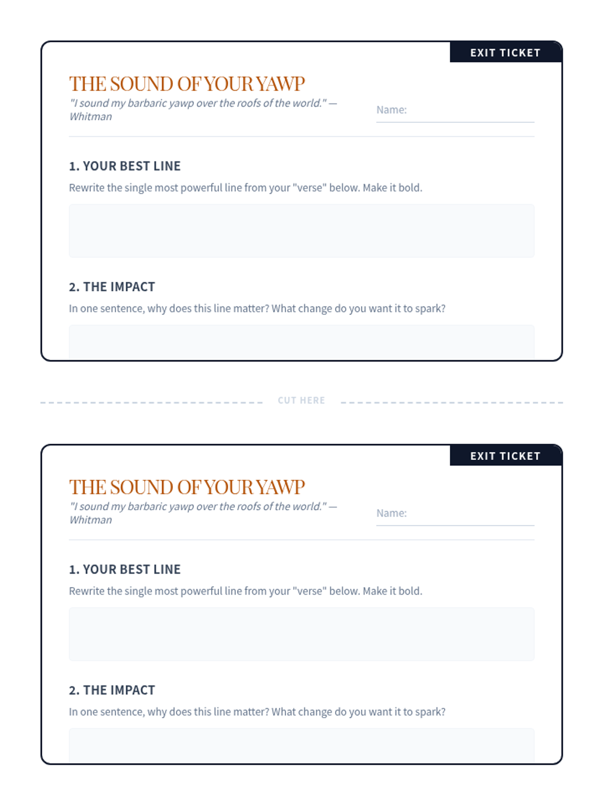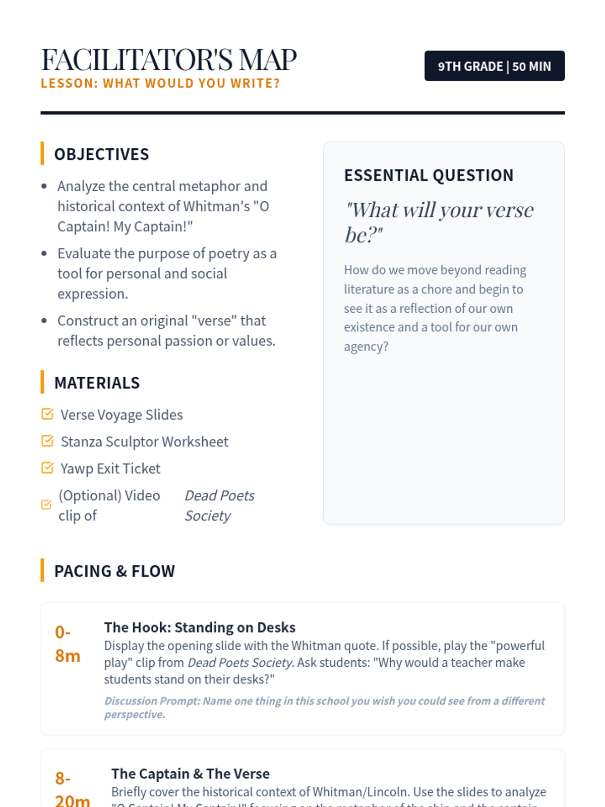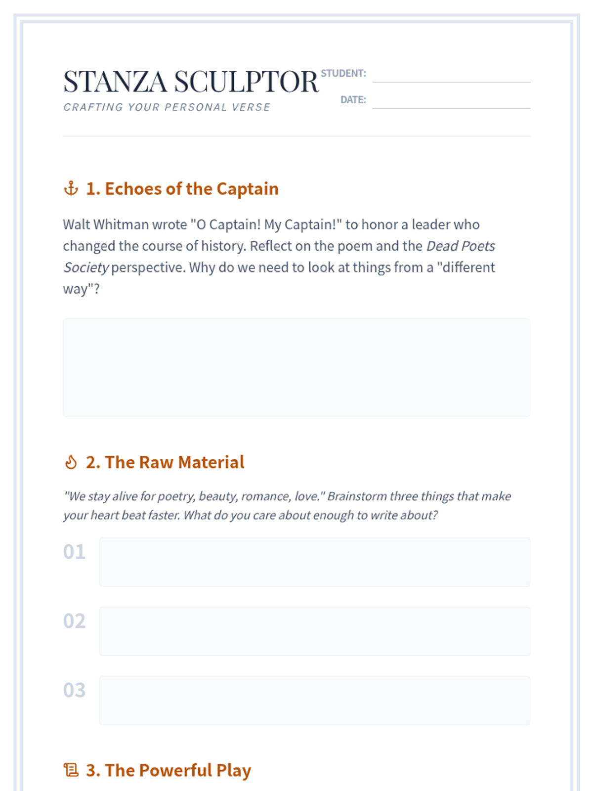 Students explore the impact of poetry through the context of Walt Whitman's 'O Captain! My Captain!' and the 'Dead Poets Society' scene, eventually crafting their own 'verse' to contribute to the 'powerful play' of life.