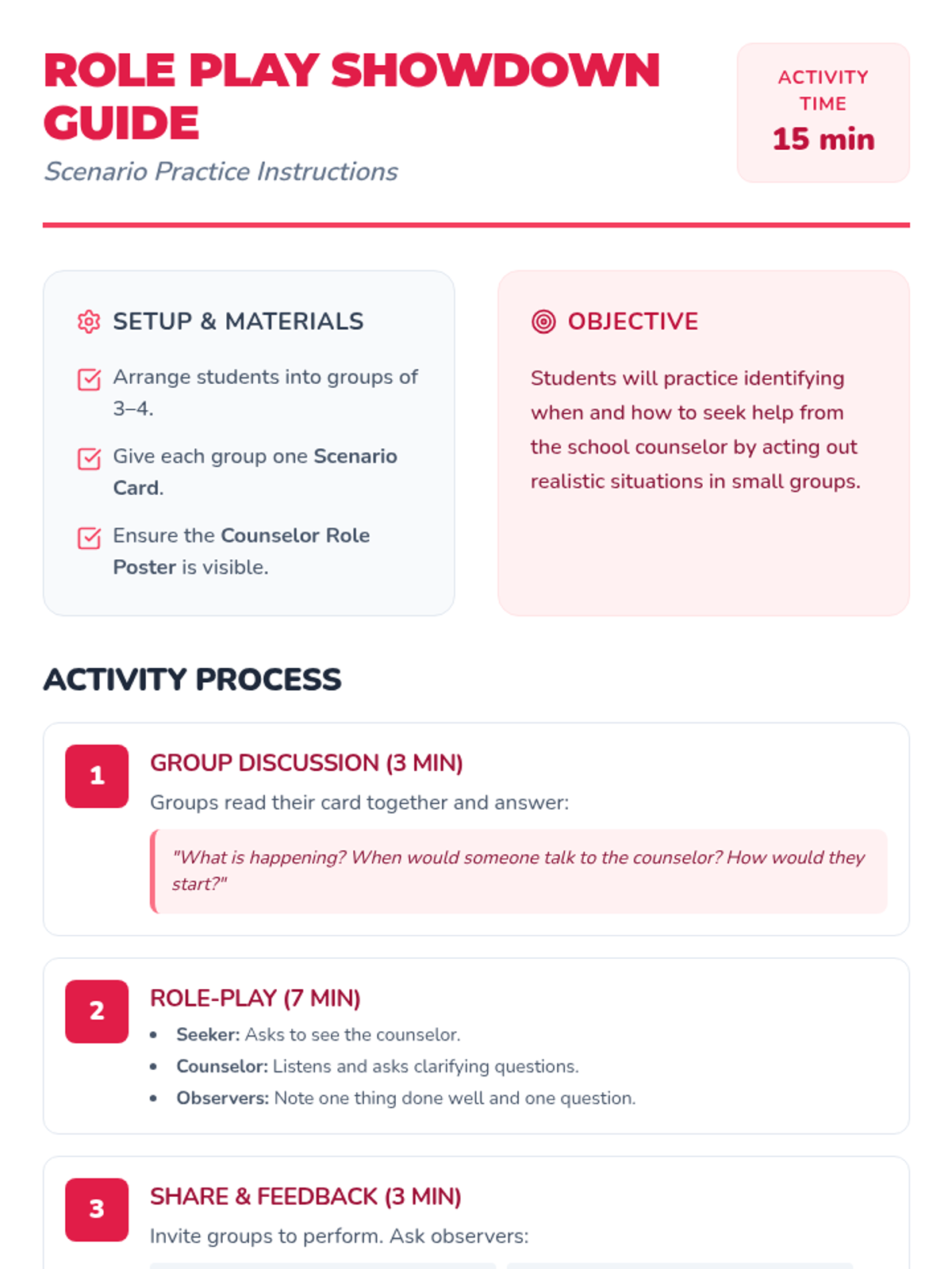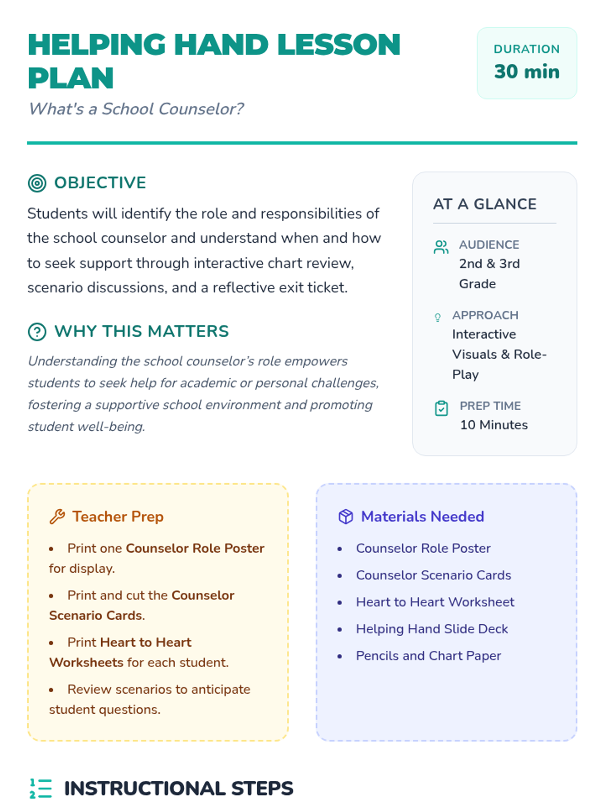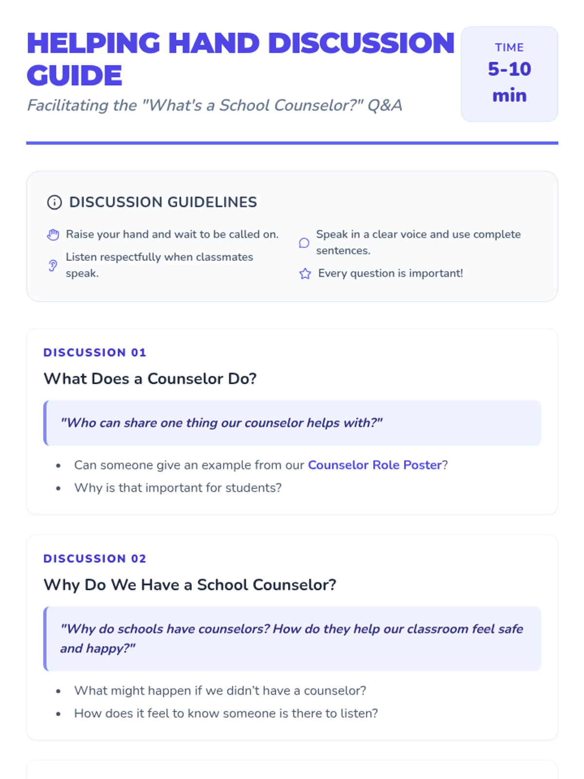 A 30-minute Tier 1 classroom lesson for 2nd and 3rd graders to understand the role of the school counselor and learn how to seek support.