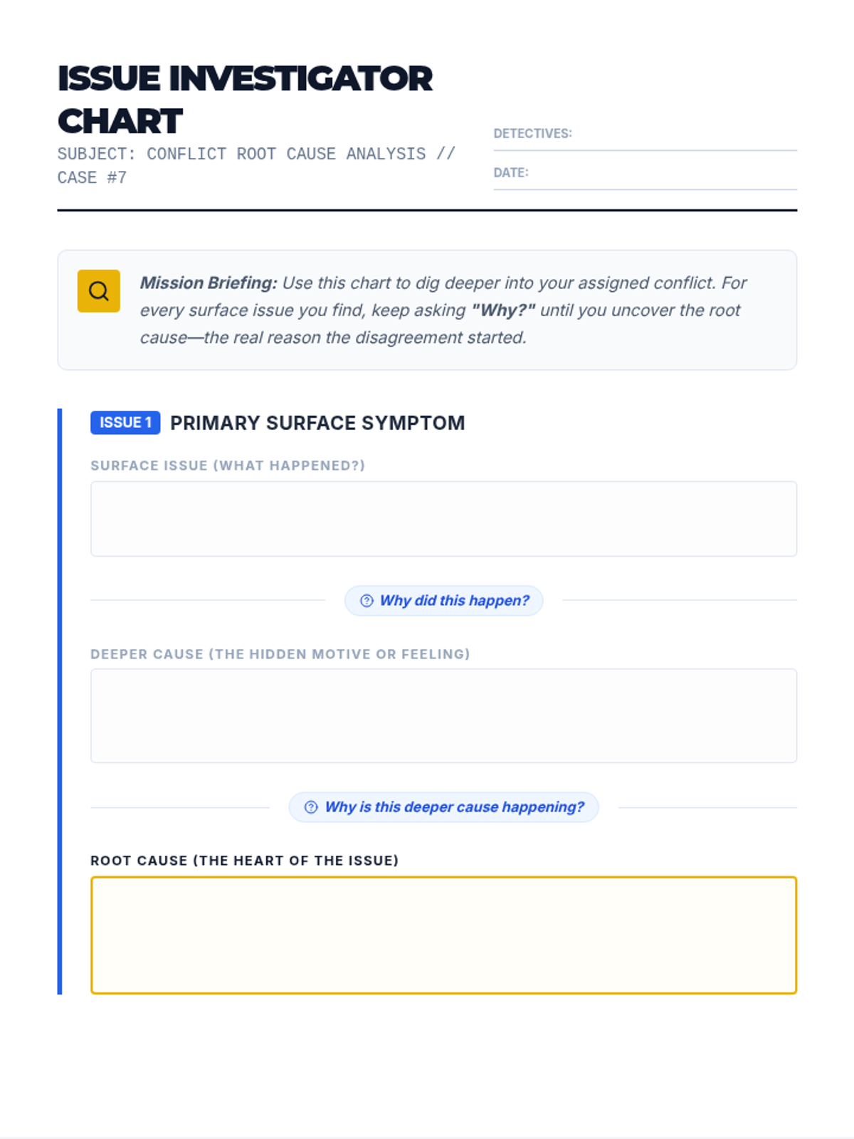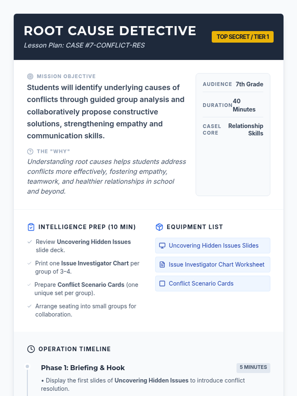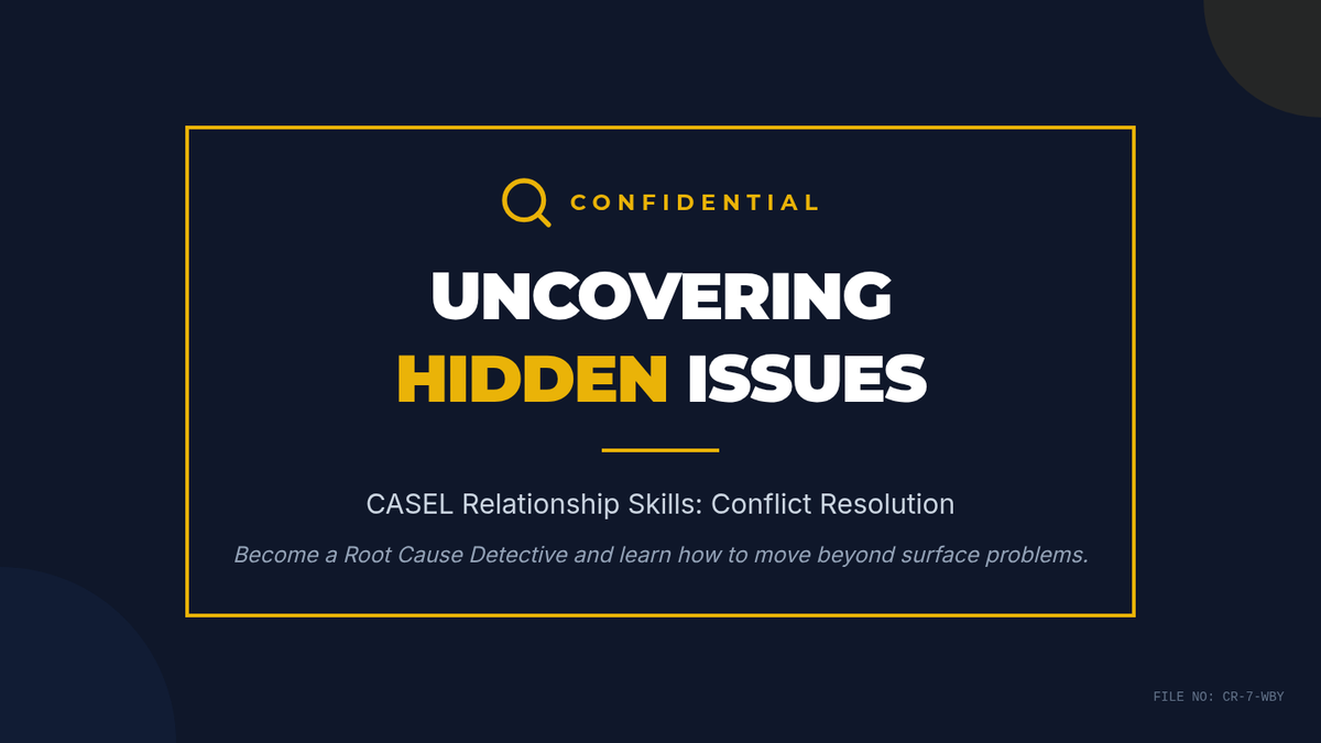 Students will learn to identify the hidden root causes of conflicts, practice active listening, and collaboratively propose constructive solutions to real-life disagreements. This 40-minute Tier 1 lesson strengthens CASEL Relationship Skills.
