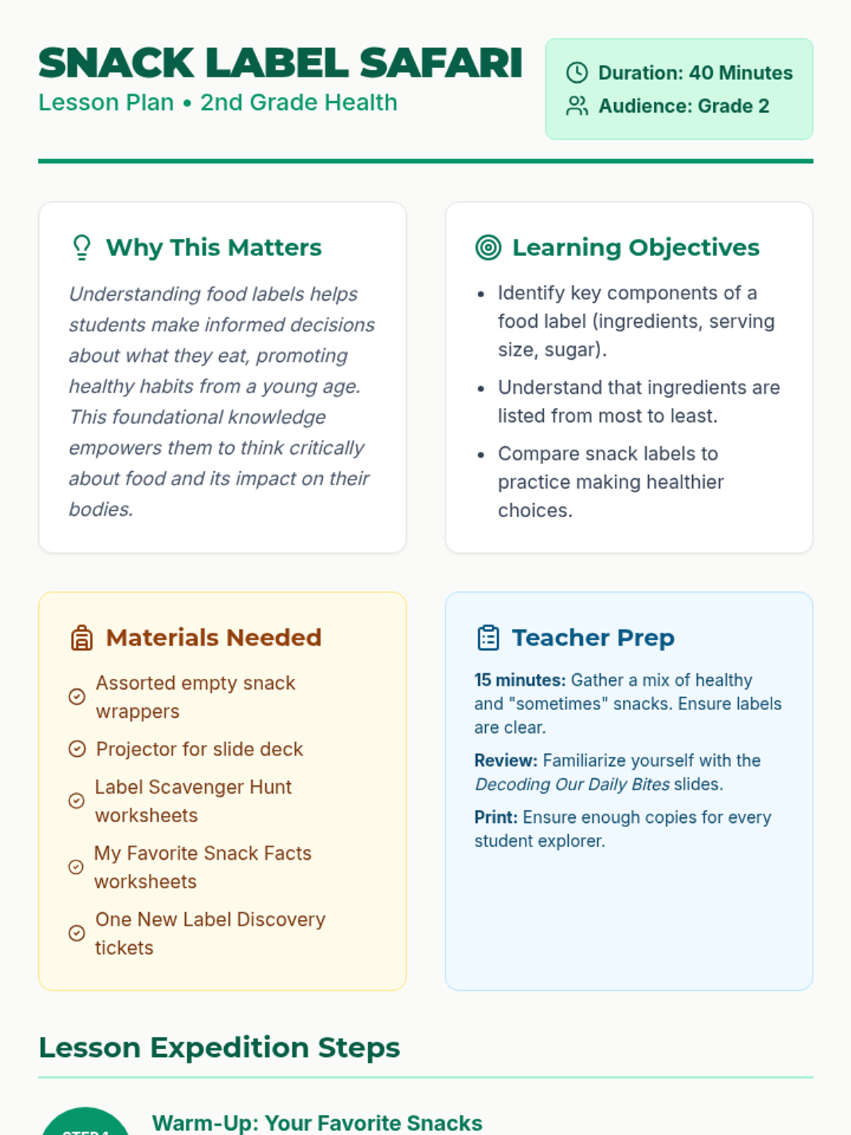 An introductory lesson for 2nd graders on reading food labels, identifying ingredients, and making healthier snack choices through a 'Safari' themed exploration.
