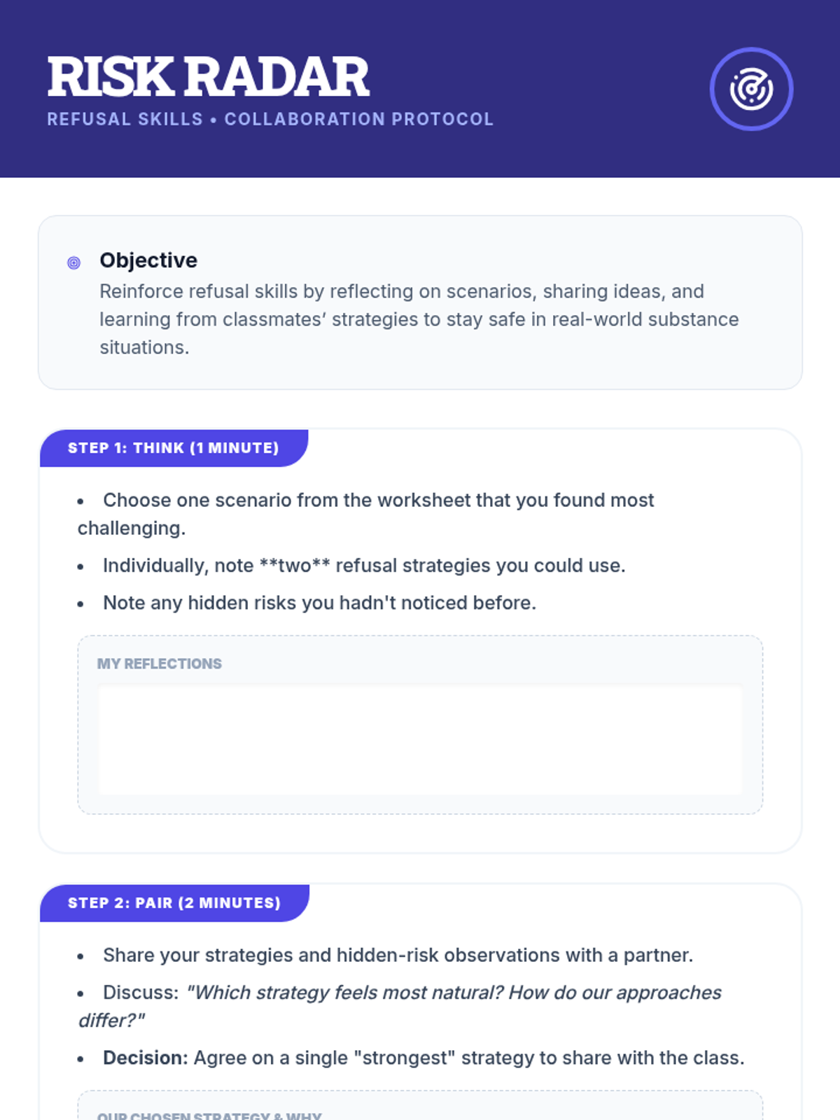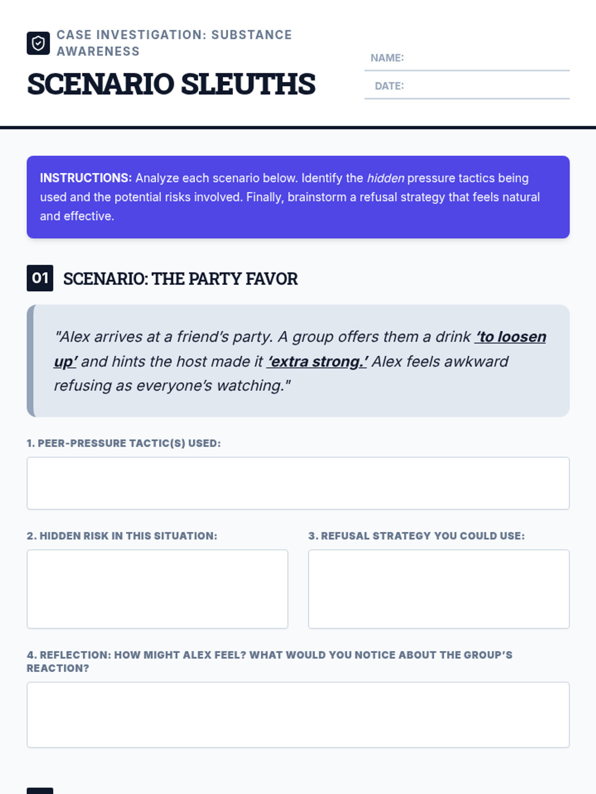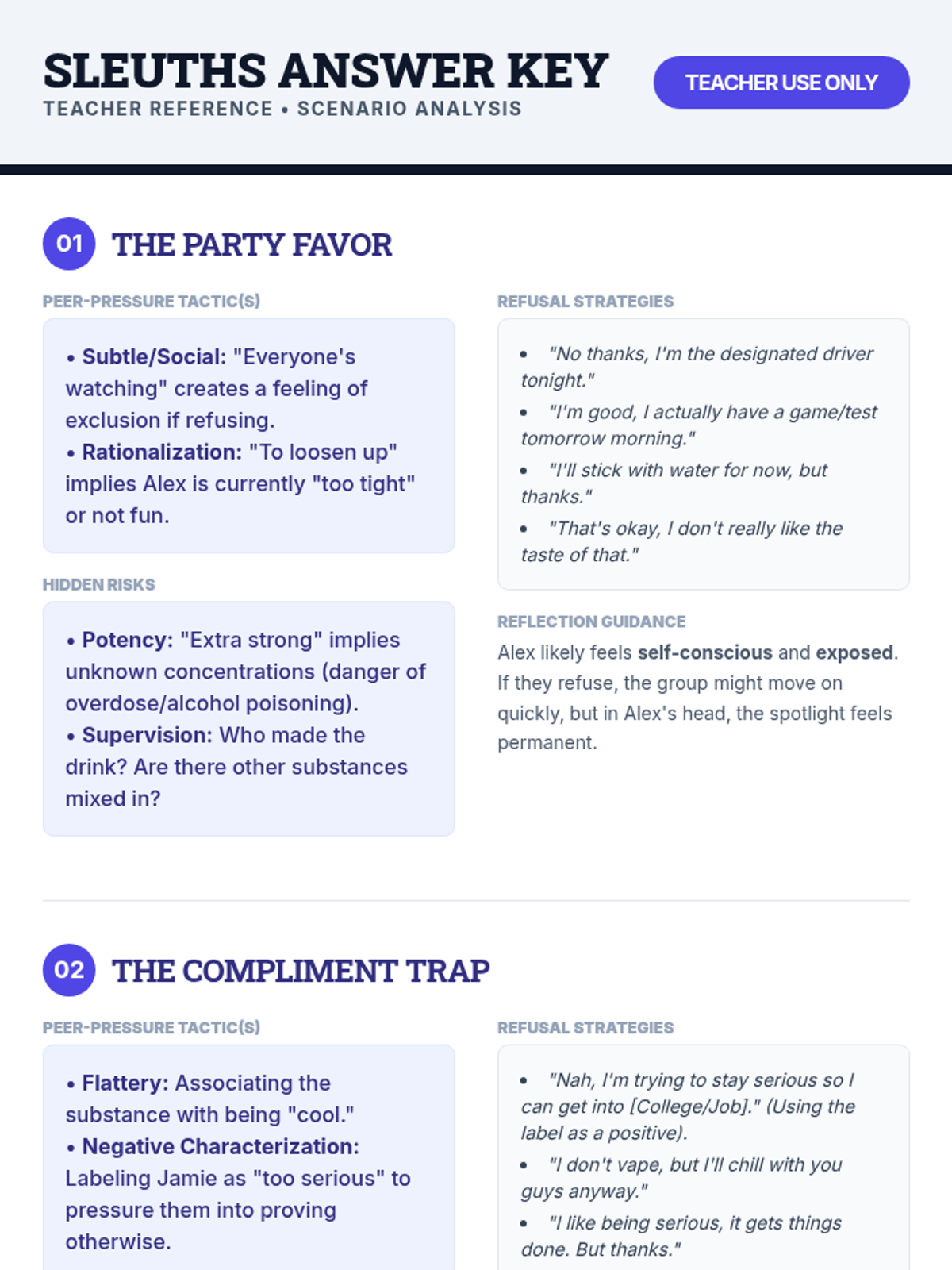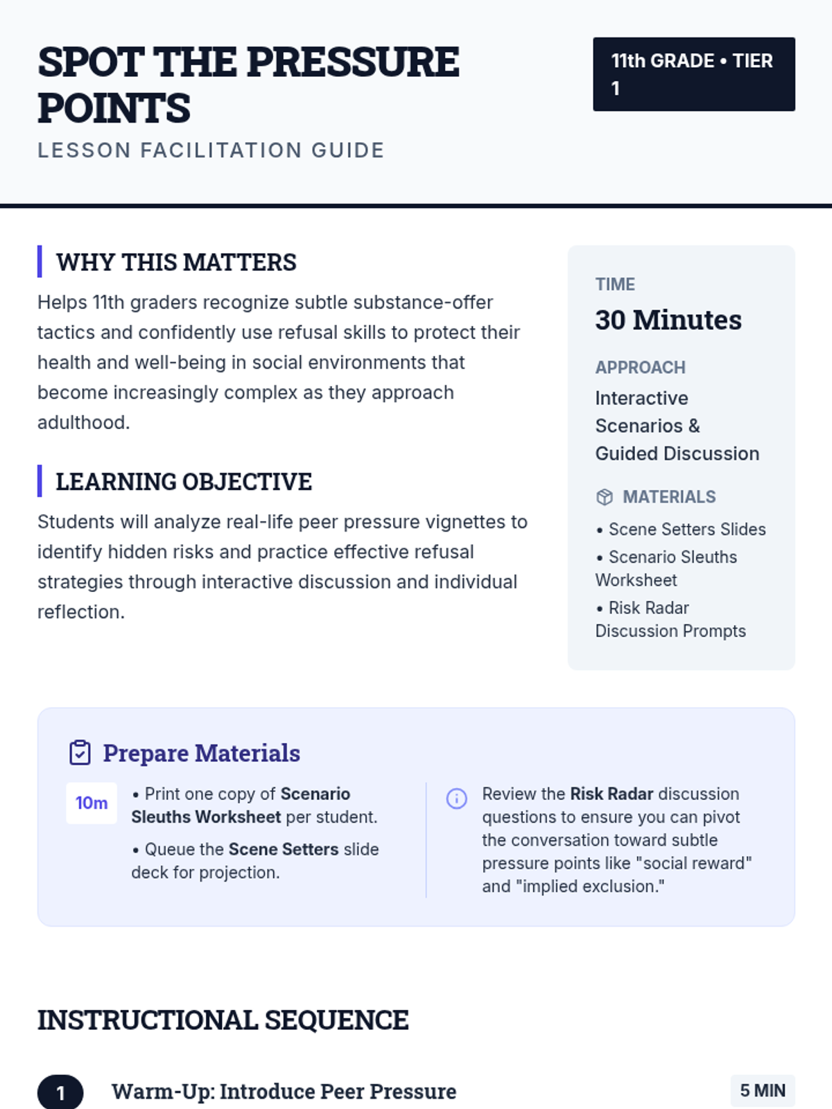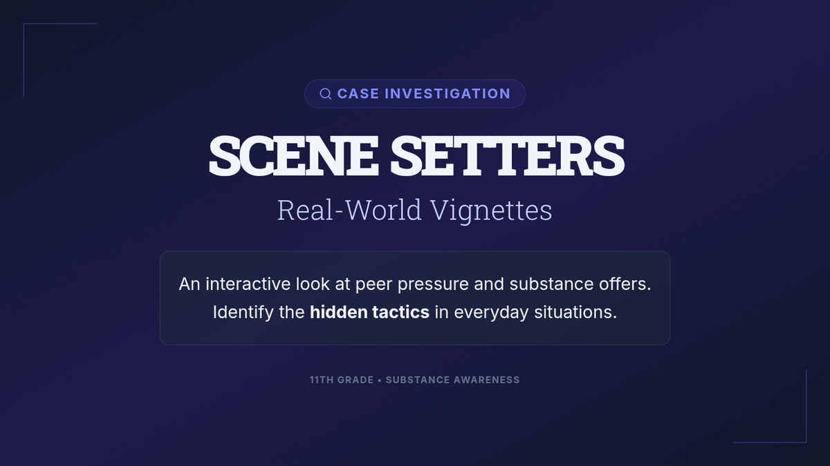 A 30-minute Tier 1 lesson for 11th graders that uses interactive vignettes and collaborative analysis to help students identify subtle peer pressure tactics and practice effective refusal skills for substance offers.