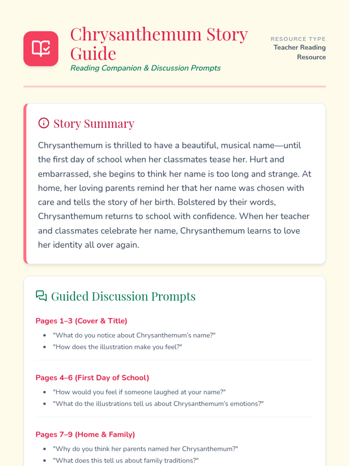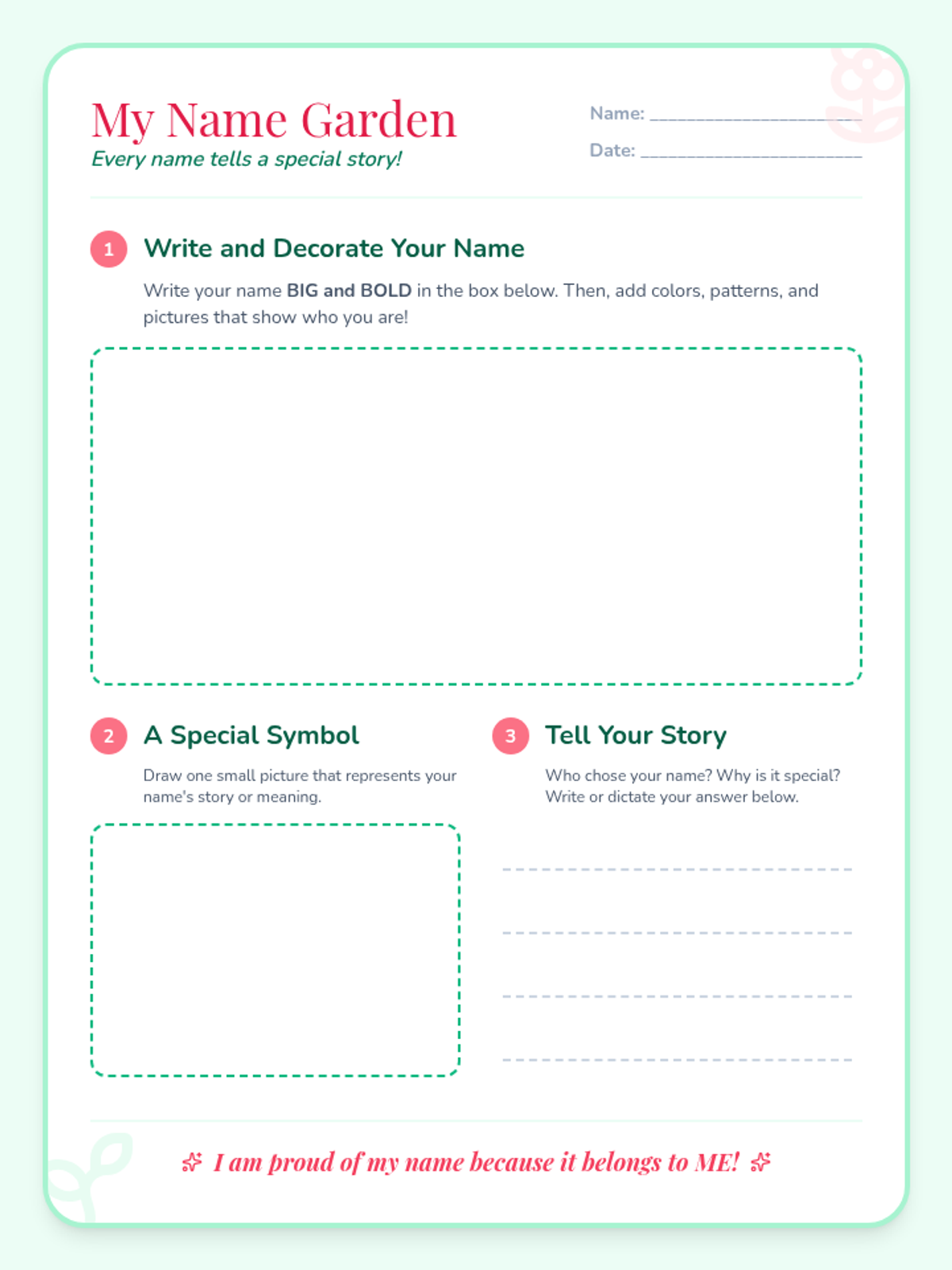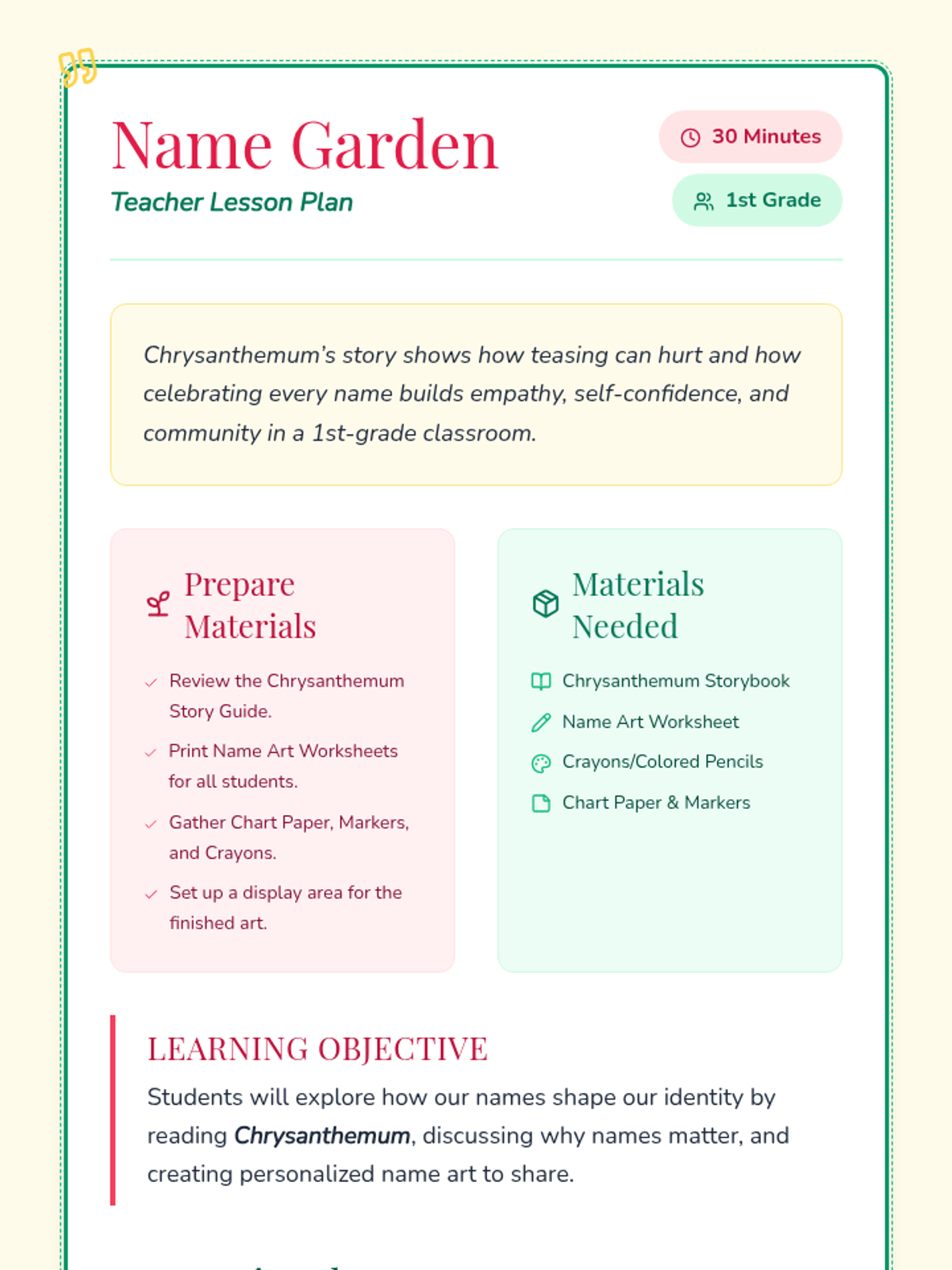 A 30-minute Tier 1 lesson for 1st graders exploring identity and self-worth through the story 'Chrysanthemum'. Students discuss the importance of names and create personalized name art to build classroom community.