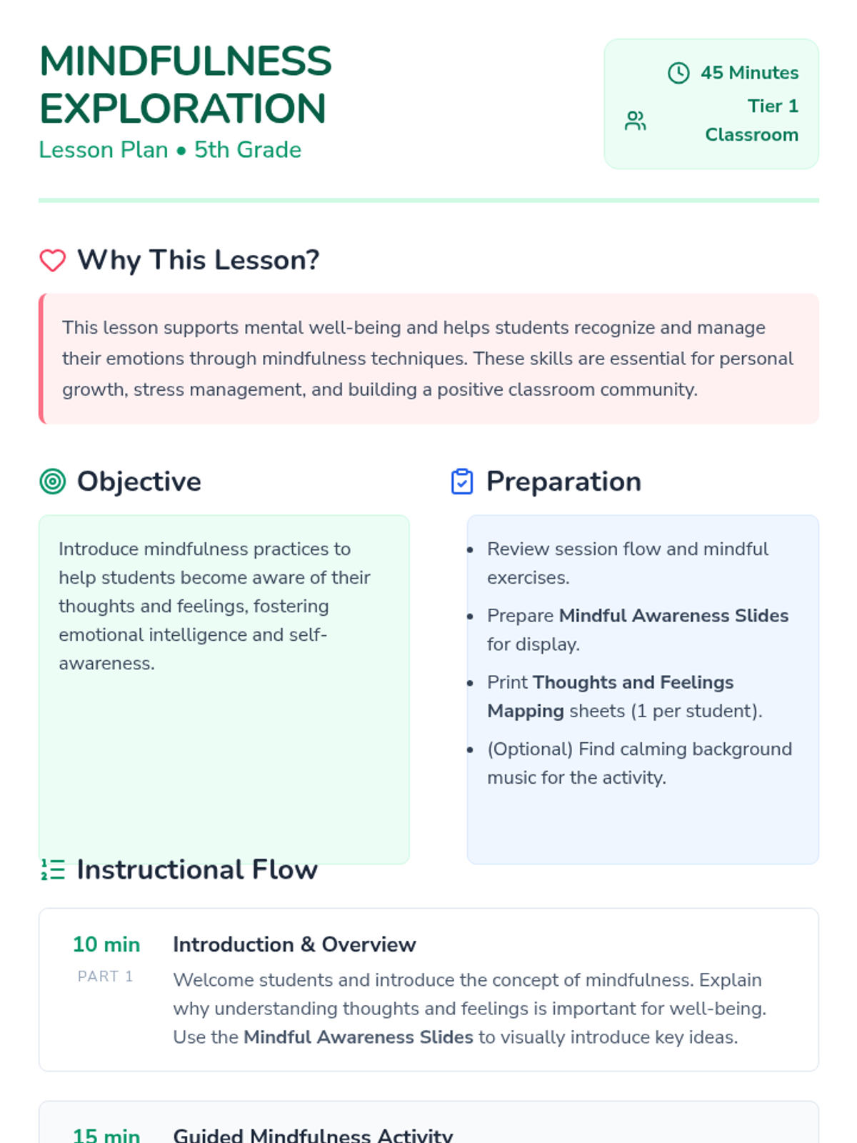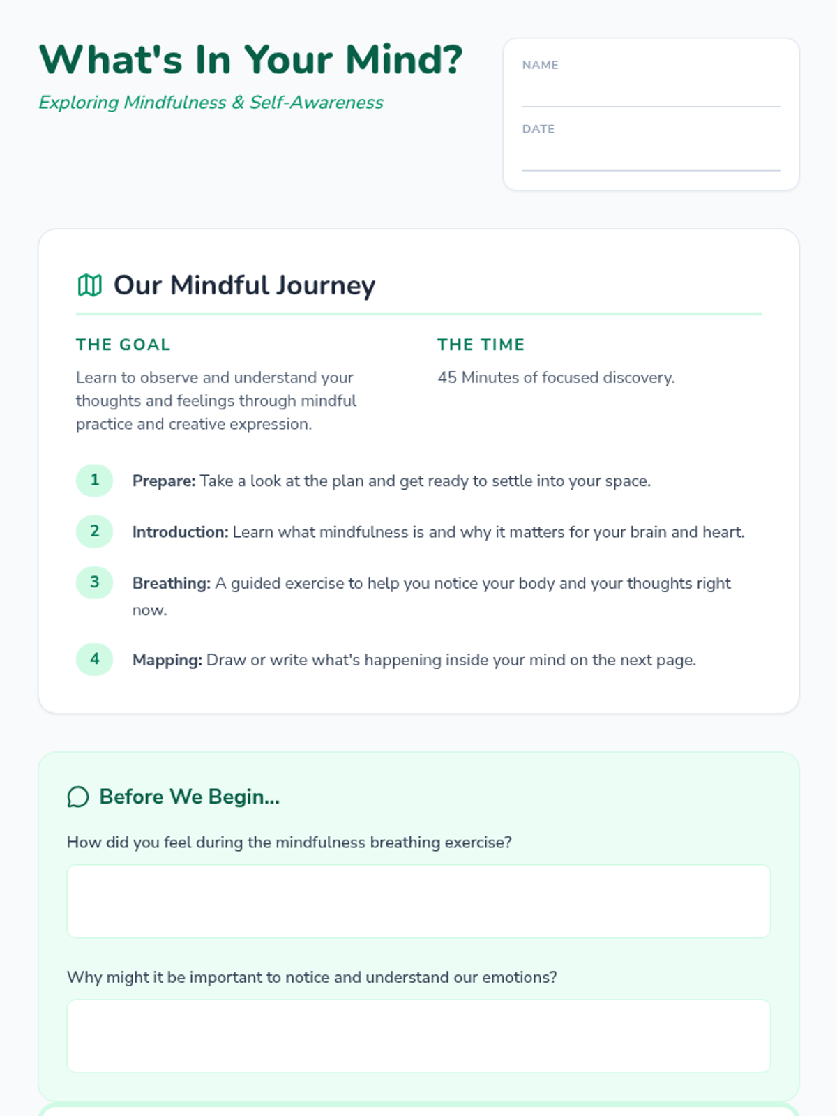 Explore the concept of mindfulness through engaging activities that help students become aware of their thoughts and feelings. This lesson is designed for a 5th-grade class to foster emotional intelligence and self-awareness.
