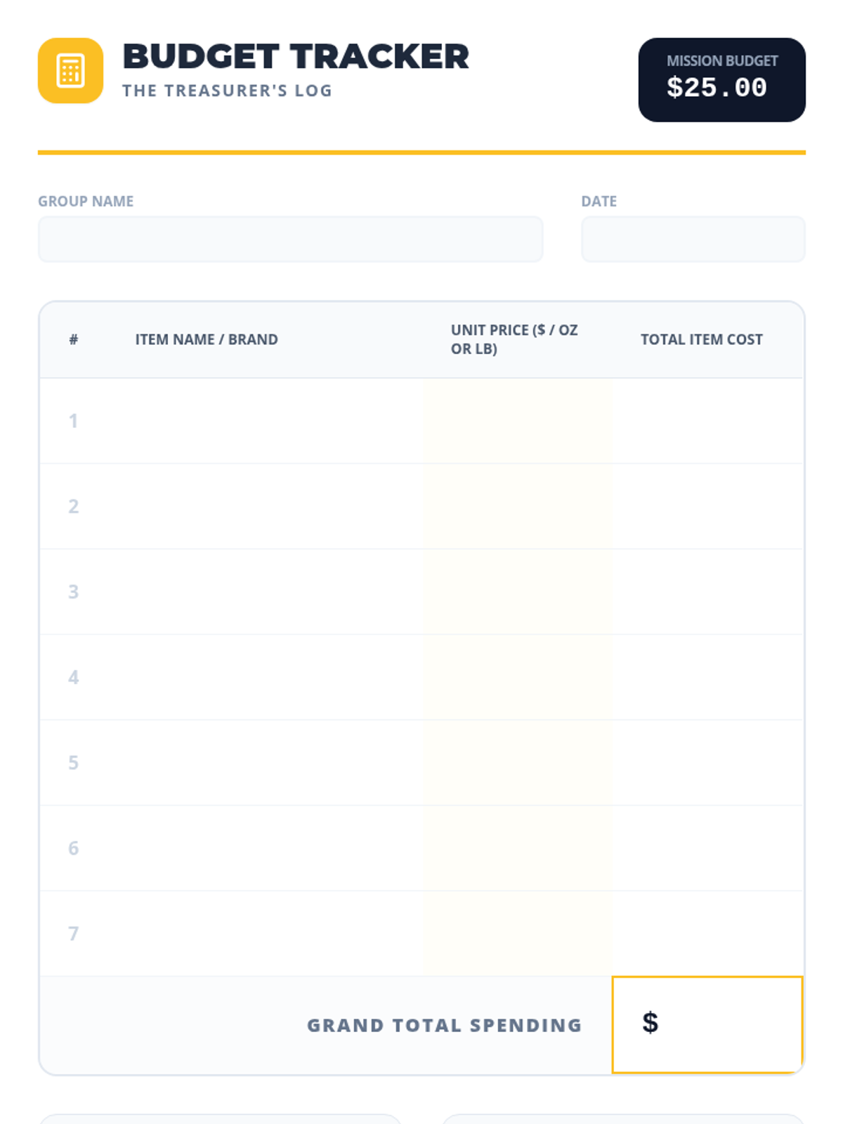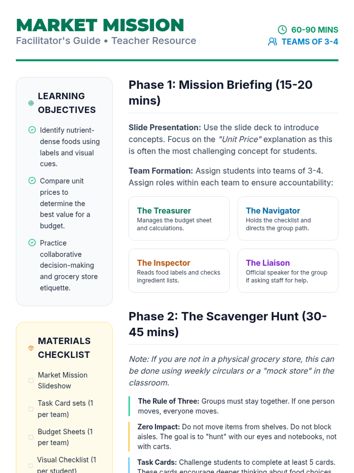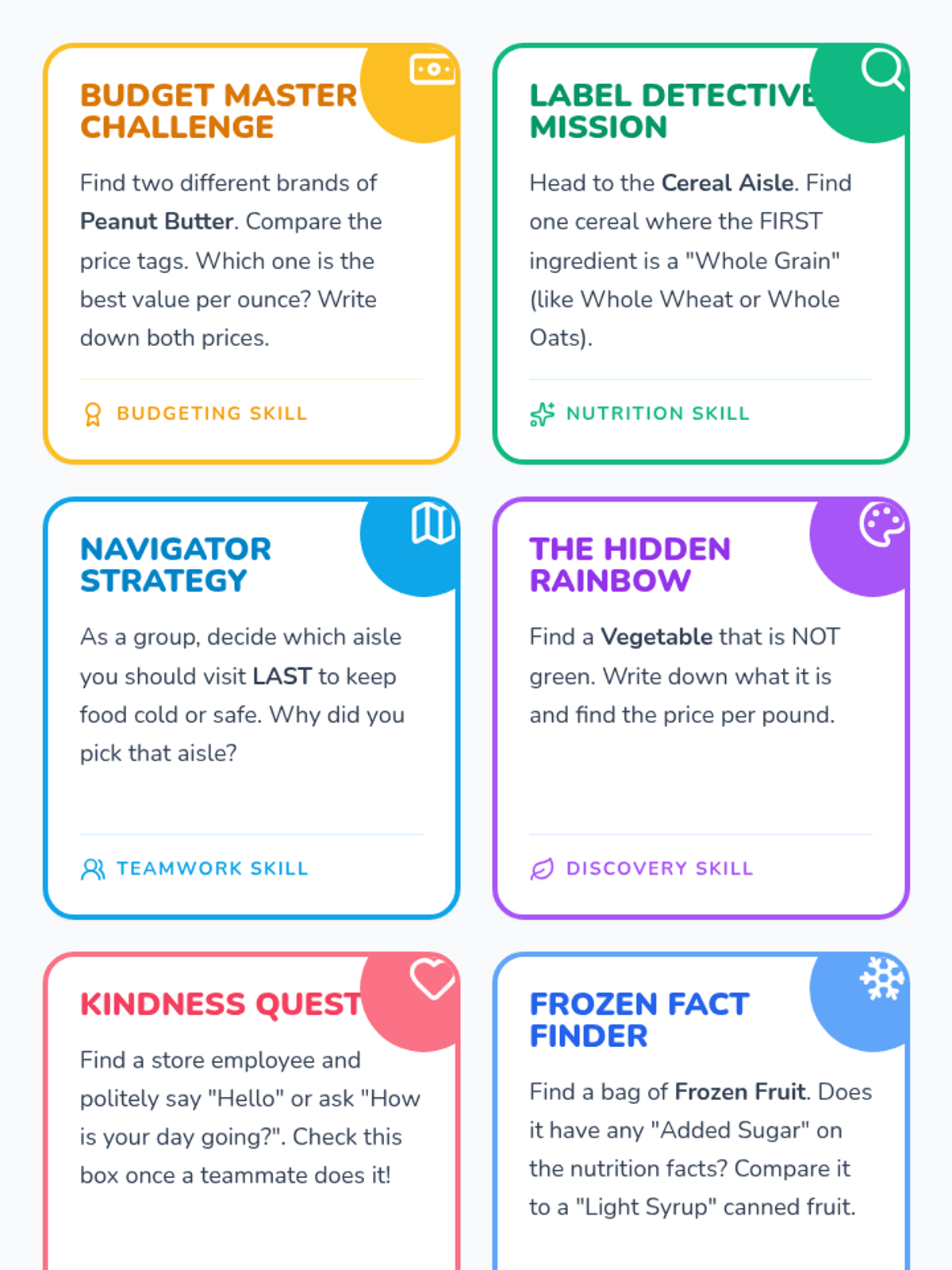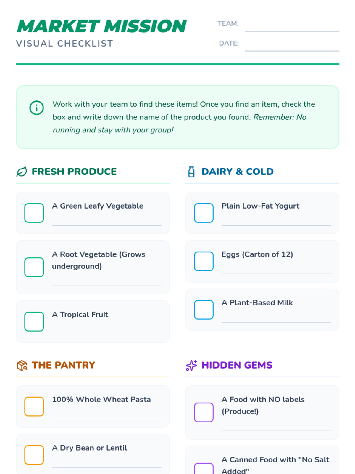 A group-building scavenger hunt where students work in teams to identify healthy foods, manage a budget, and practice social skills in a real-world grocery setting.
