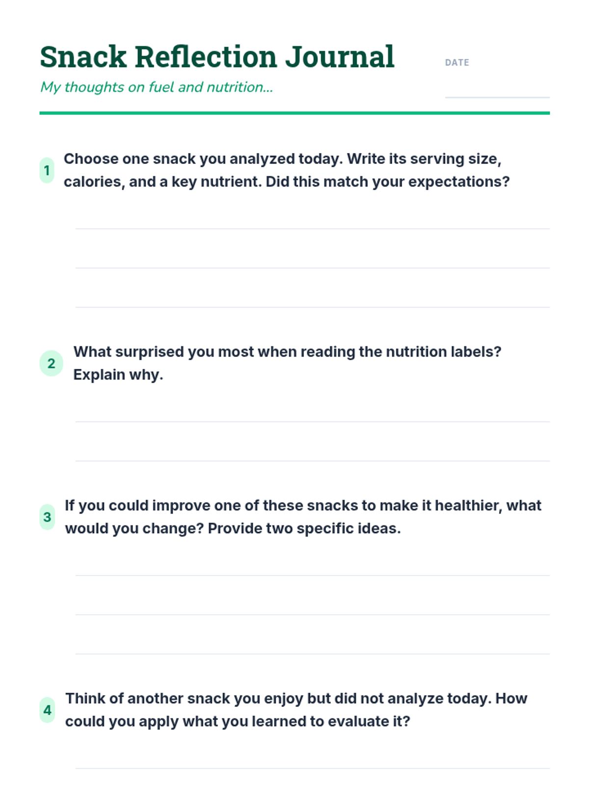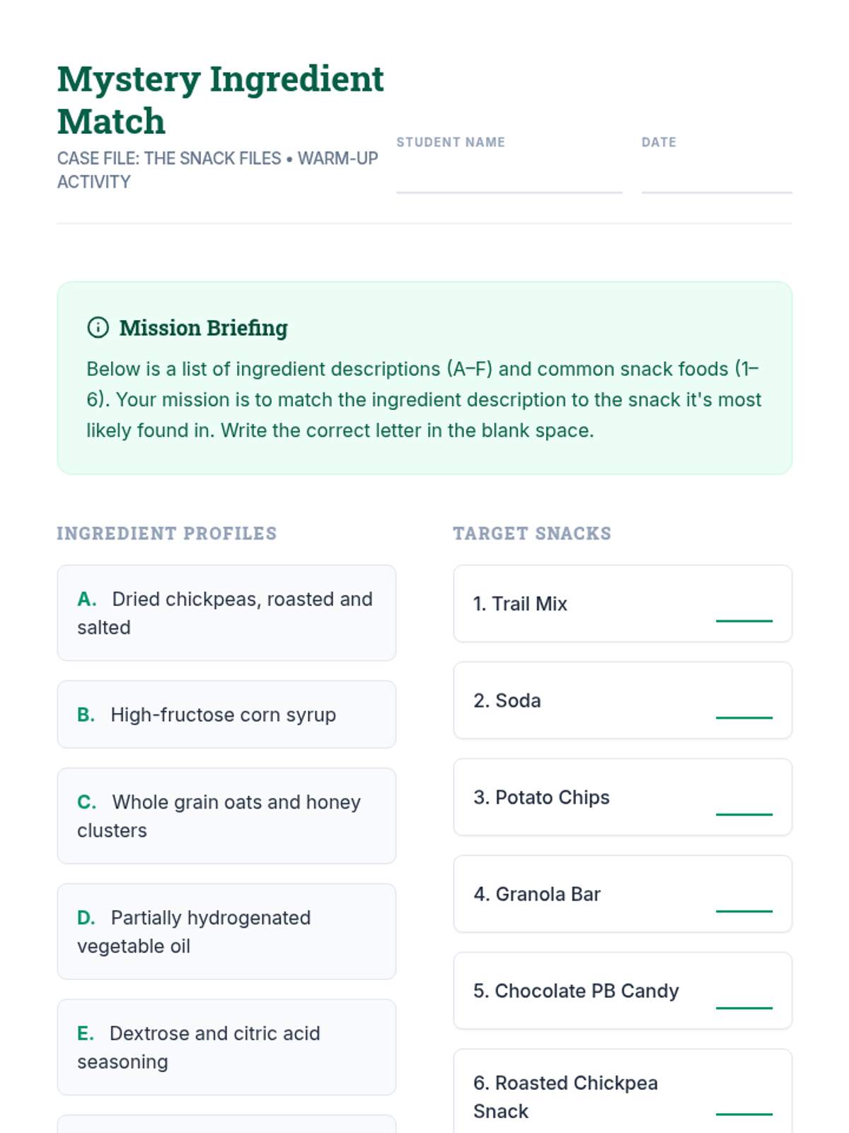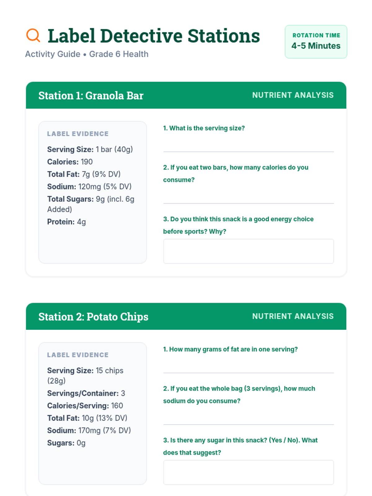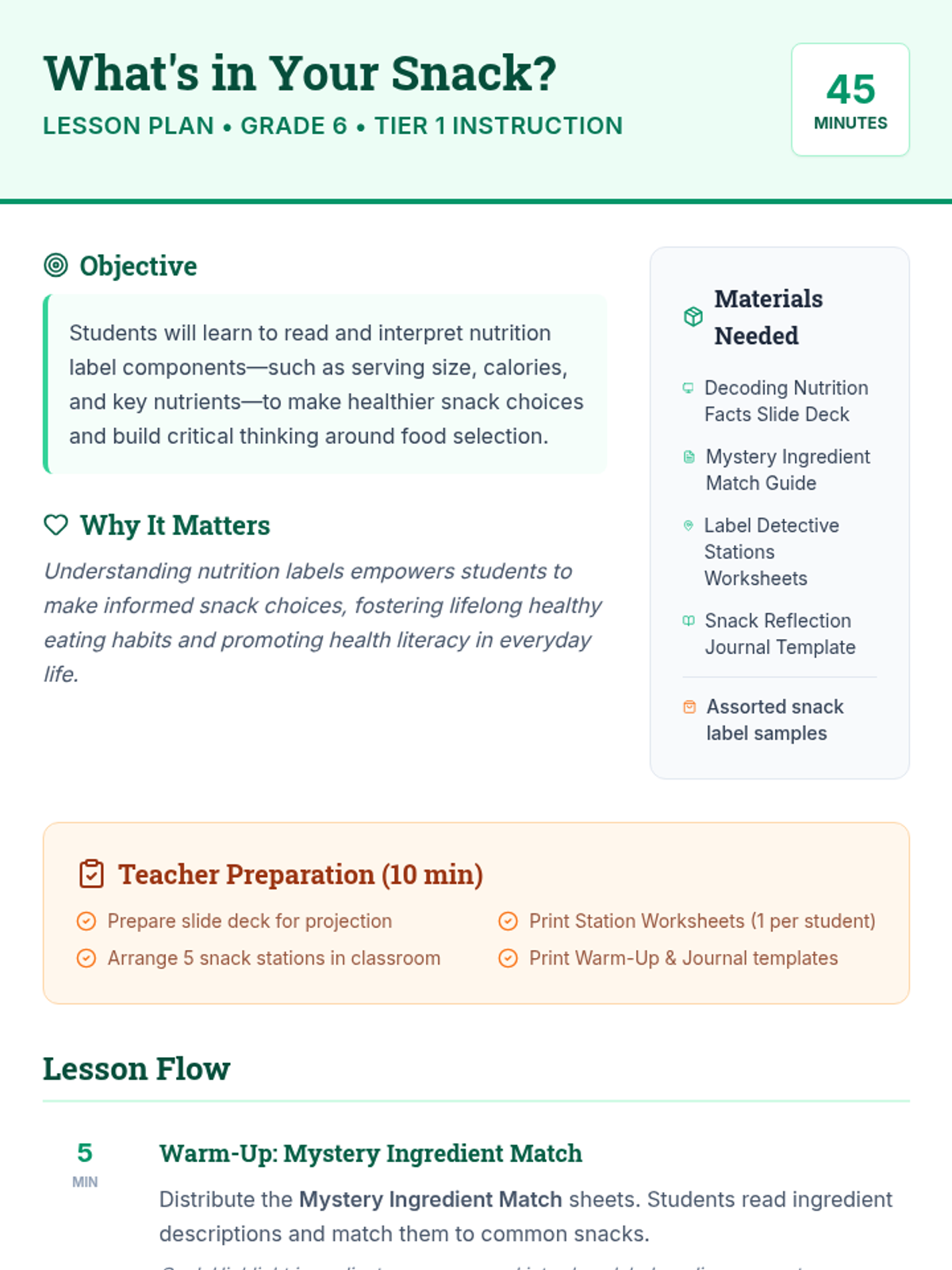 A 45-minute Tier 1 classroom lesson for 6th graders on decoding nutrition facts labels to make healthier snack choices through hands-on analysis and reflection.