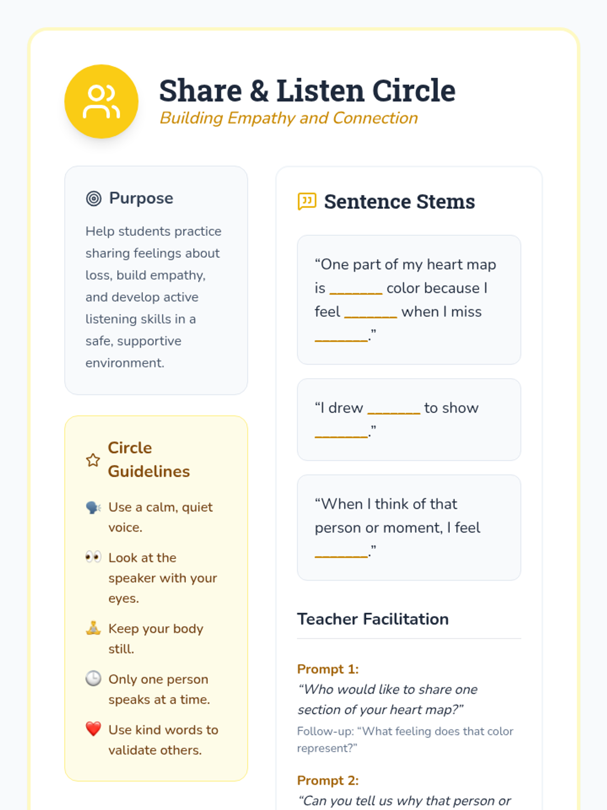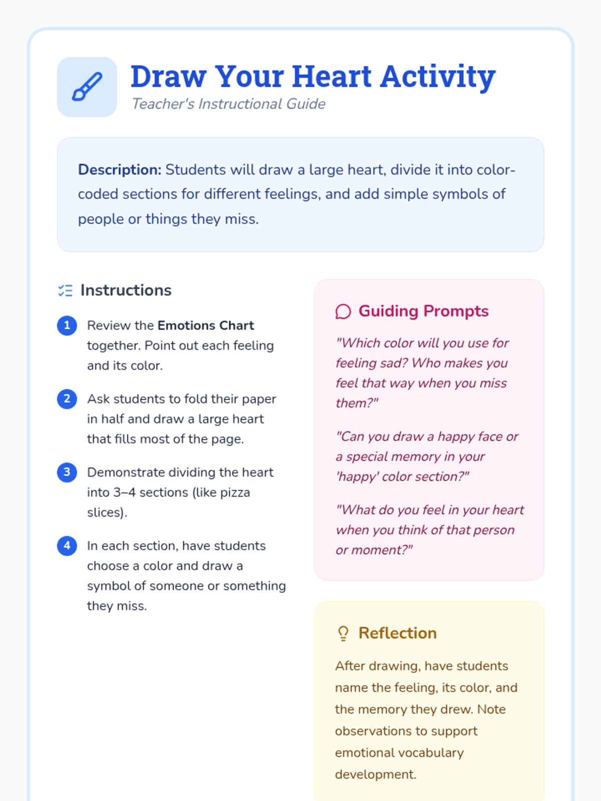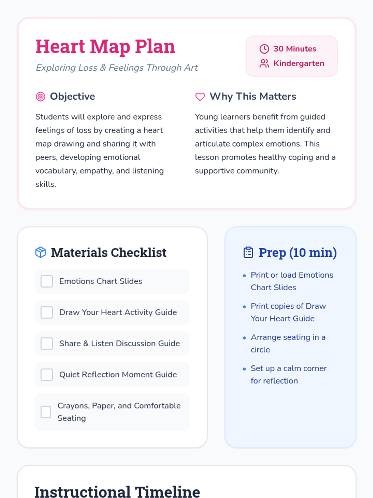 A gentle 30-minute lesson for kindergarteners to explore feelings of loss and sadness through color-coded heart mapping, sharing, and quiet reflection.