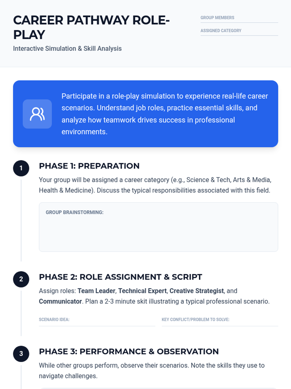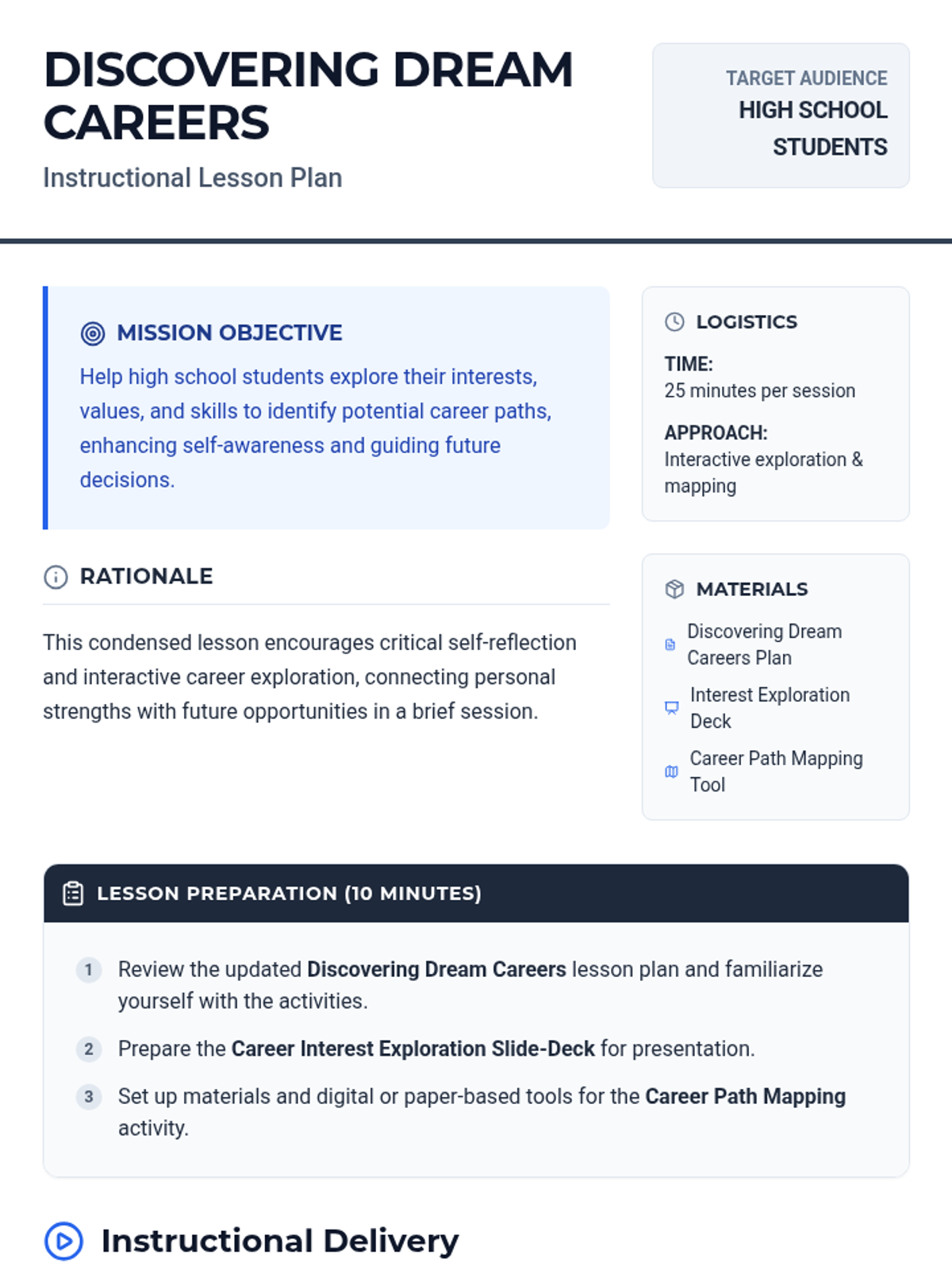 High school students will delve into their interests, values, and skills to identify potential career paths. This lesson enhances self-awareness and aligns career exploration with personal strengths, preparing students for future career decisions.