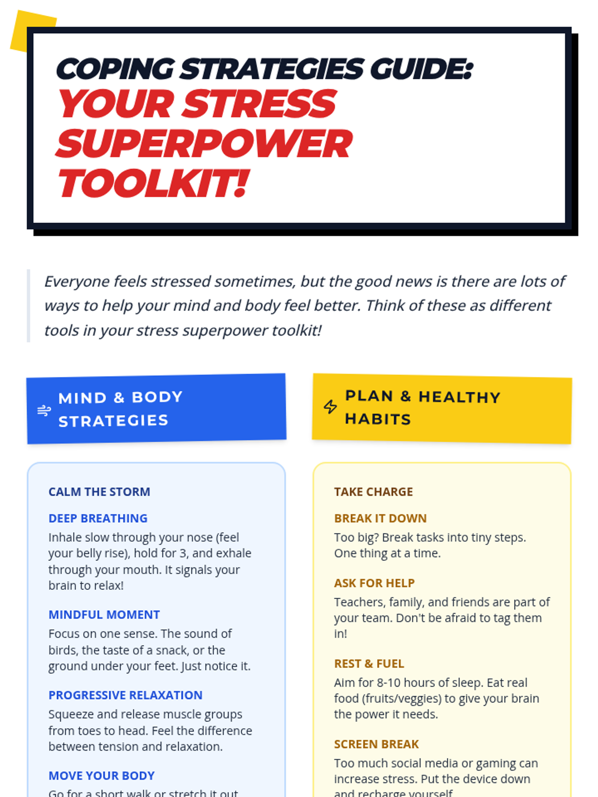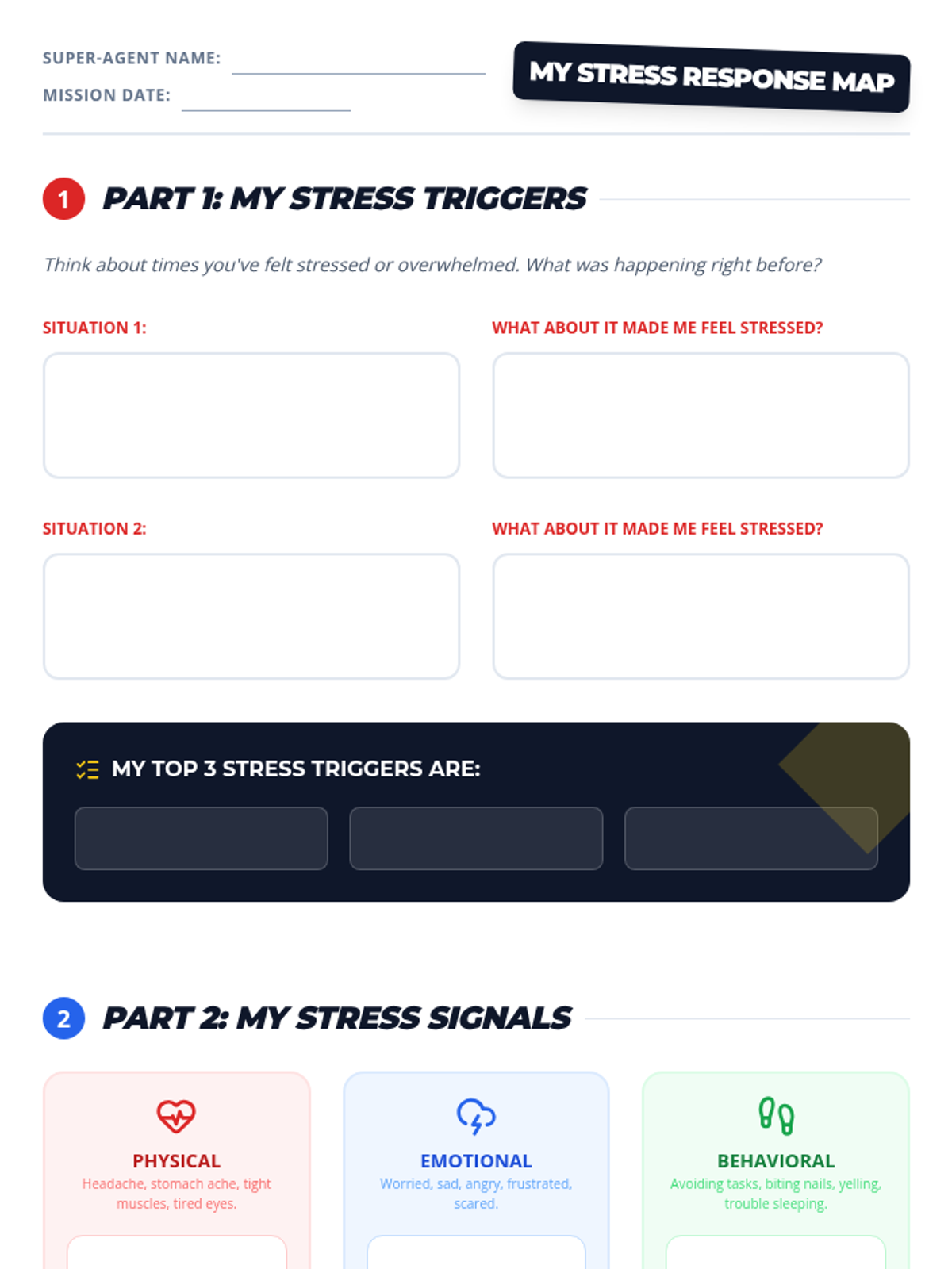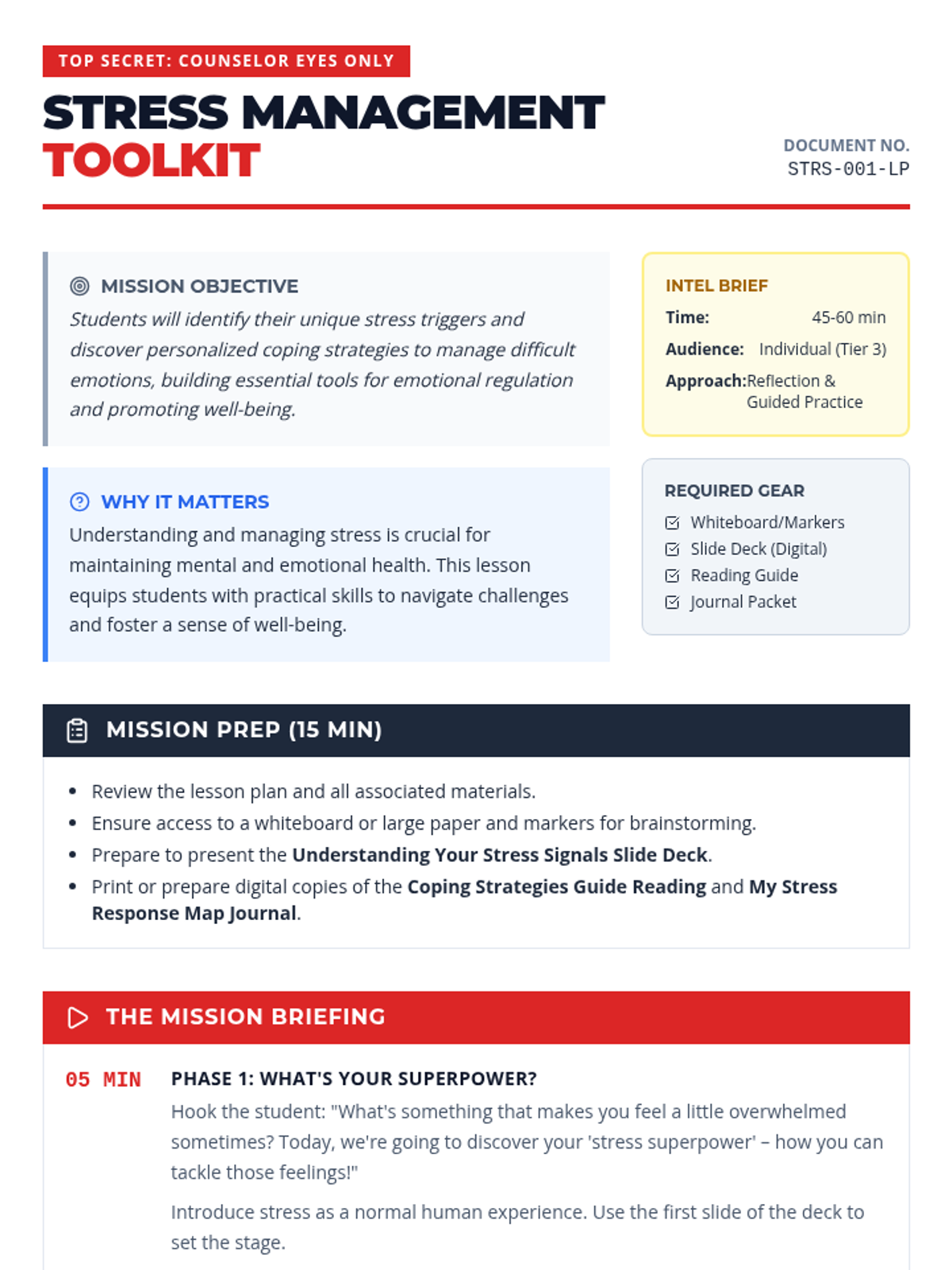 A Tier 3 individual lesson designed to help students identify their stress triggers and signals while building a personalized 'superpower' toolkit of coping strategies.