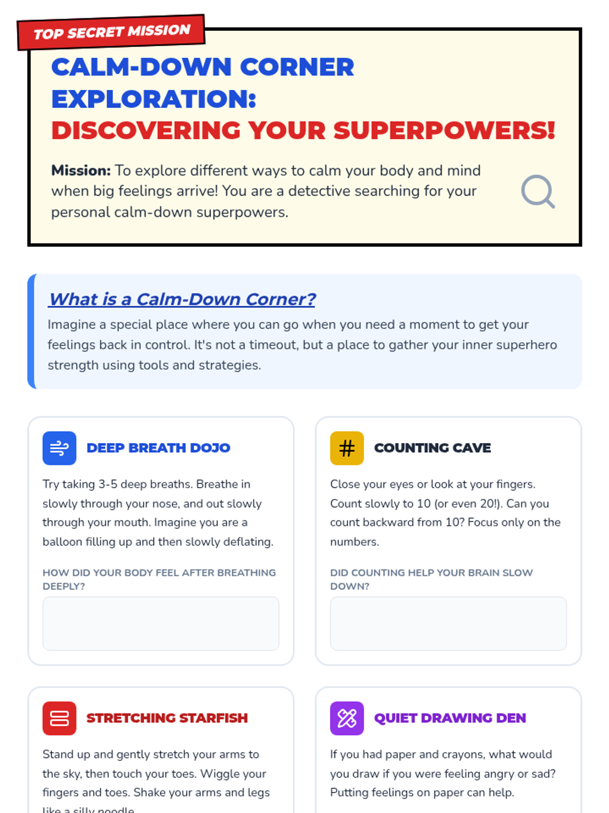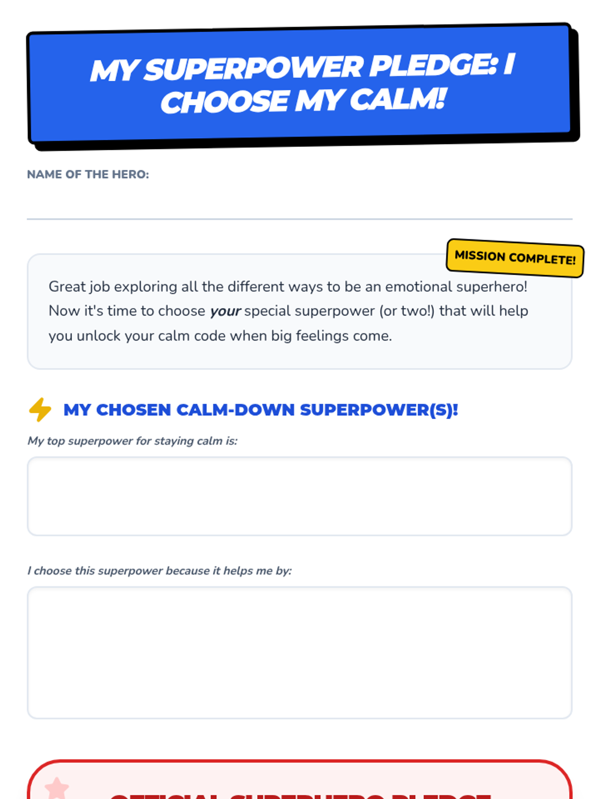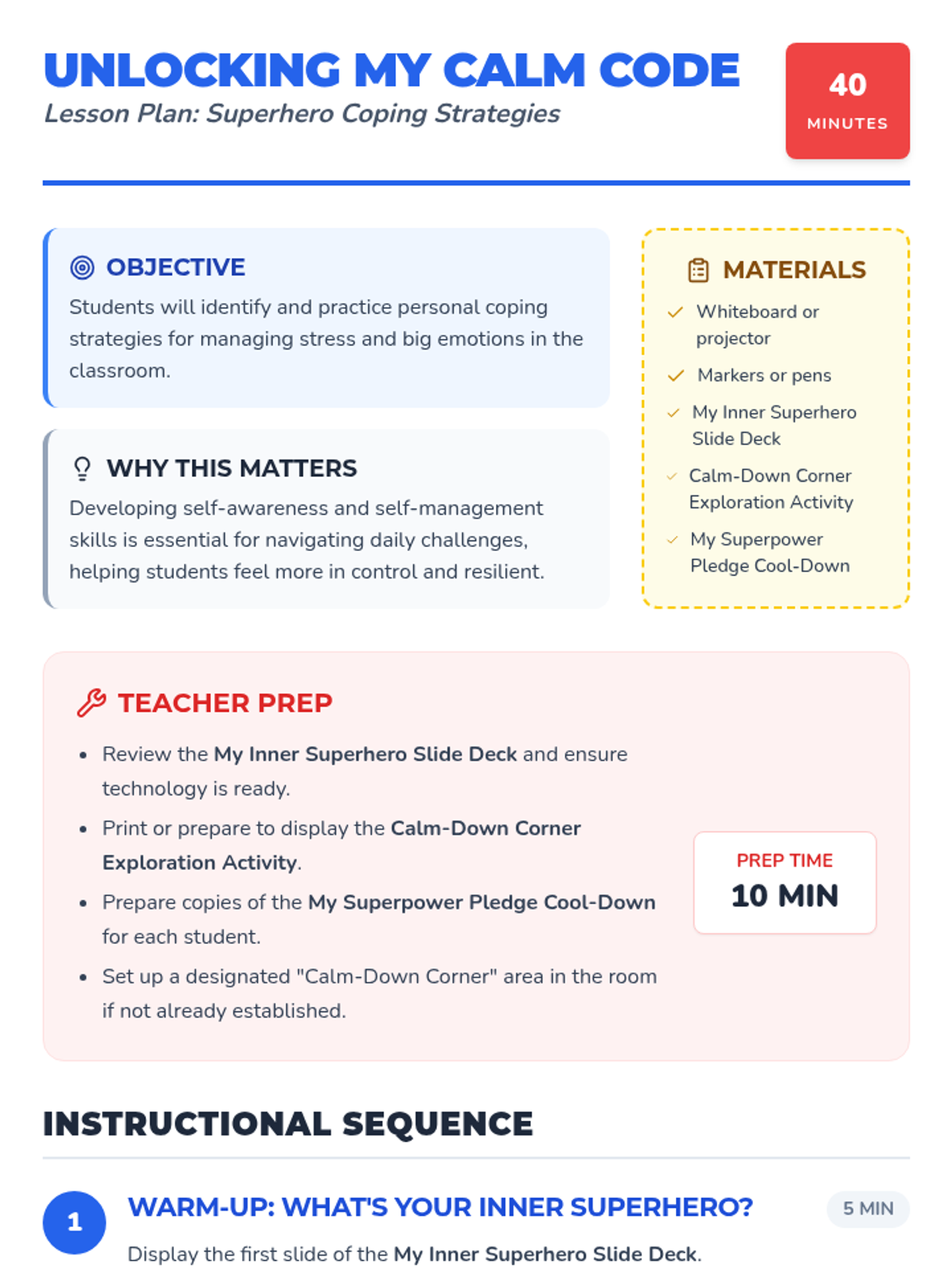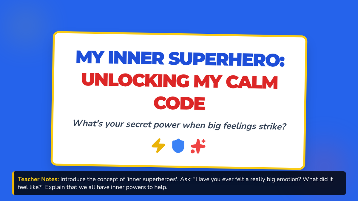 A 40-minute SEL lesson for 3rd graders to identify and practice personal coping strategies using a superhero theme. Students explore various 'calm superpowers' and commit to using them through a personal pledge.