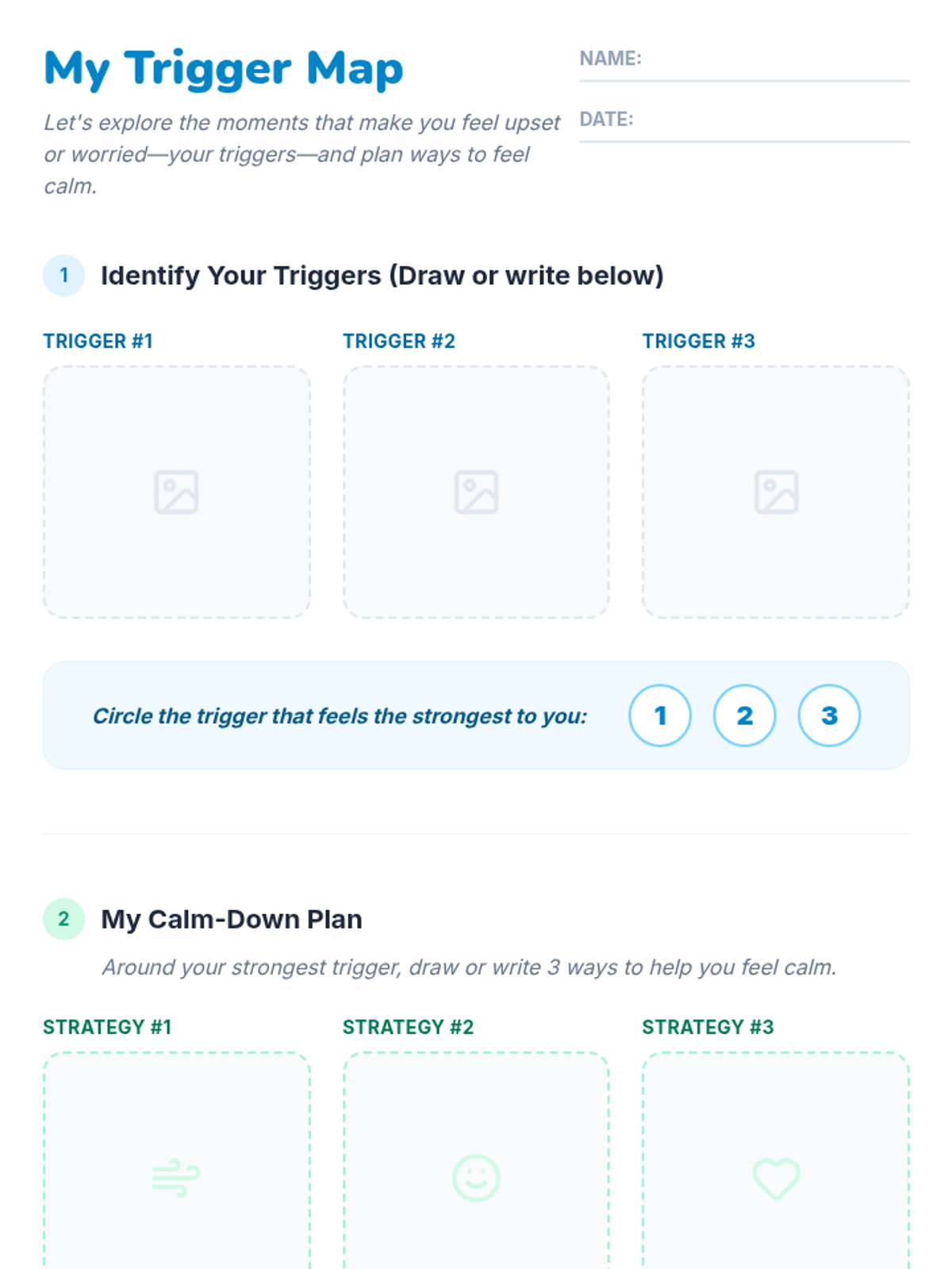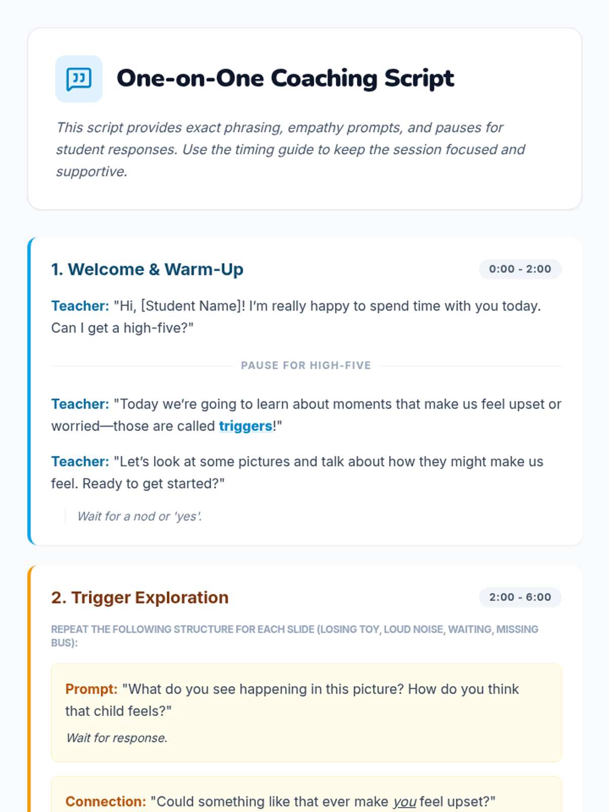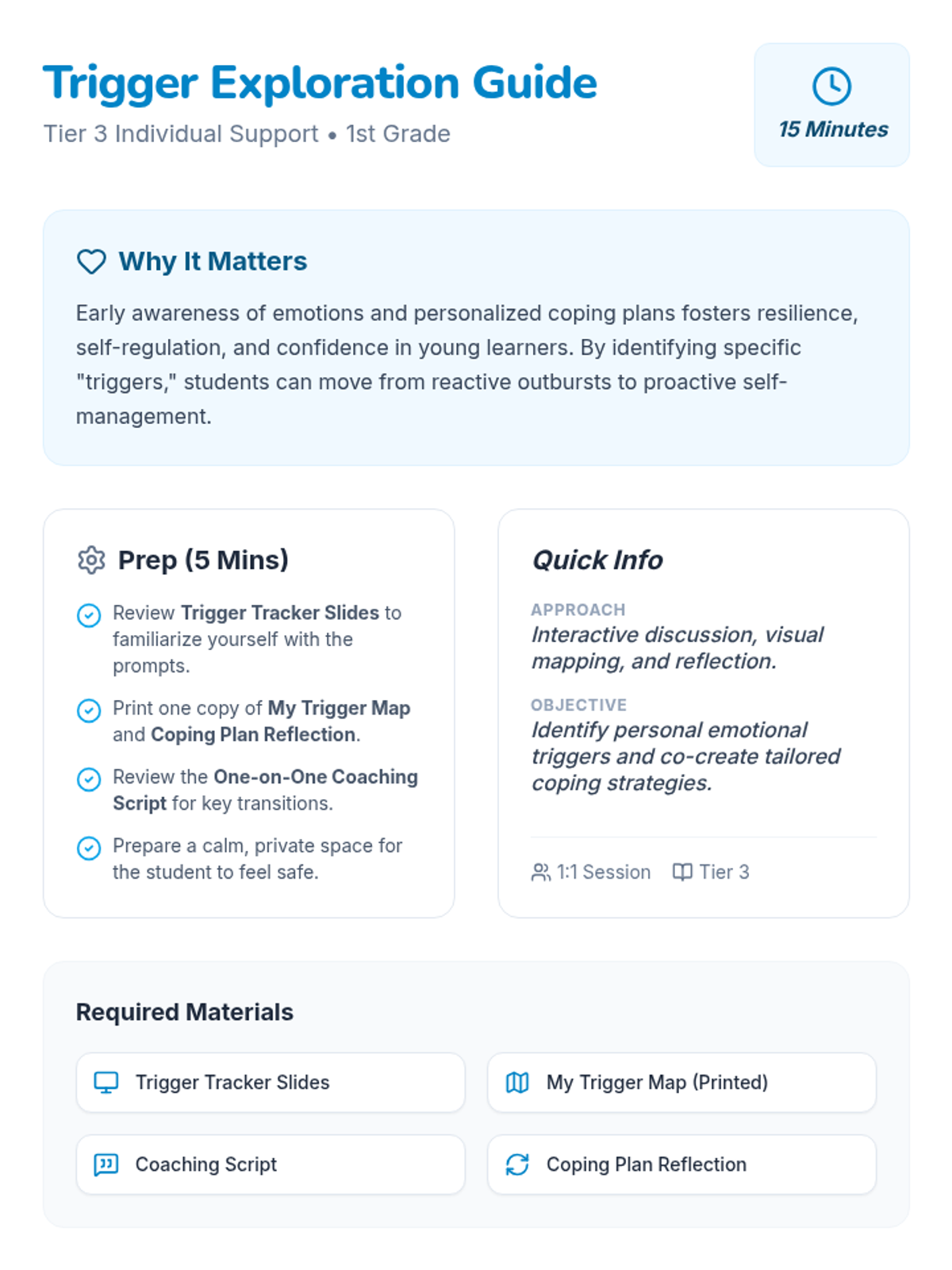 A Tier 3 individual support session for 1st graders to identify personal emotional triggers and develop personalized coping strategies. This 15-minute session uses interactive slides, a visual mapping activity, and a coaching script to build emotional resilience.