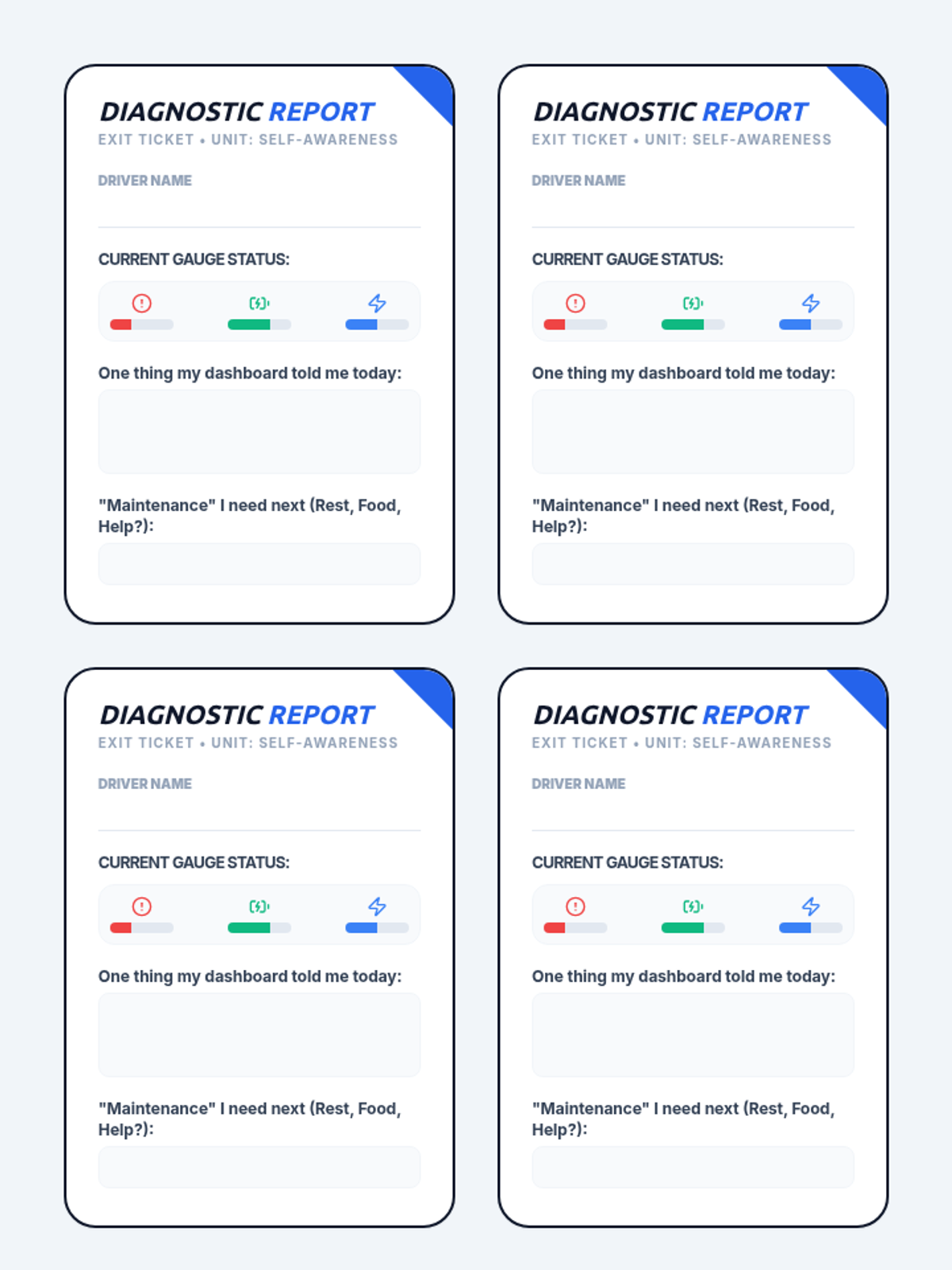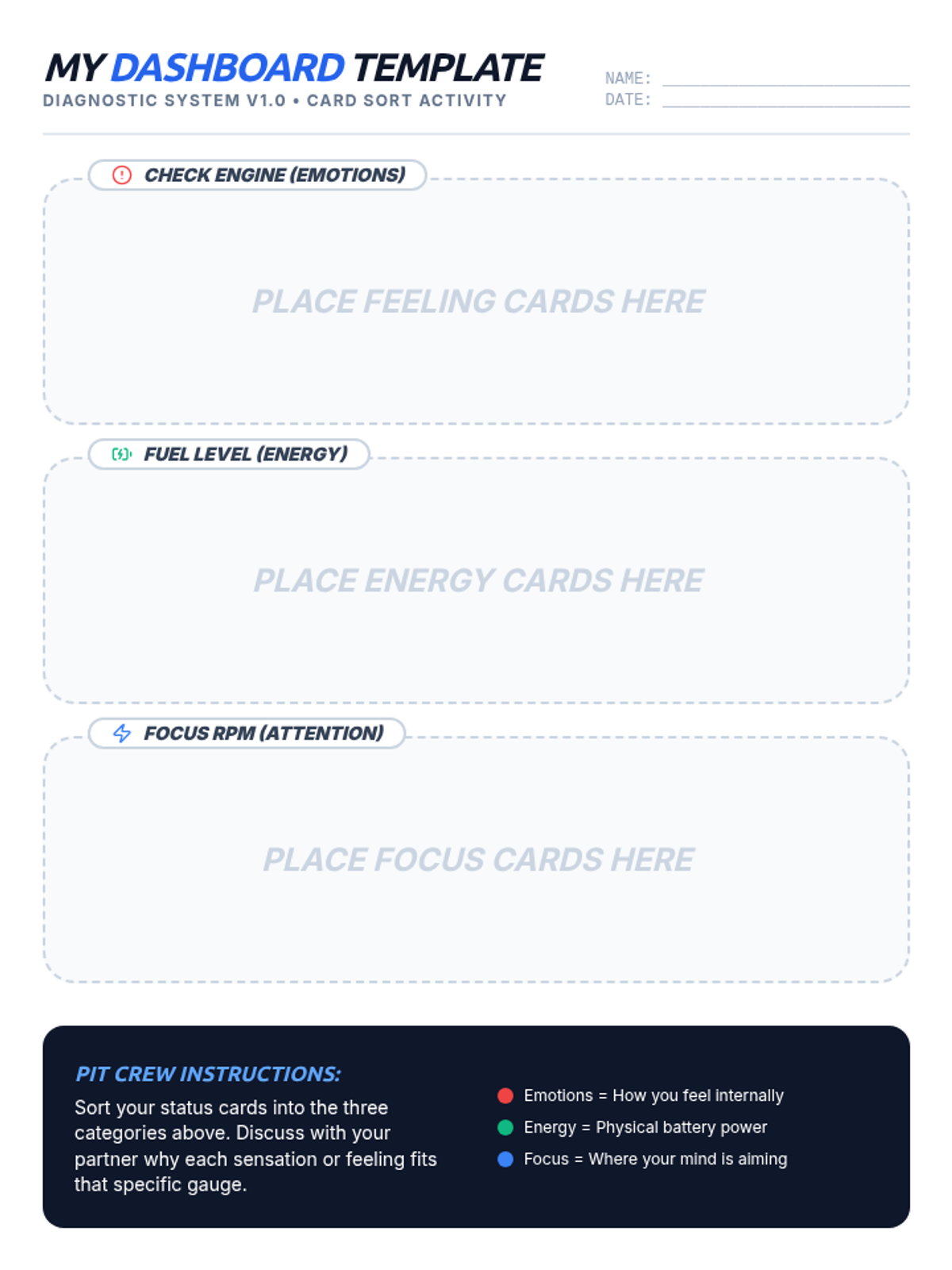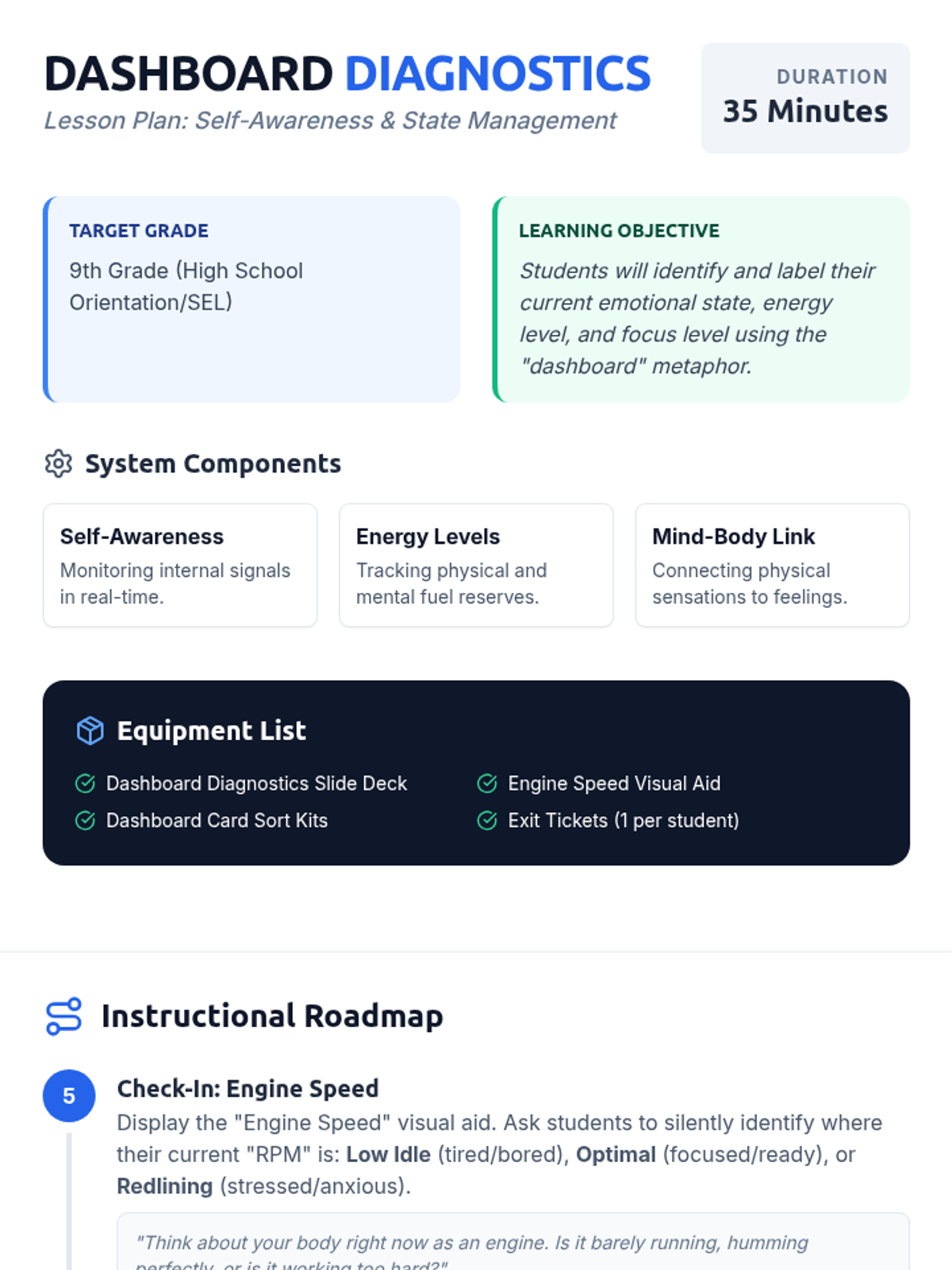 A 35-minute introductory lesson for 9th graders using an automotive dashboard metaphor to help students identify their emotional state, energy levels, and focus. Students will explore how to read their internal 'gauges' to better manage their academic and social day.