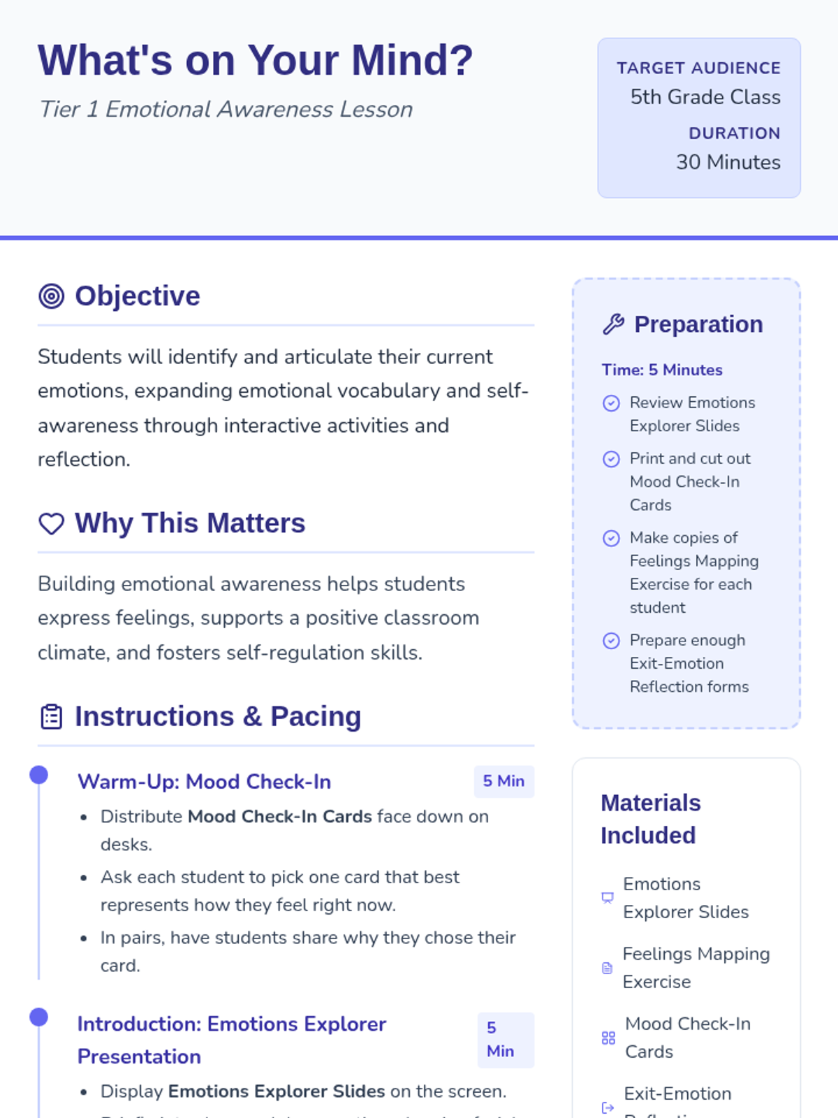 An interactive single-session lesson where 5th graders identify and articulate their emotions, fostering a supportive classroom climate and emotional awareness.