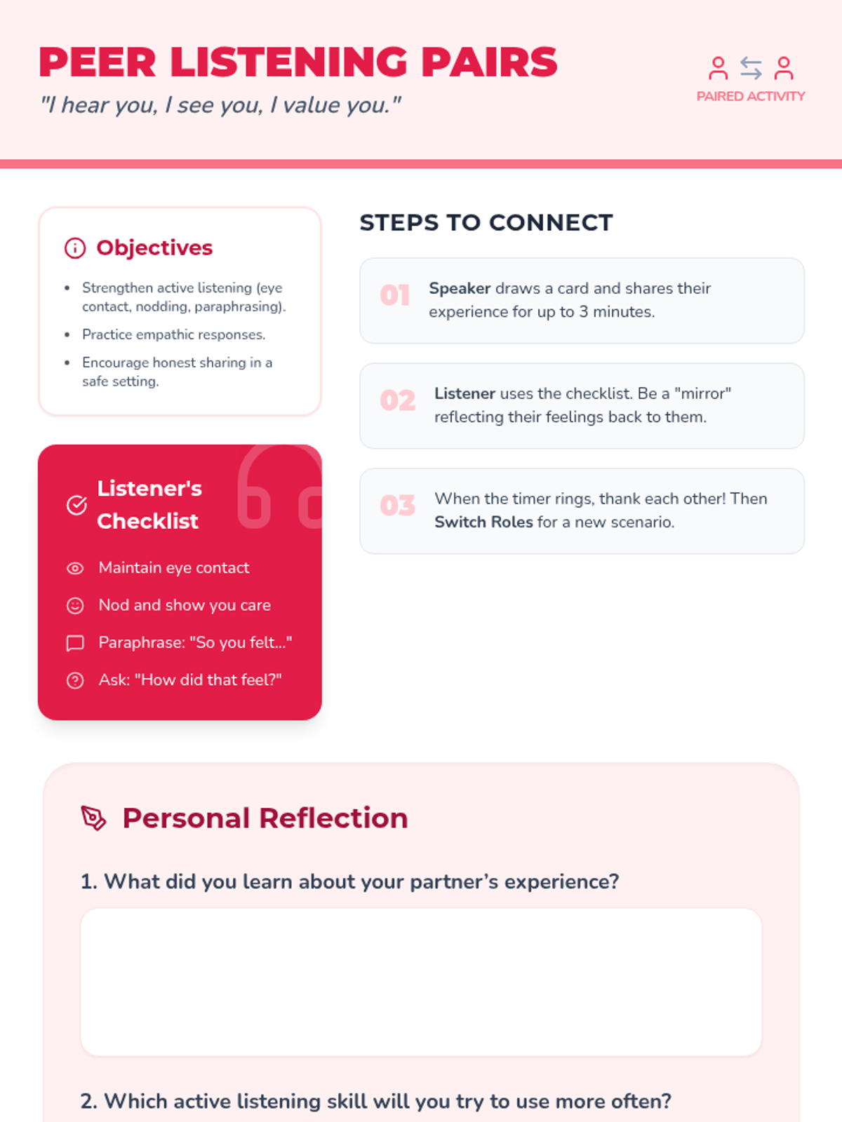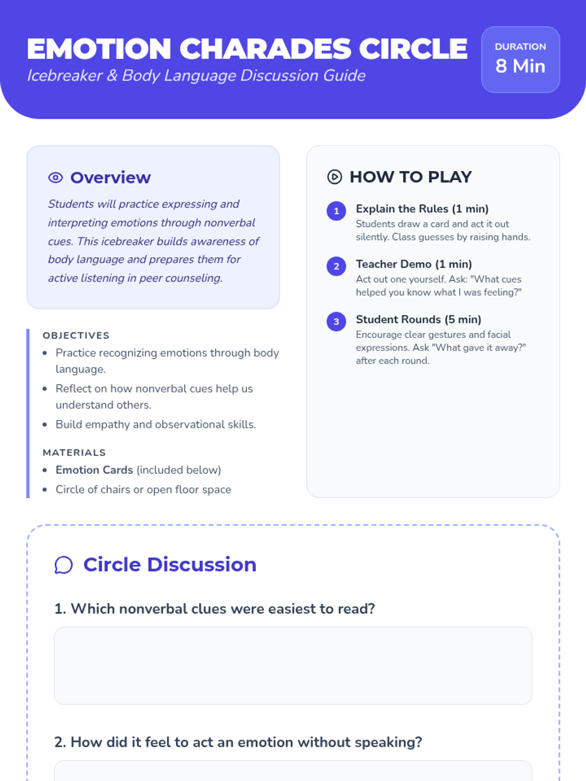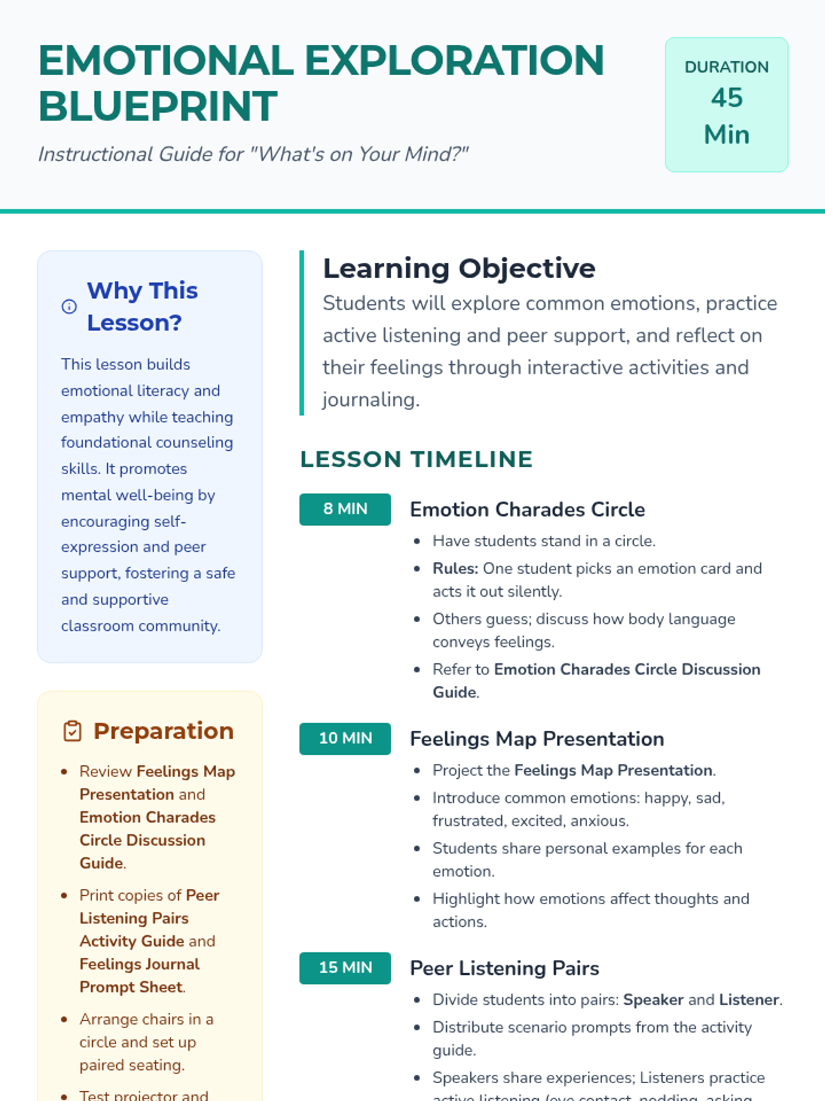 An interactive 45-minute session for 5th graders to explore common emotions, practice basic counseling techniques, and build empathy through discussion and paired activities.