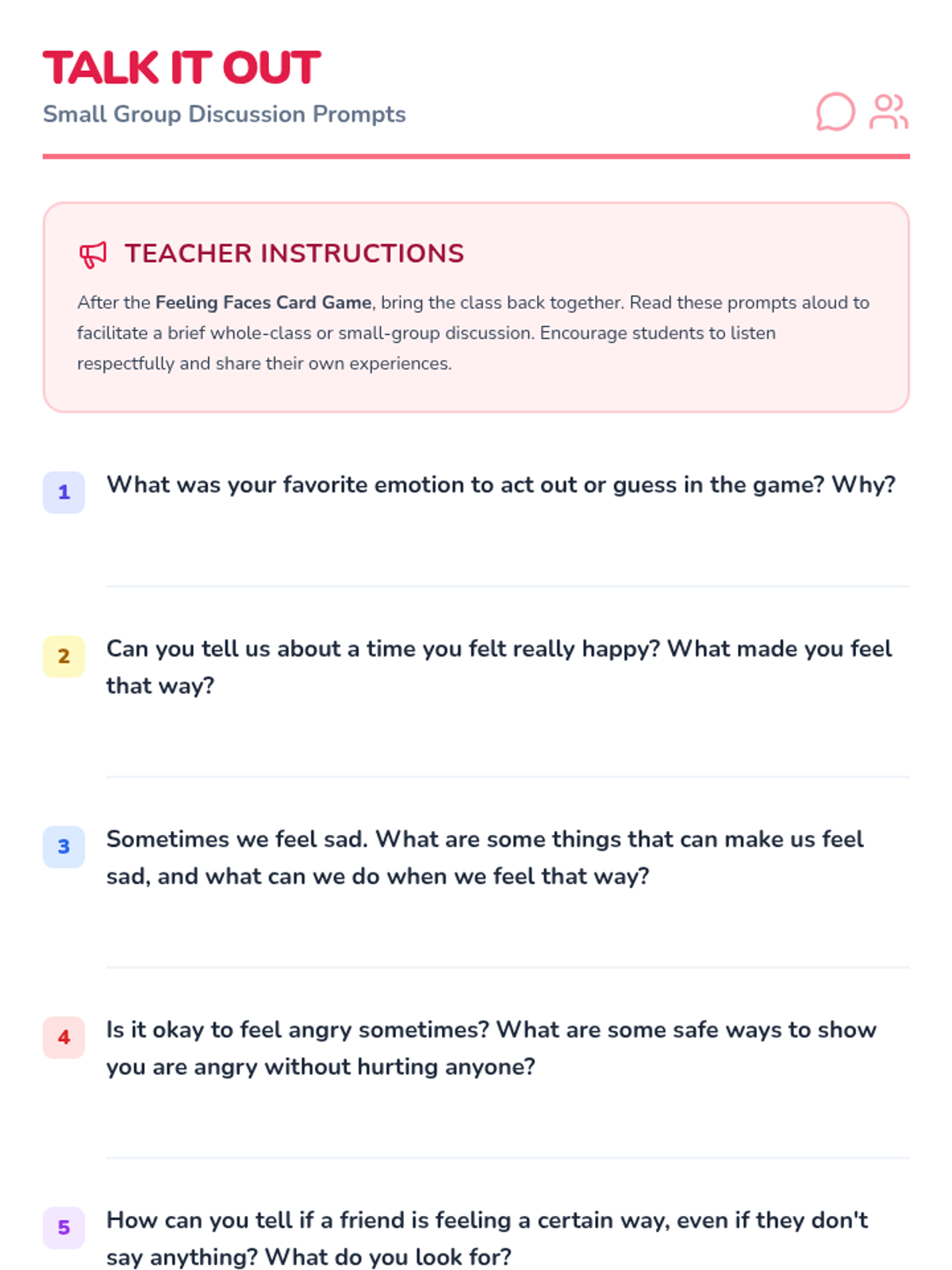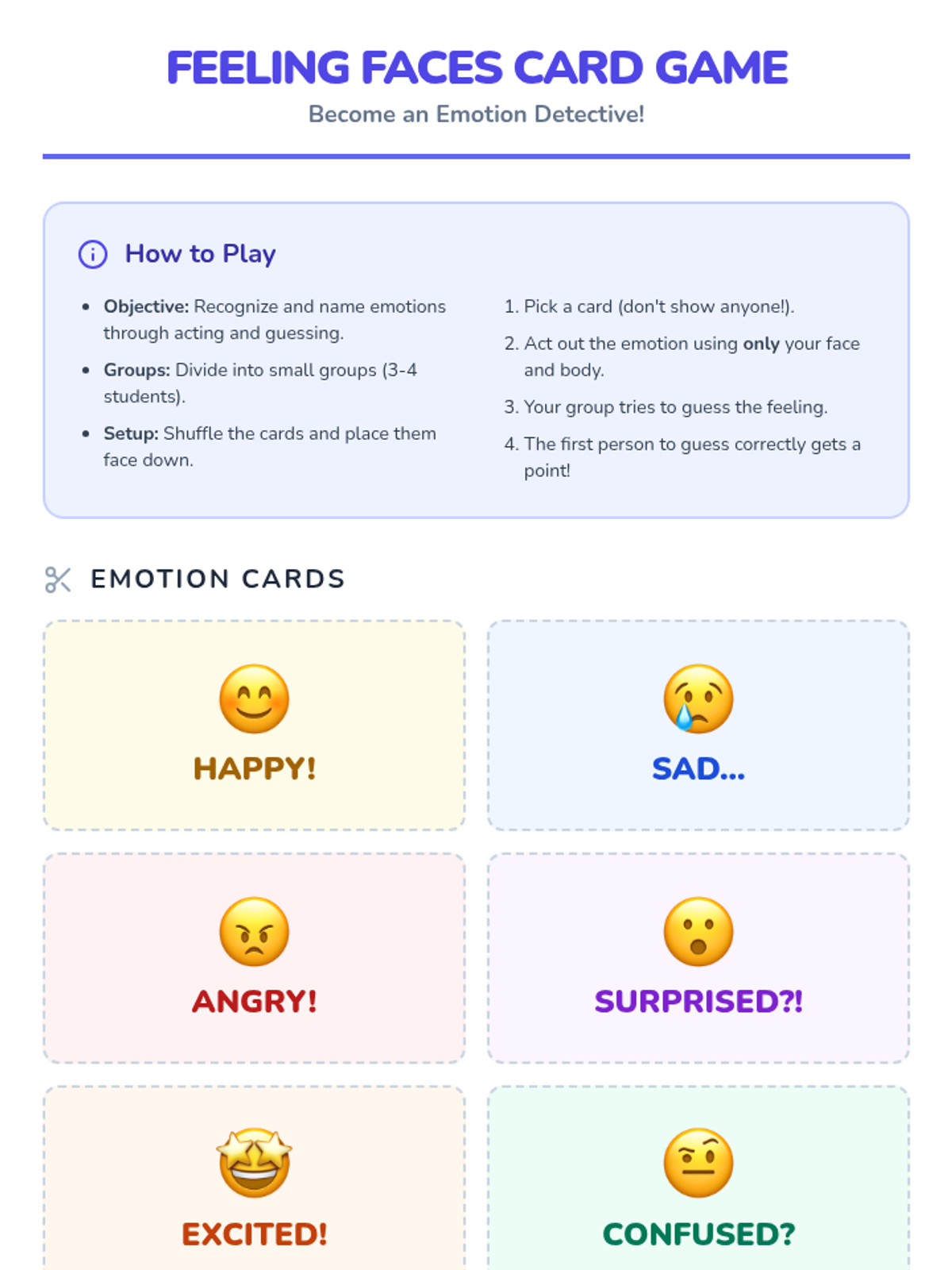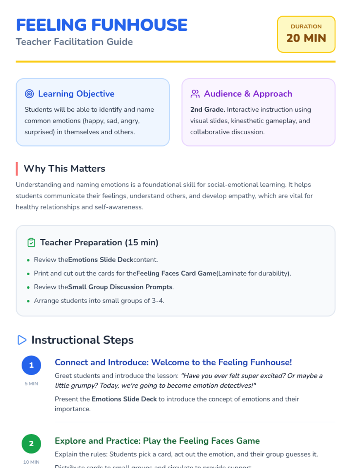 A foundational social-emotional learning lesson for 2nd graders to identify and name common emotions using interactive slides, a card game, and guided discussion.