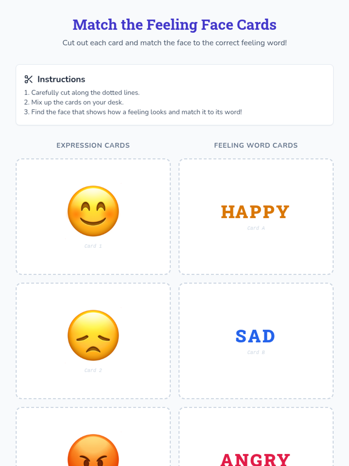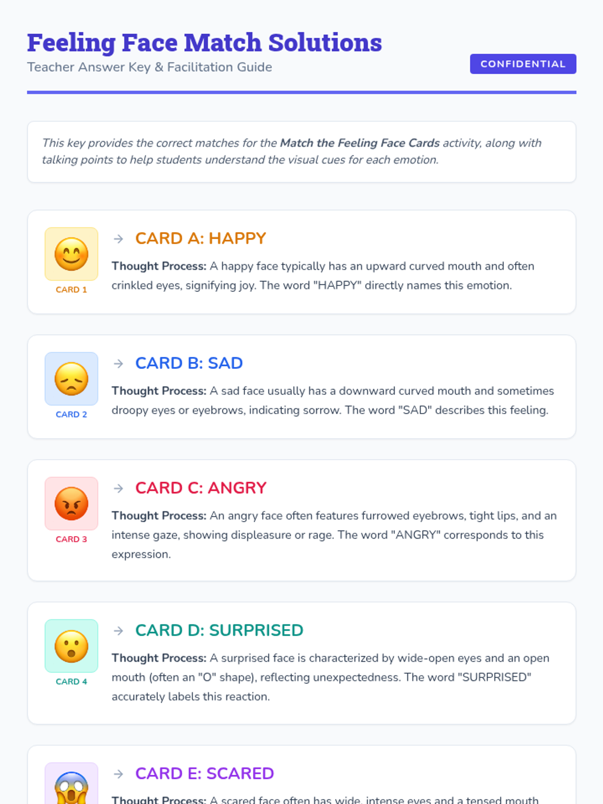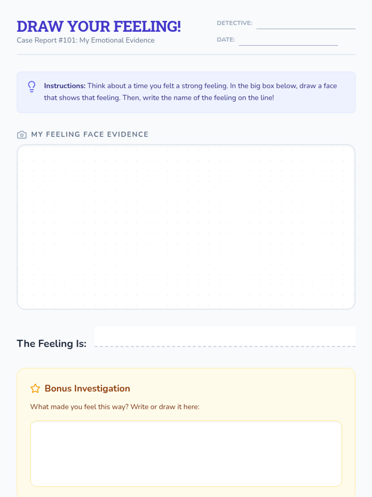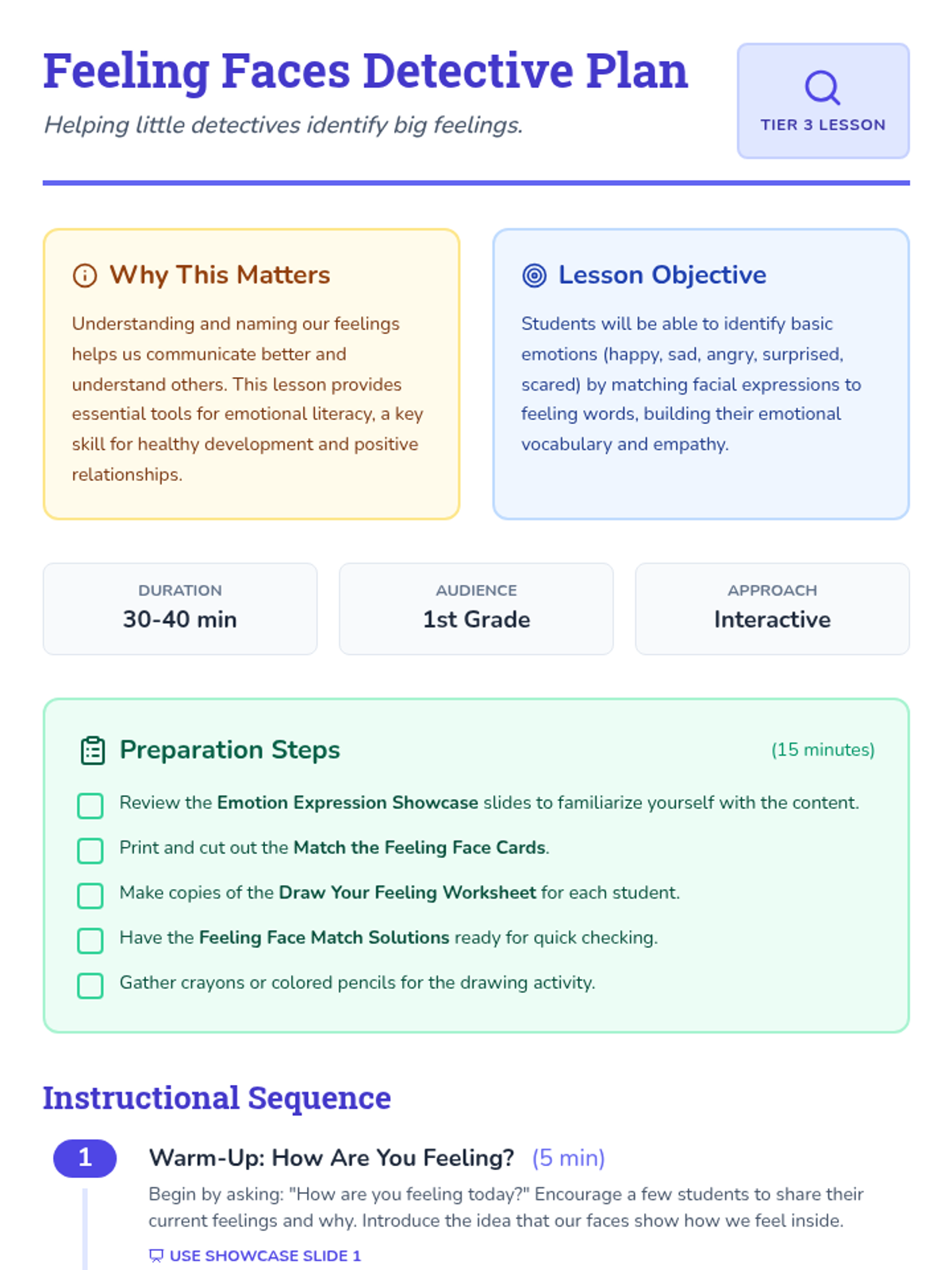 A Tier 3 intervention lesson designed for 1st-grade students to identify and name basic emotions (happy, sad, angry, surprised, scared) through facial expressions, building foundational emotional literacy and empathy.