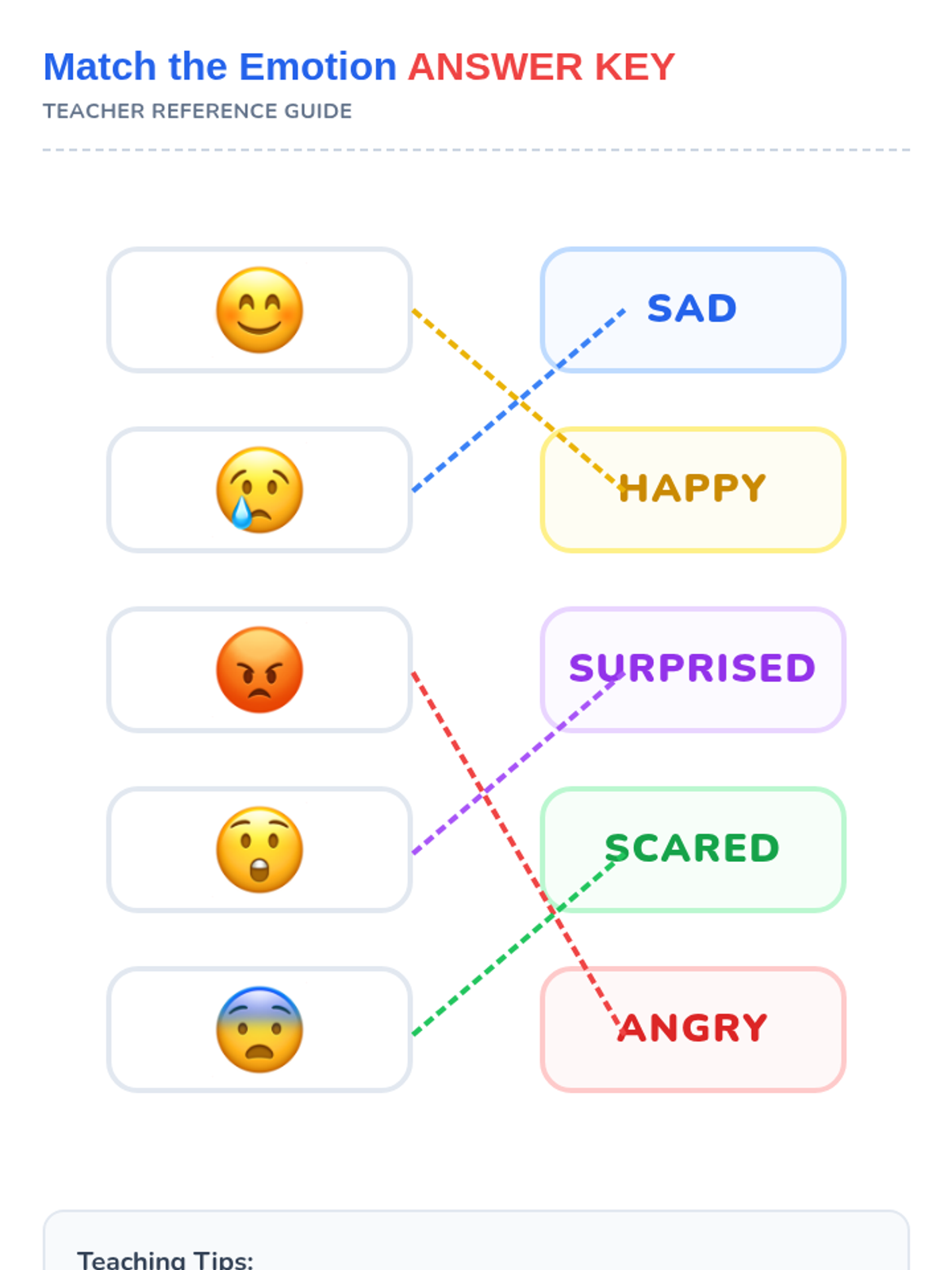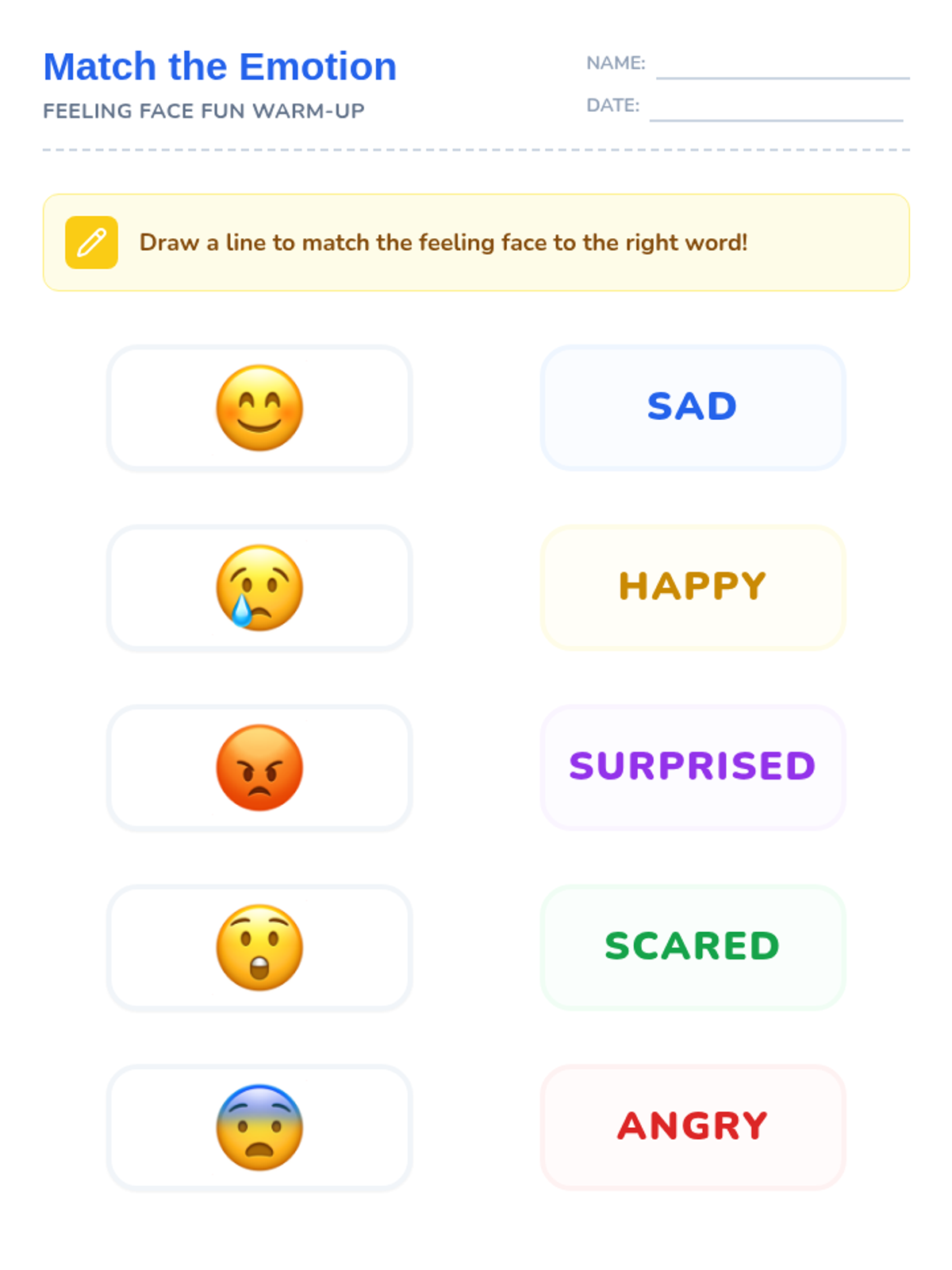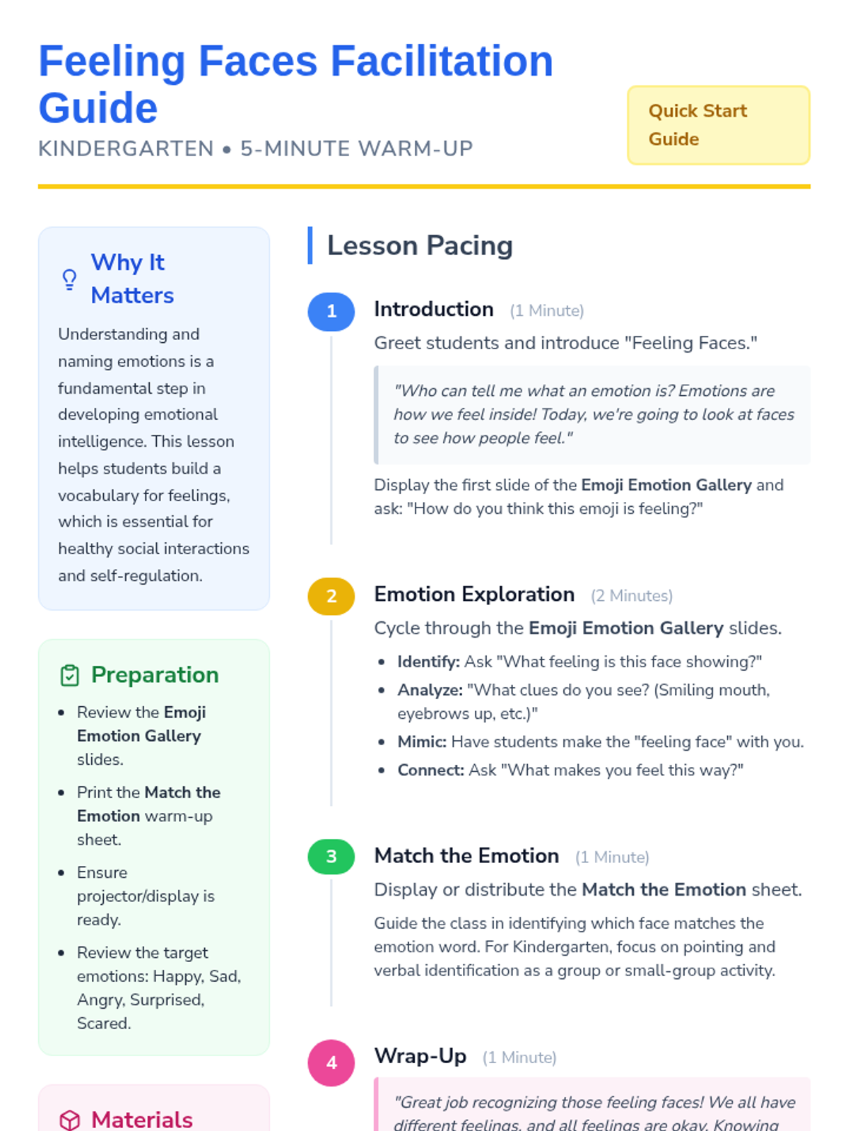 A 5-minute warm-up for Kindergarten students to identify and name core emotions through facial expressions, fostering emotional literacy and empathy.