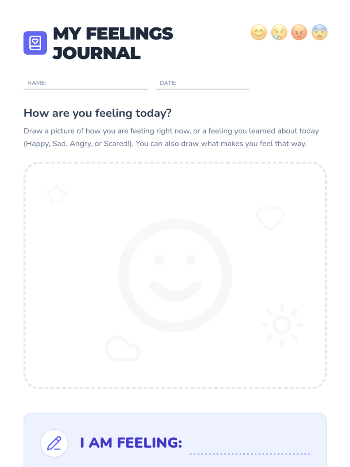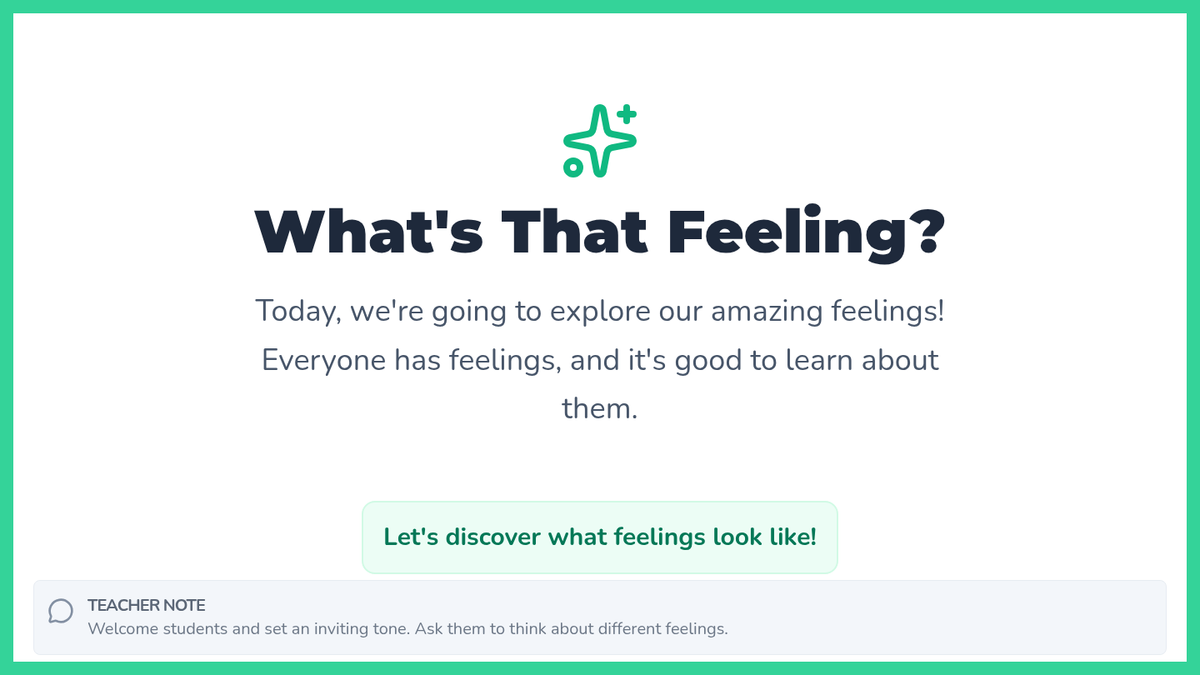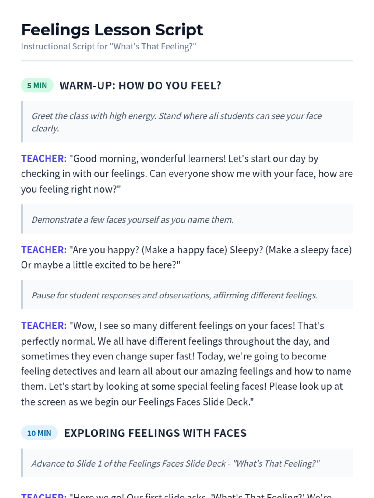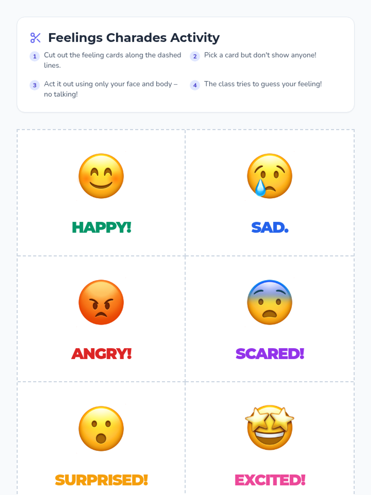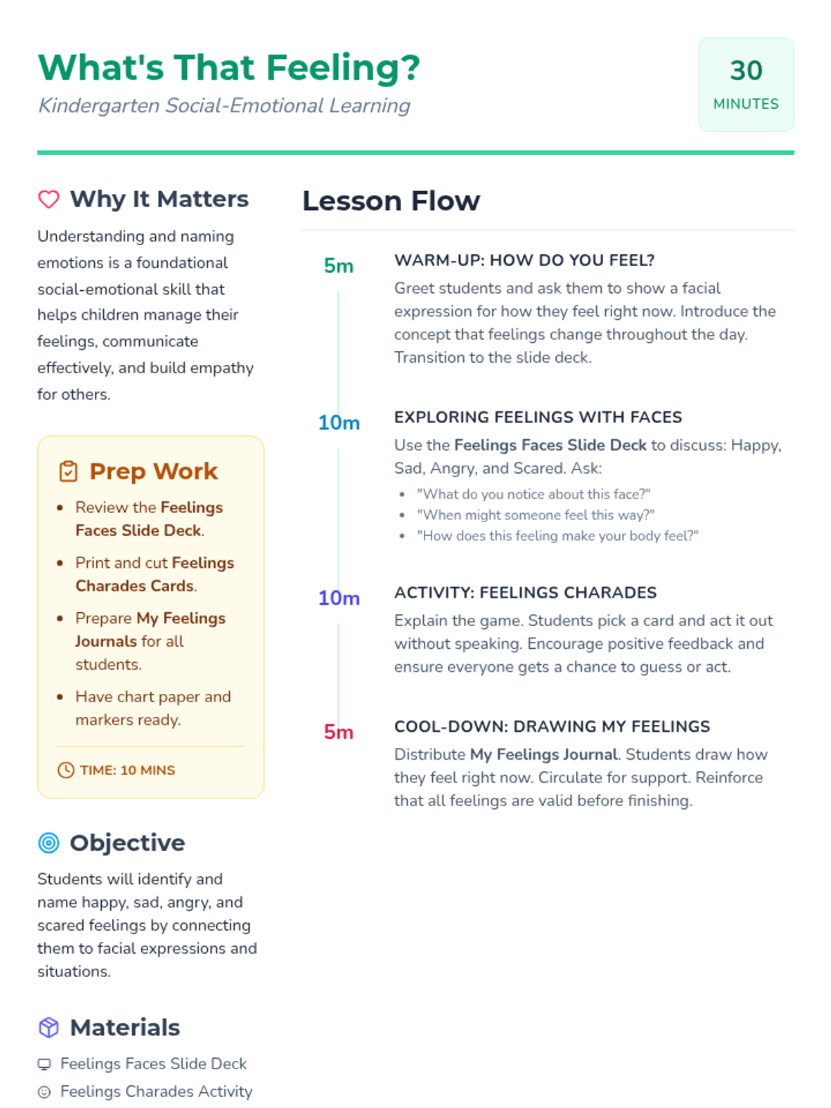 A 30-minute Kindergarten lesson introducing four core emotions (happy, sad, angry, scared) through visual aids, interactive charades, and personal reflection. Students will learn to recognize facial expressions and verbalize their own feelings.