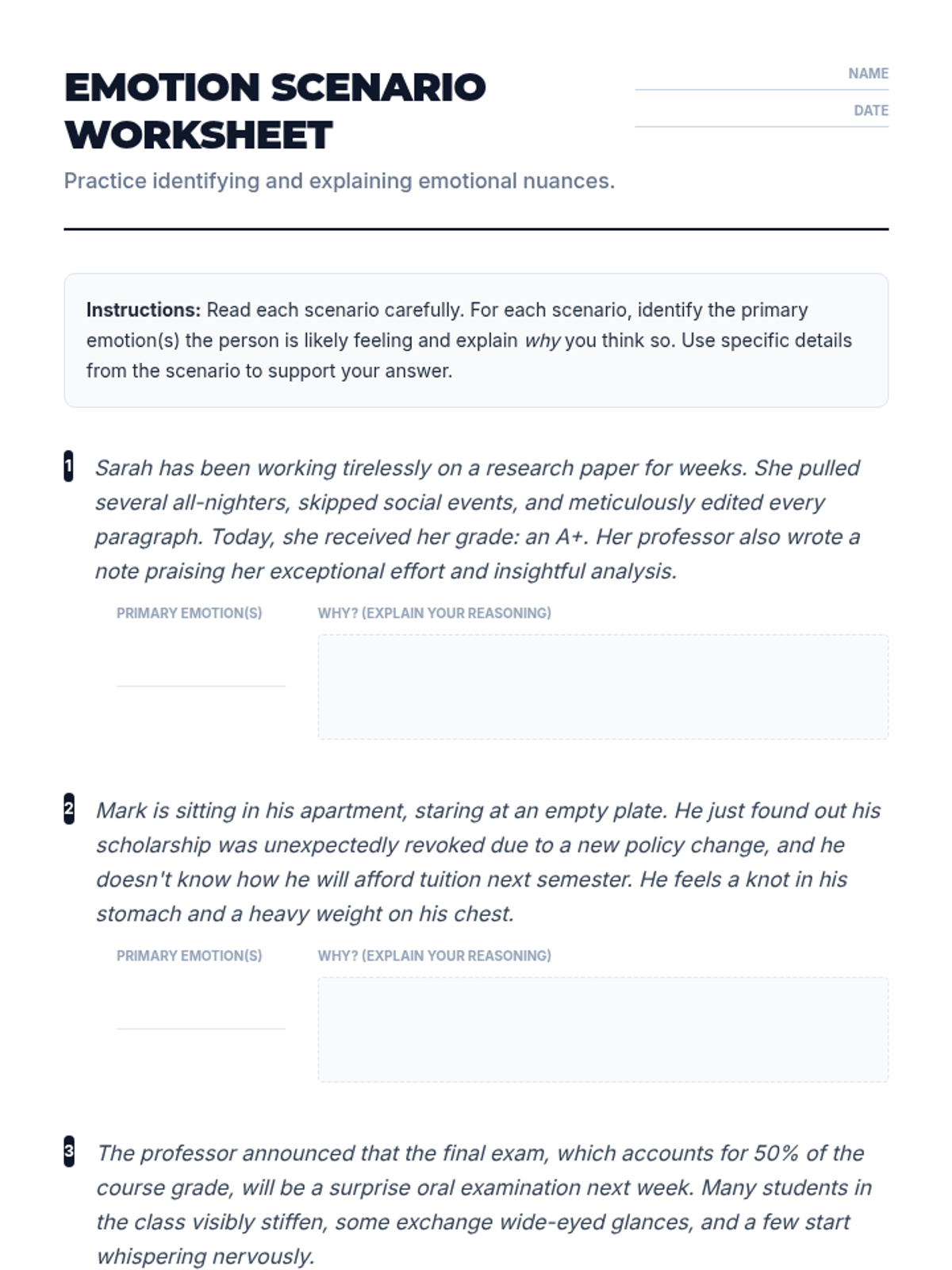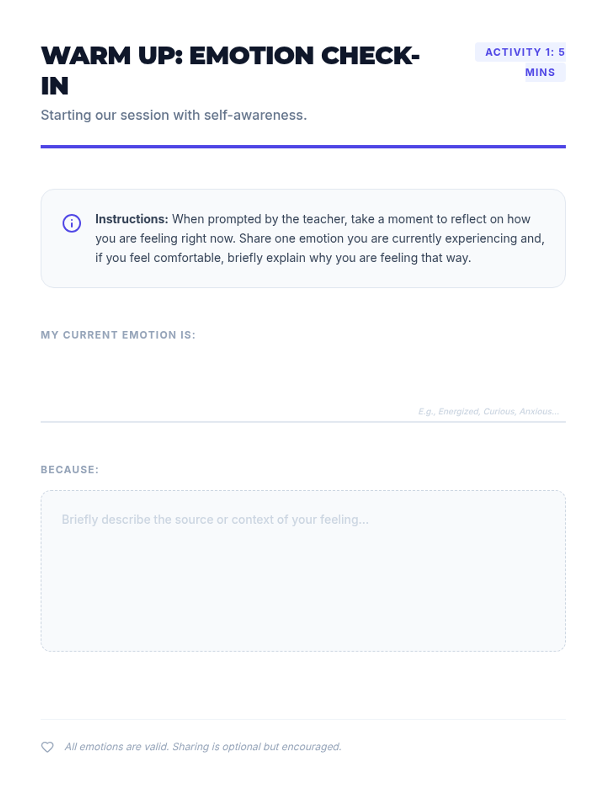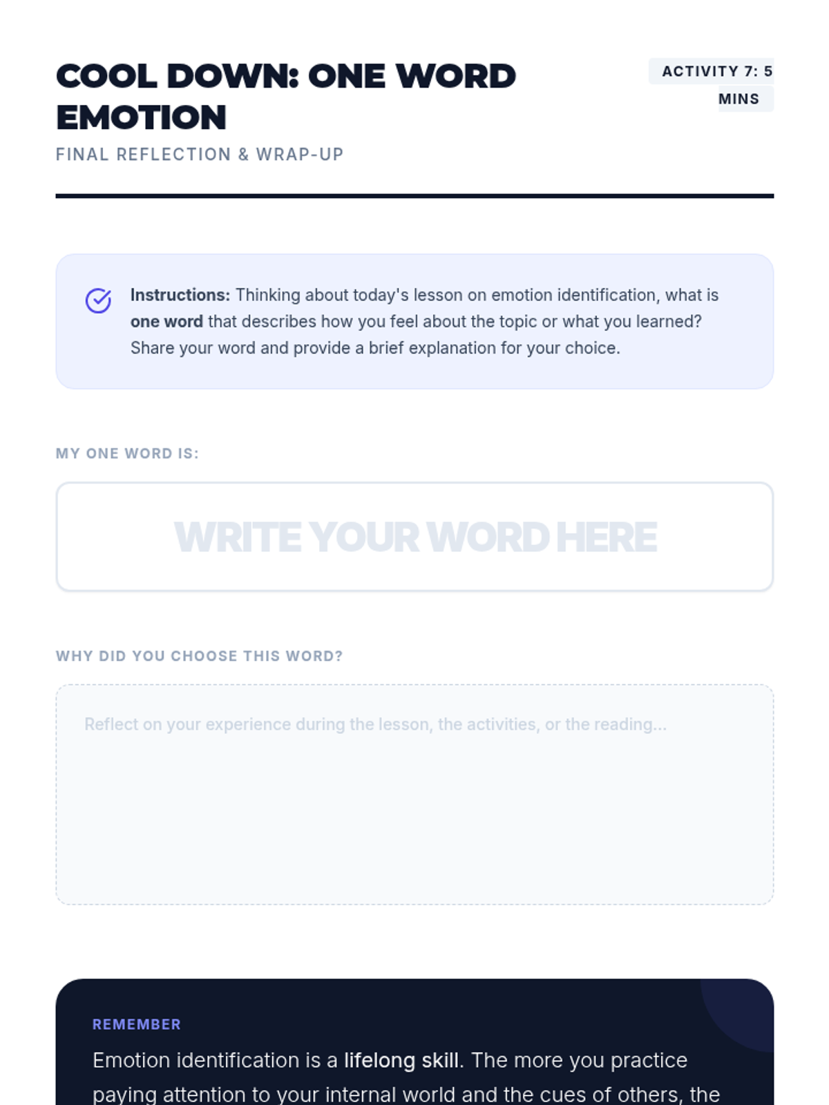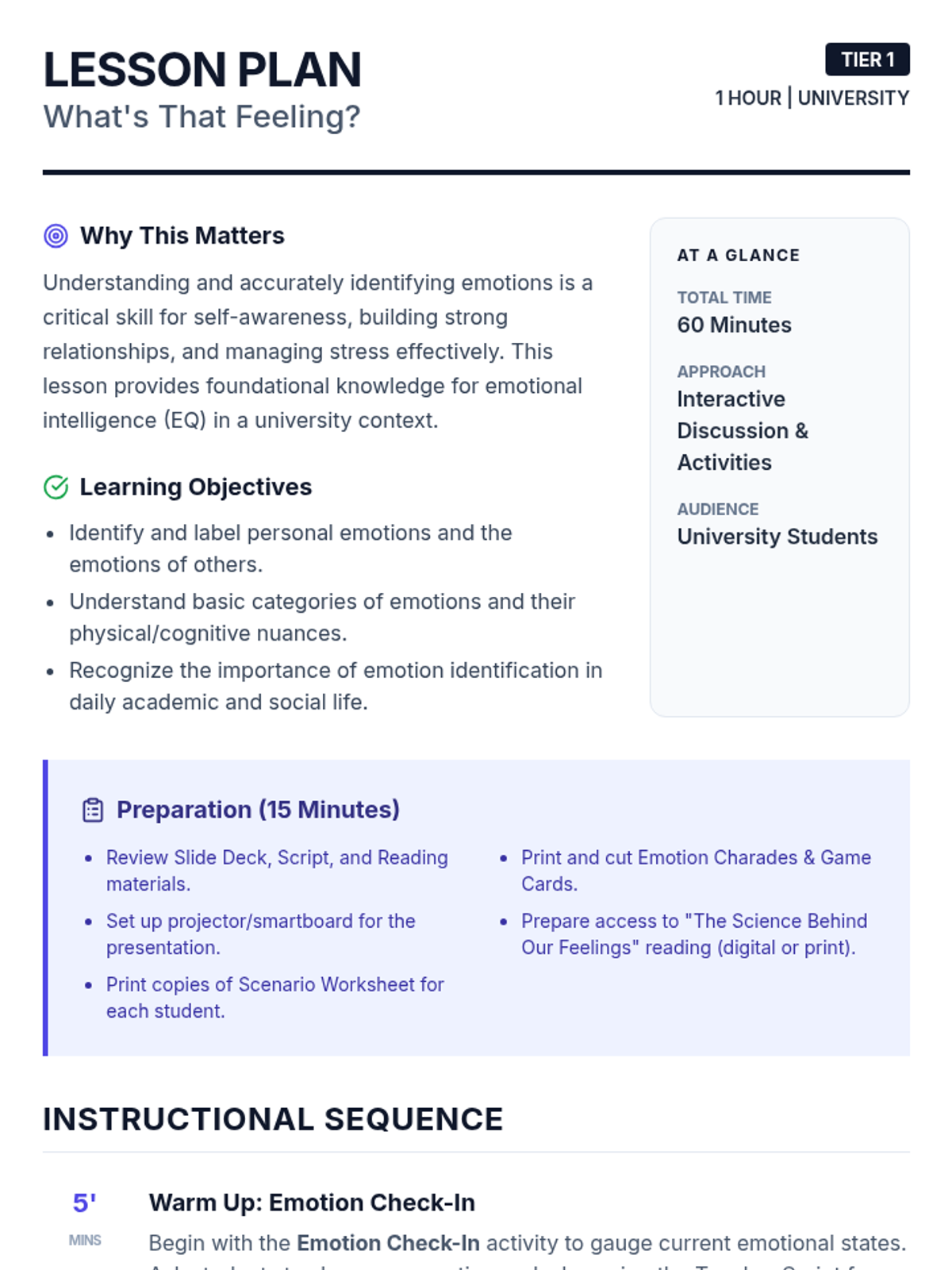A one-hour lesson for university students focused on recognizing and understanding emotions in themselves and others, foundational for emotional intelligence.